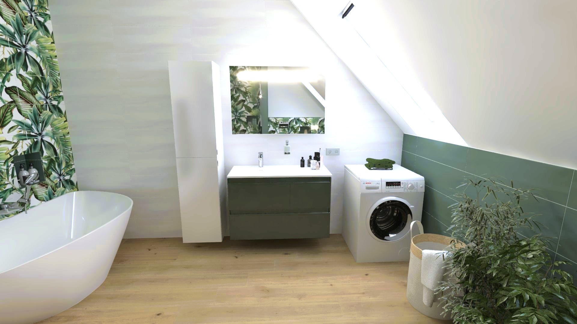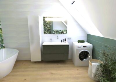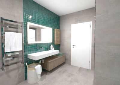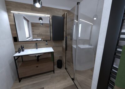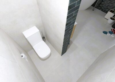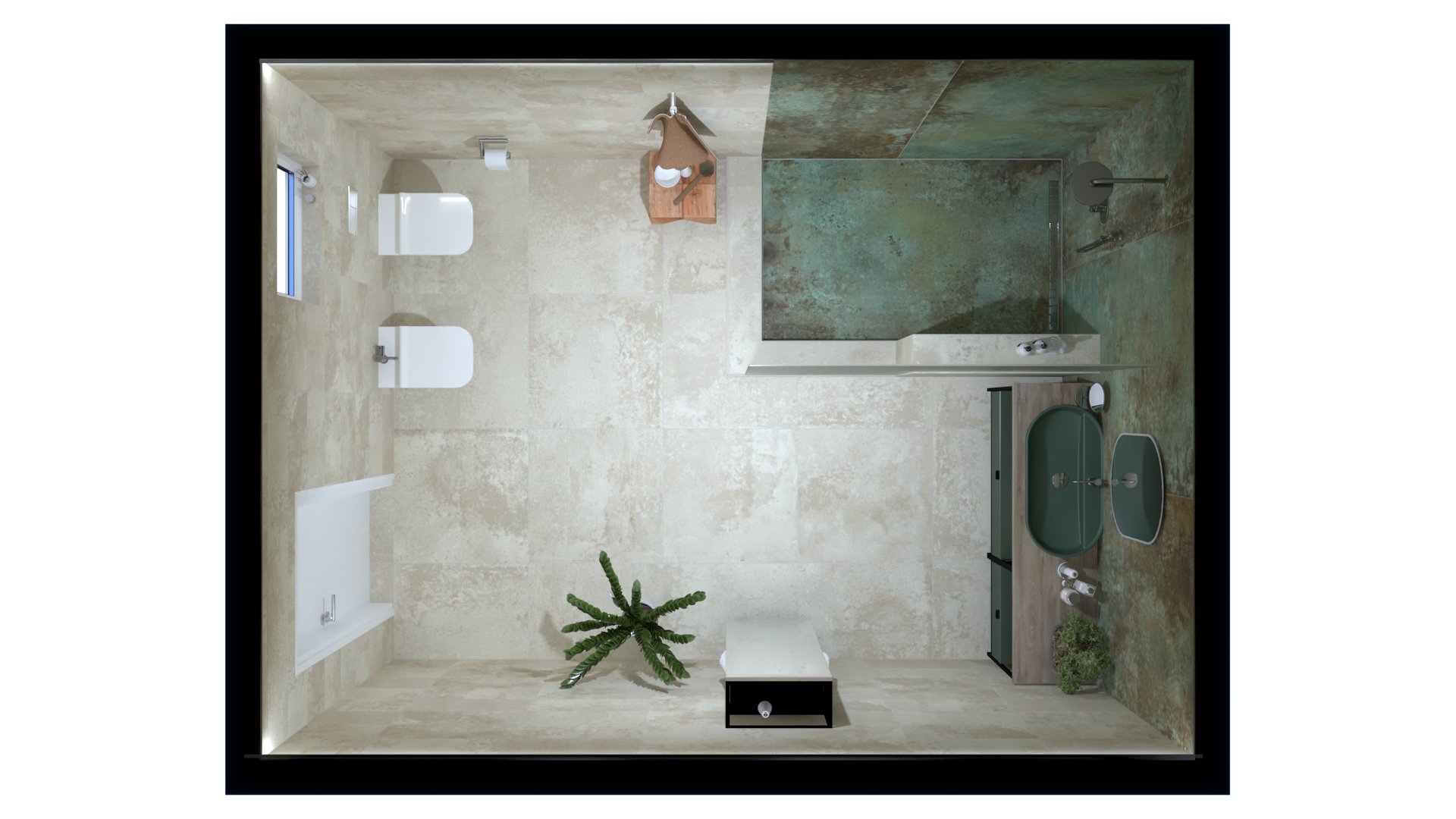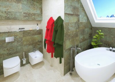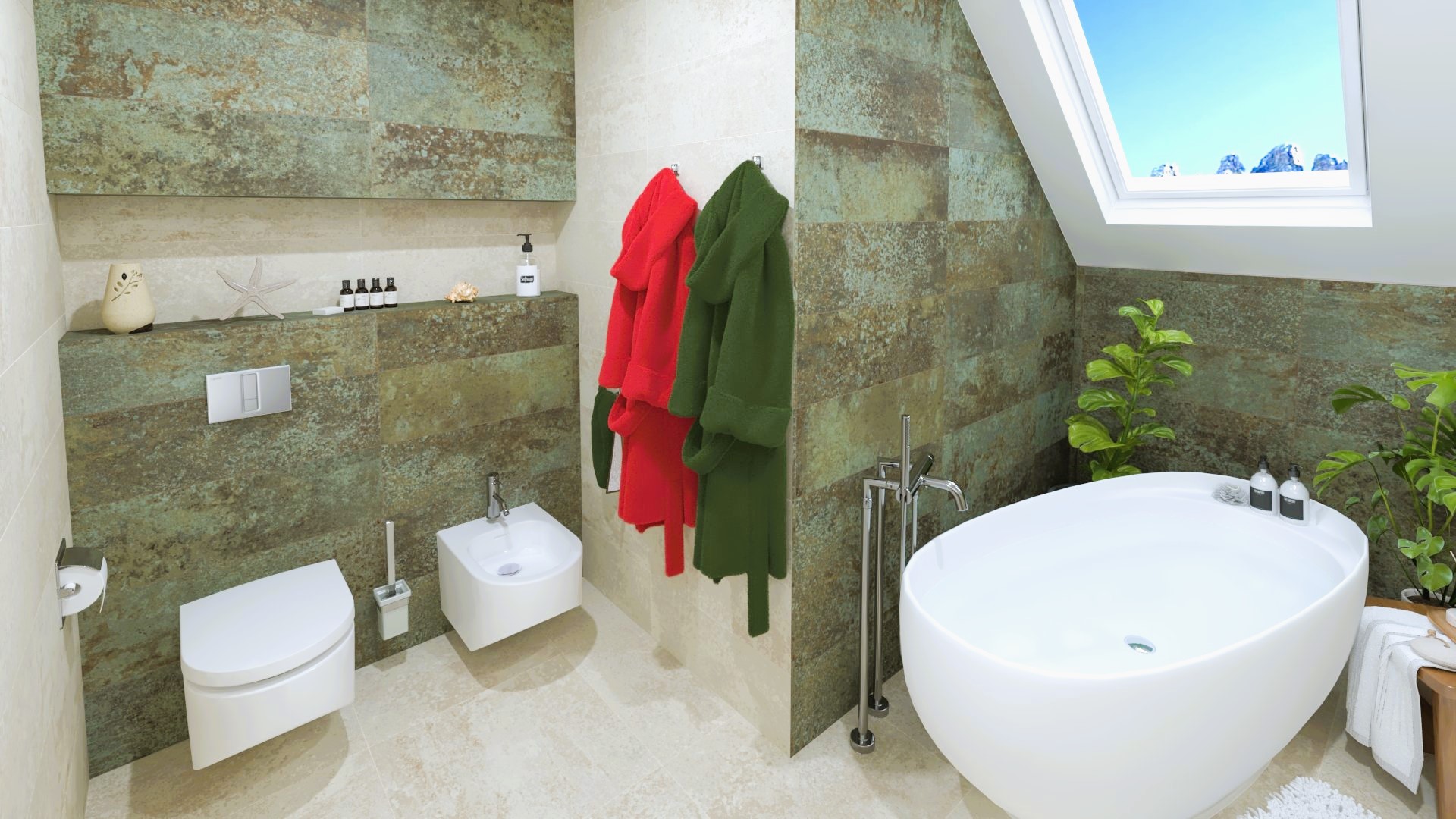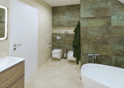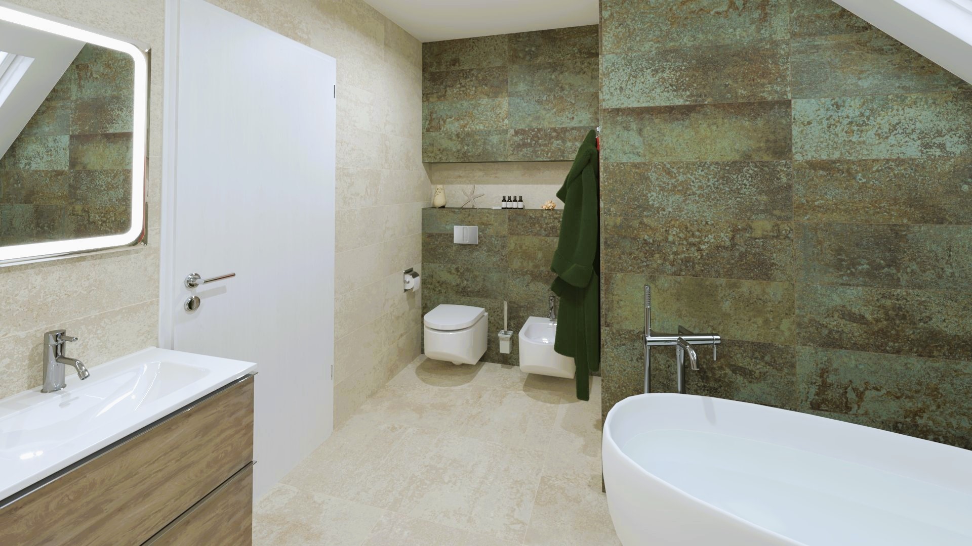 Burkolat rendelésre: Zöld Atlas Concorde Boost Wall 80×40 cm; fahatás készletről Atlas Concorde Log Icon 20×120 cm; kád rendelésre: Arezzo Silk Glow 170×86 cm térben álló kád; csaptelepek rendelésre: Arezzo Cubefield család fekete; WC + bidé rendelésre: Arezzo Ohio család; tartály készletről: Geberit Duofix+ Sigma nyomógomb fekete