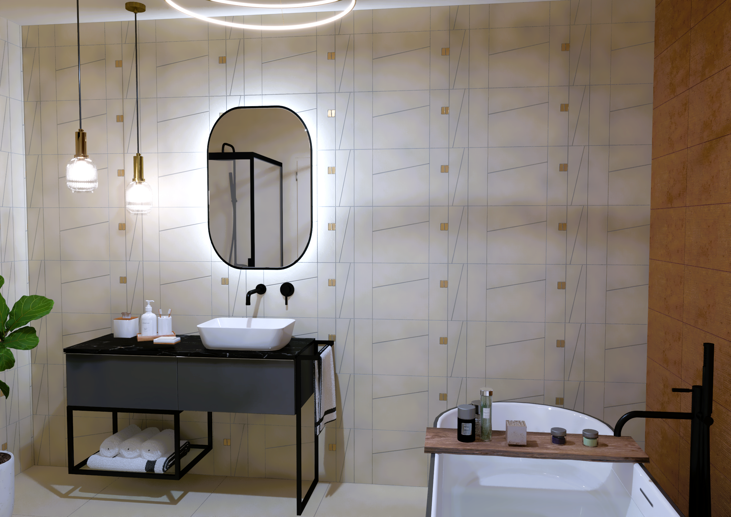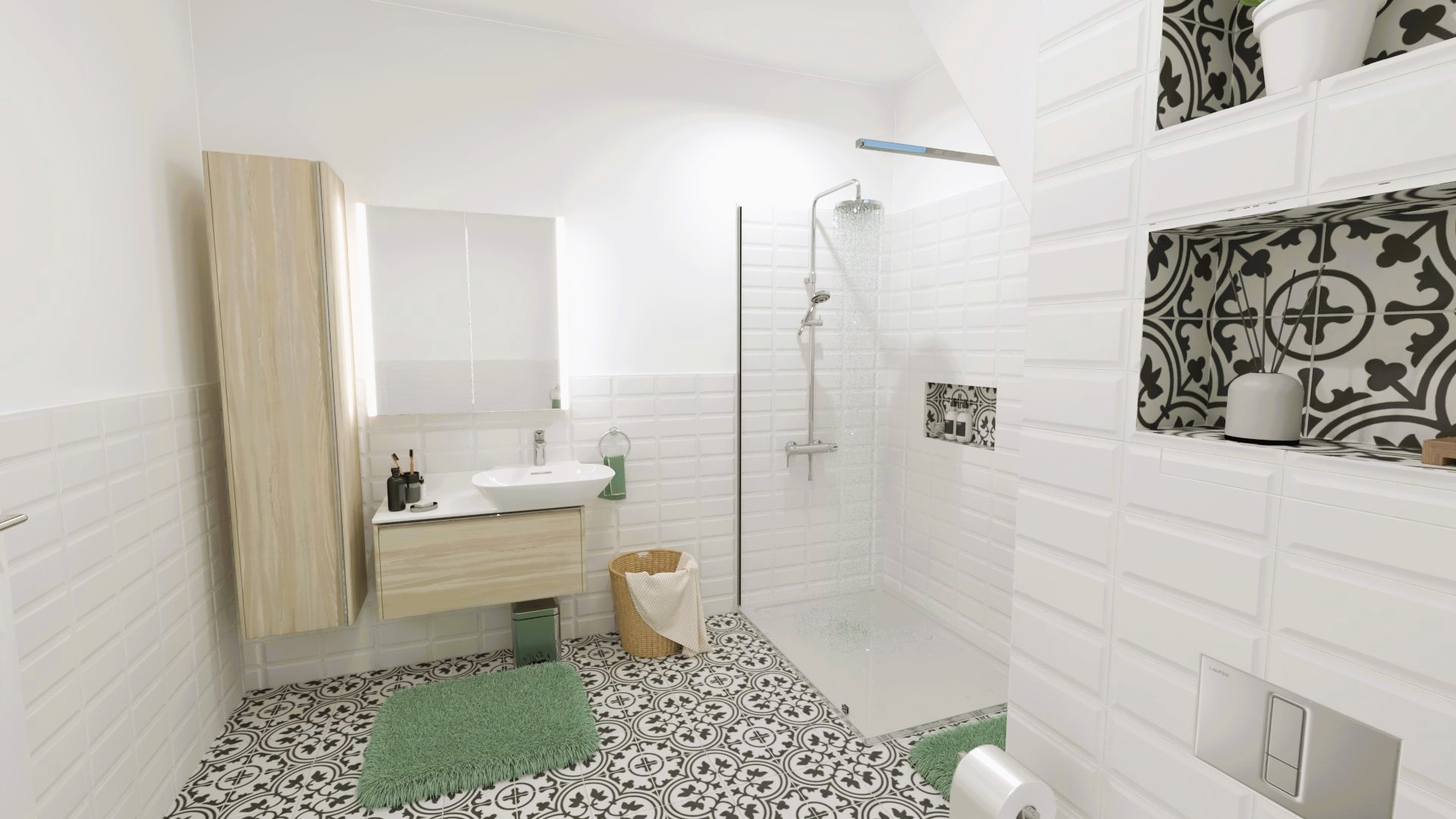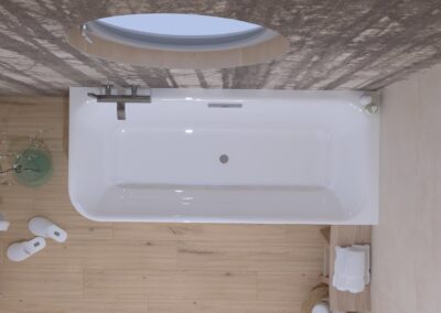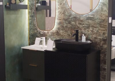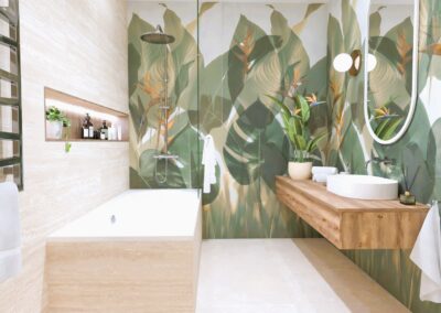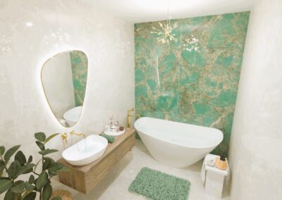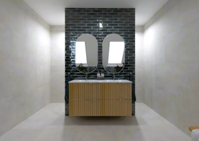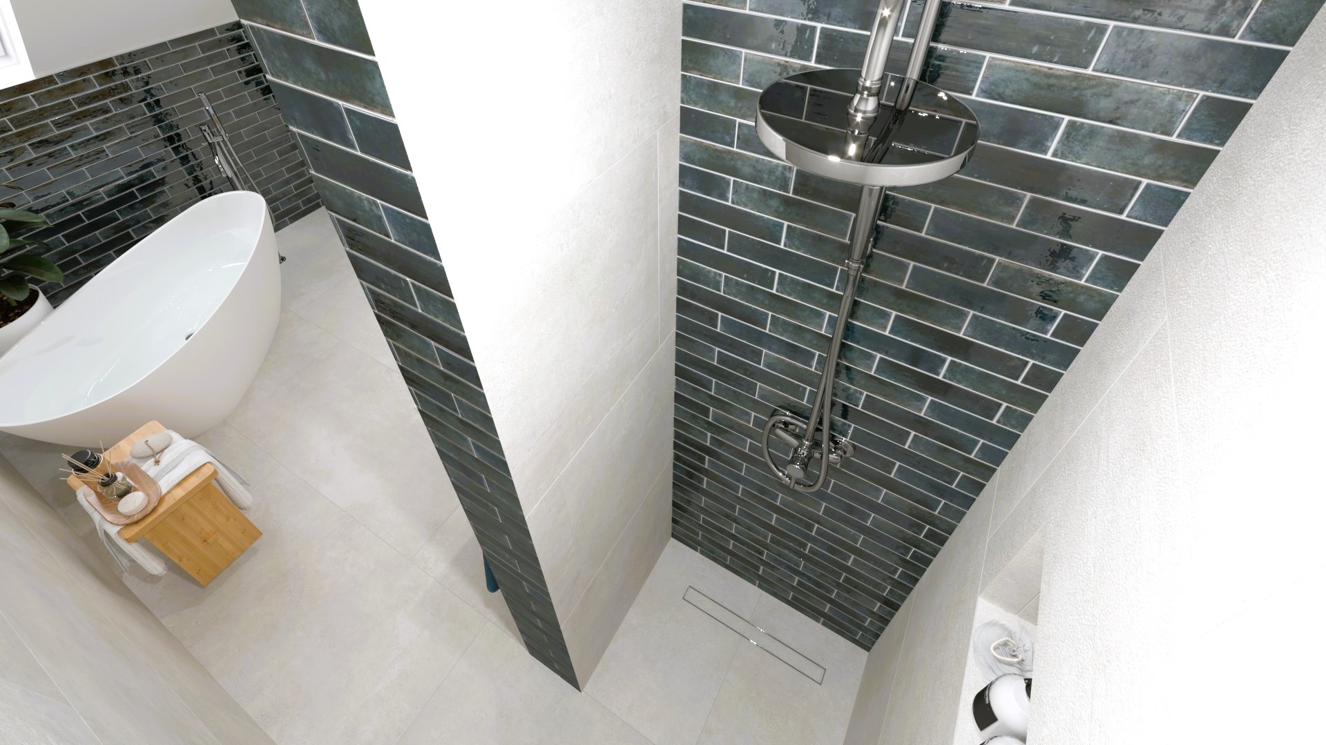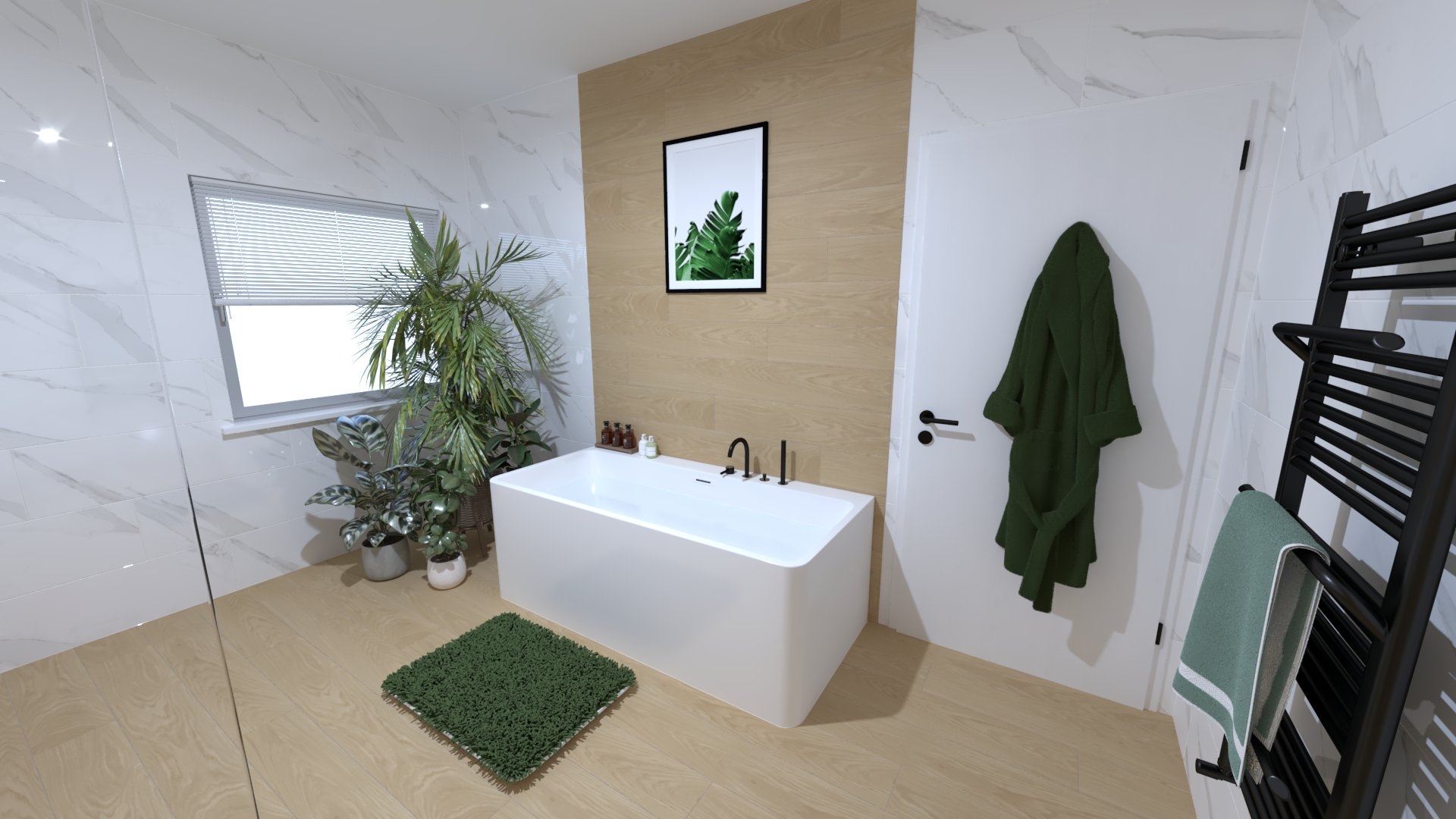 Burkolat rendelésre: Zöld Atlas Concorde Boost Wall 80×40 cm; fahatás készletről Atlas Concorde Log Icon 20×120 cm; kád rendelésre: Arezzo Silk Glow 170×86 cm térben álló kád; csaptelepek rendelésre: Arezzo Cubefield család fekete; WC + bidé rendelésre: Arezzo Ohio család; tartály készletről: Geberit Duofix+ Sigma nyomógomb fekete