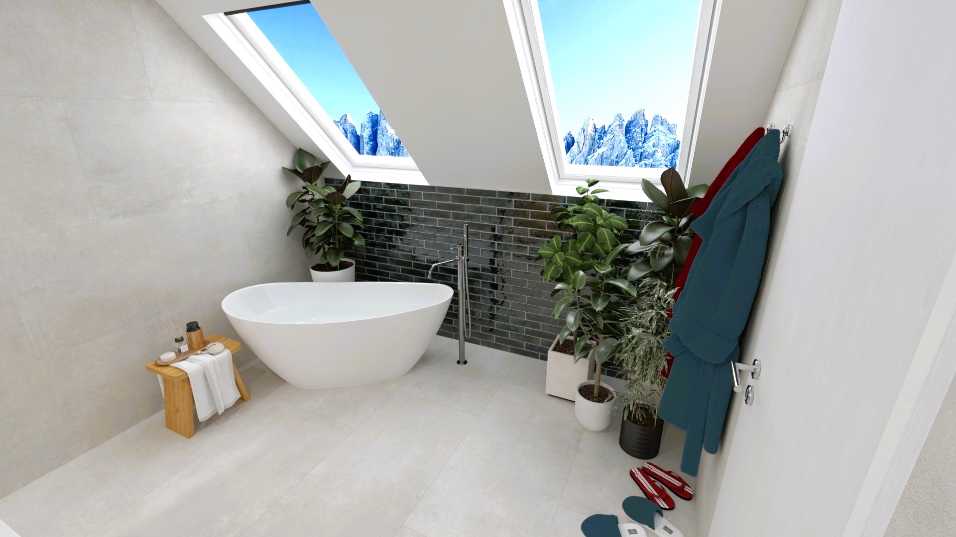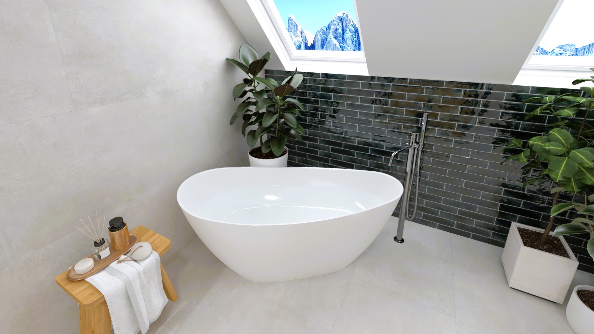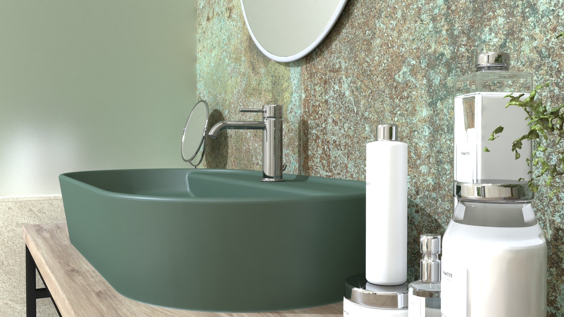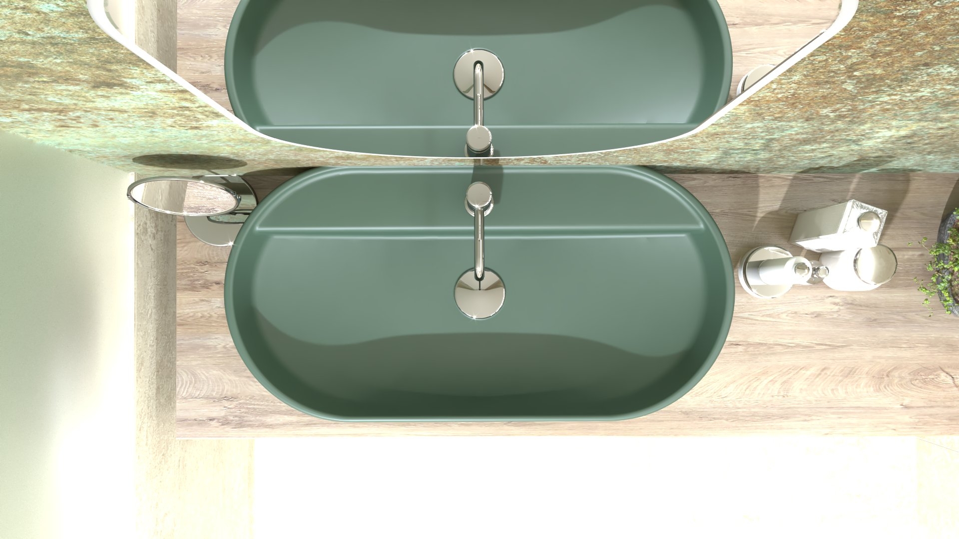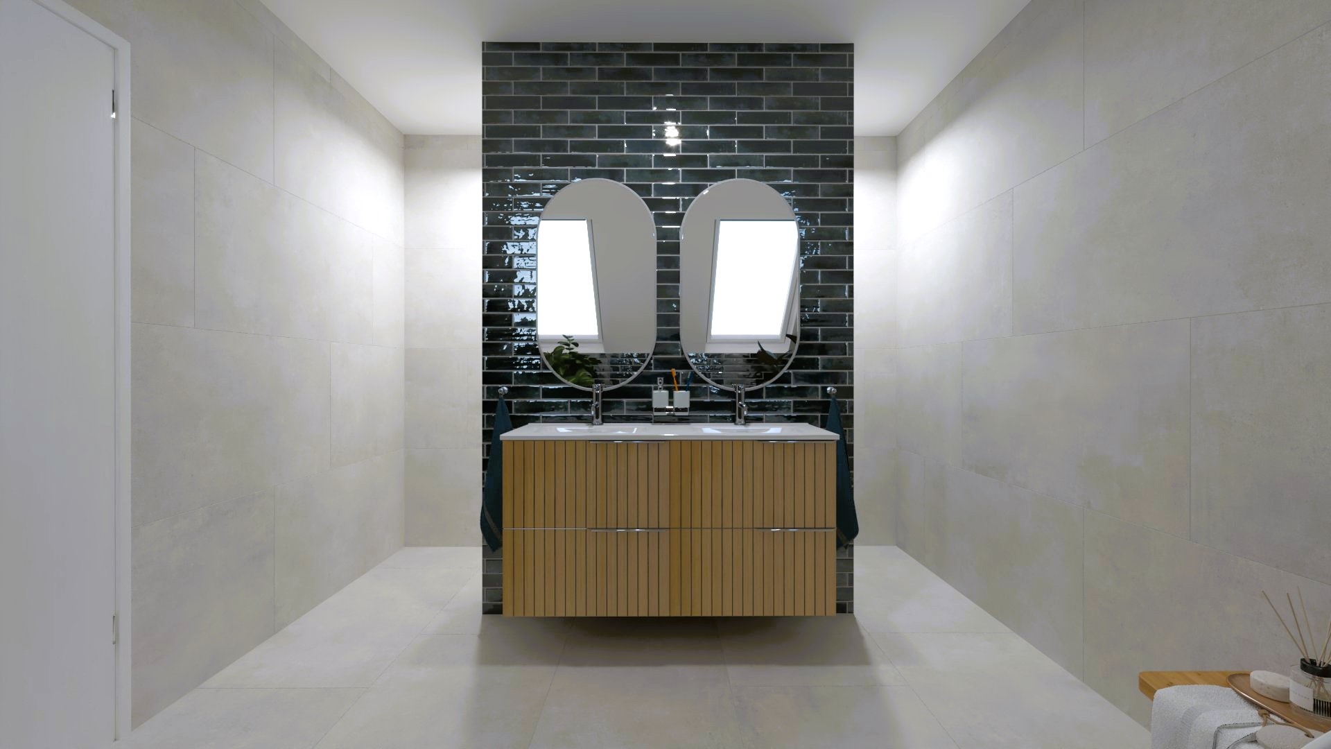 Burkolat rendelésre: Zöld Atlas Concorde Boost Wall 80×40 cm; fahatás készletről Atlas Concorde Log Icon 20×120 cm; kád rendelésre: Arezzo Silk Glow 170×86 cm térben álló kád; csaptelepek rendelésre: Arezzo Cubefield család fekete; WC + bidé rendelésre: Arezzo Ohio család; tartály készletről: Geberit Duofix+ Sigma nyomógomb fekete