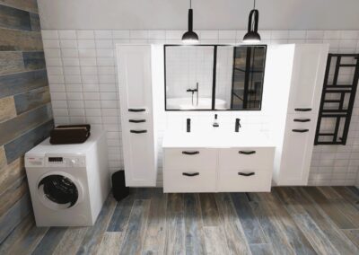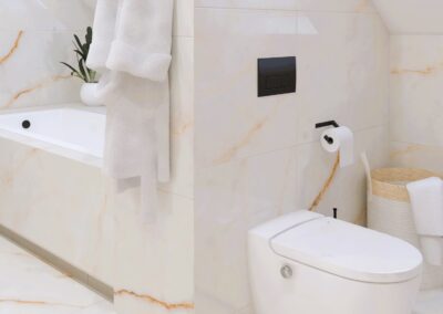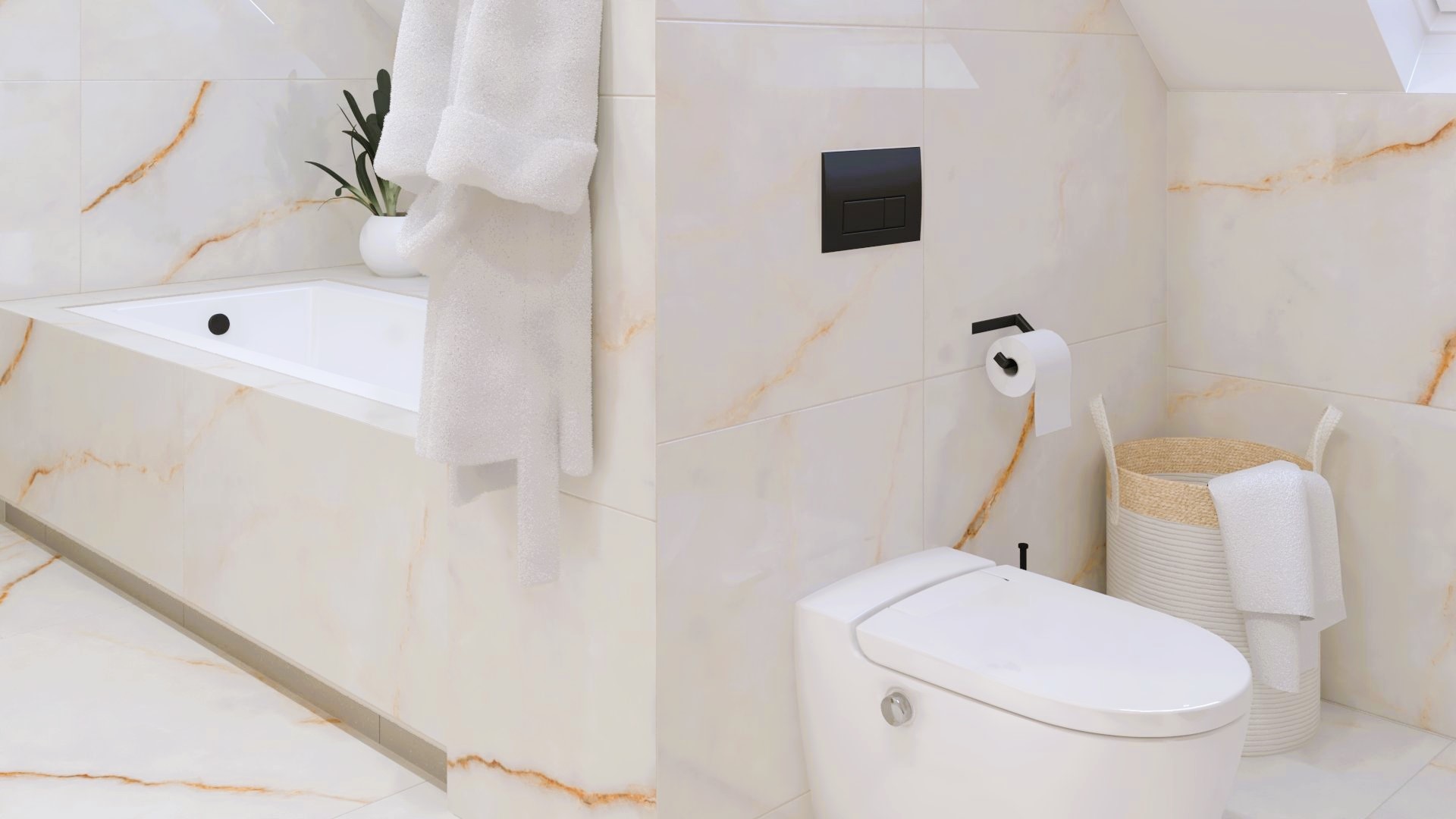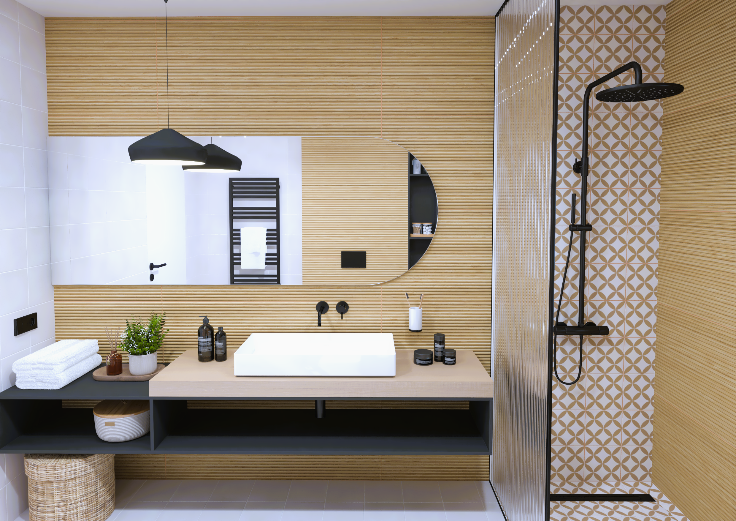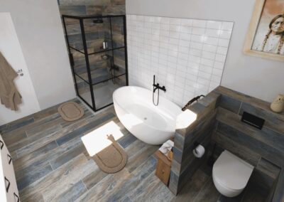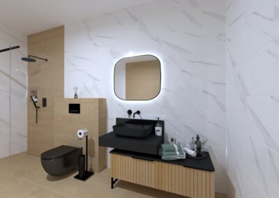 Burkolat: Atlas Concorde Marvel Diva White Everest 60x120 cm; Atlas Concorde Marvel Diva Black Tempest 60x120 cm; Atlas Concorde Log Bright Oak Chevron 7,5x45 cm; Szaniter: Radaway, Elita, Bugnatese, Sapho, Geberit
