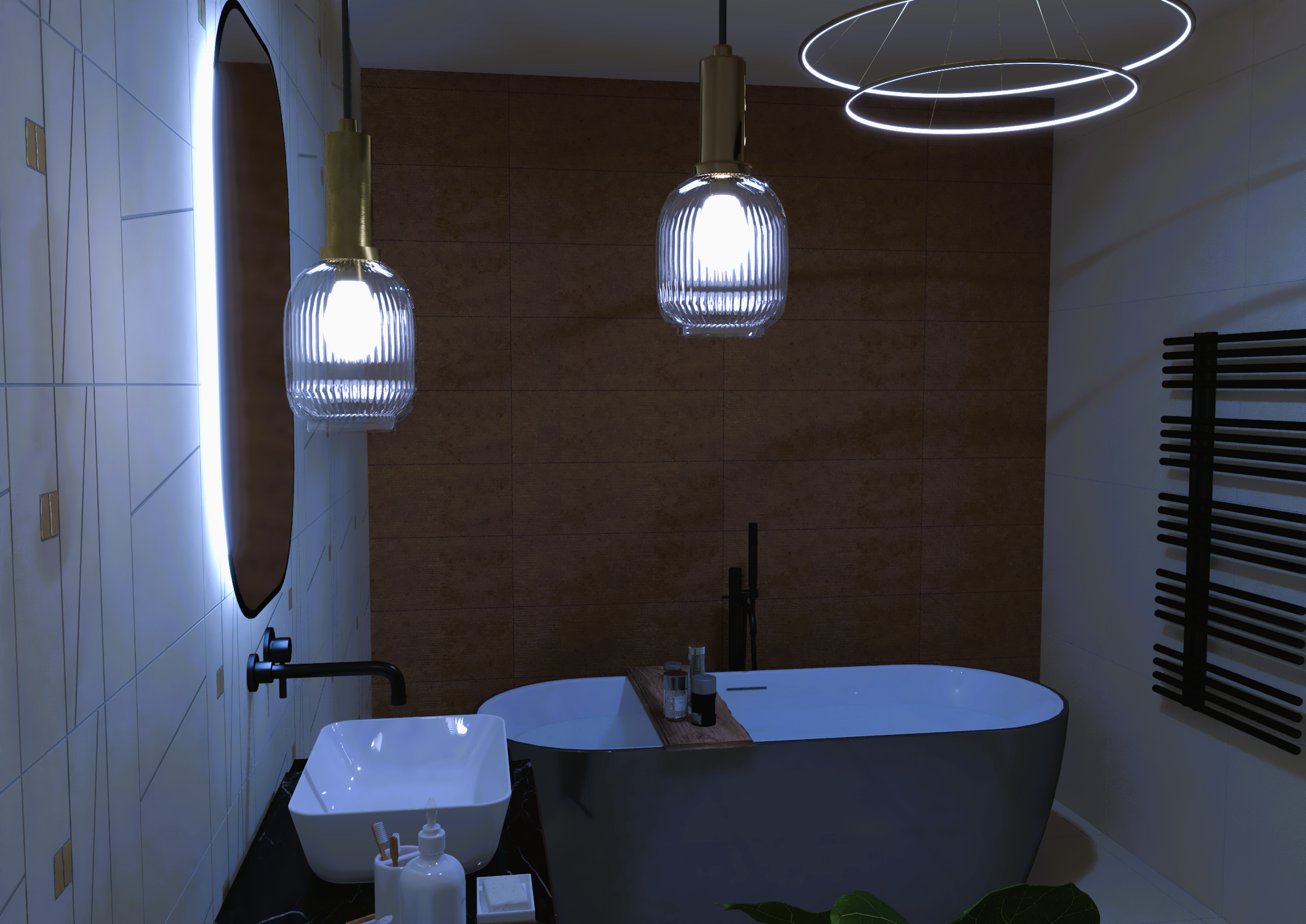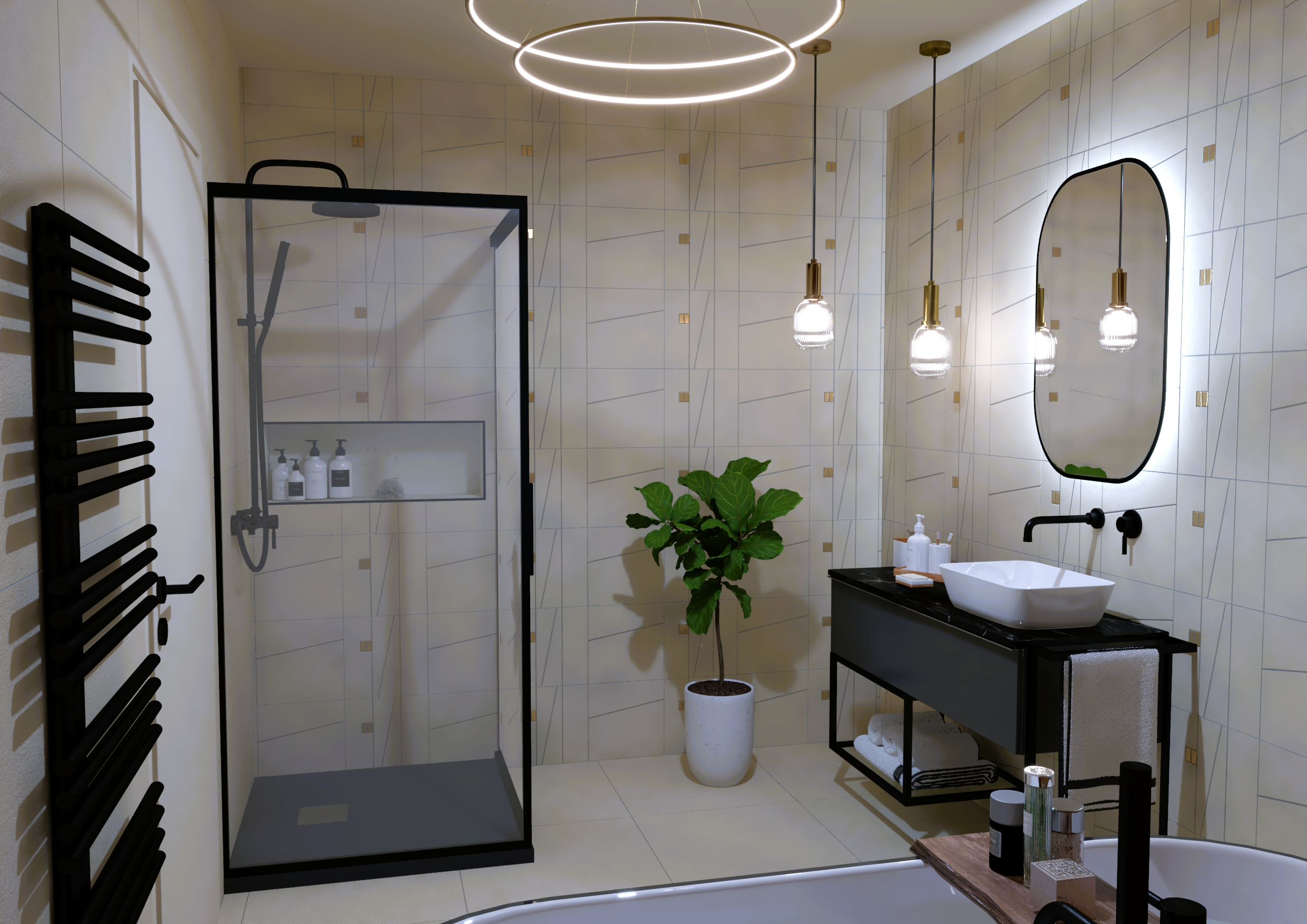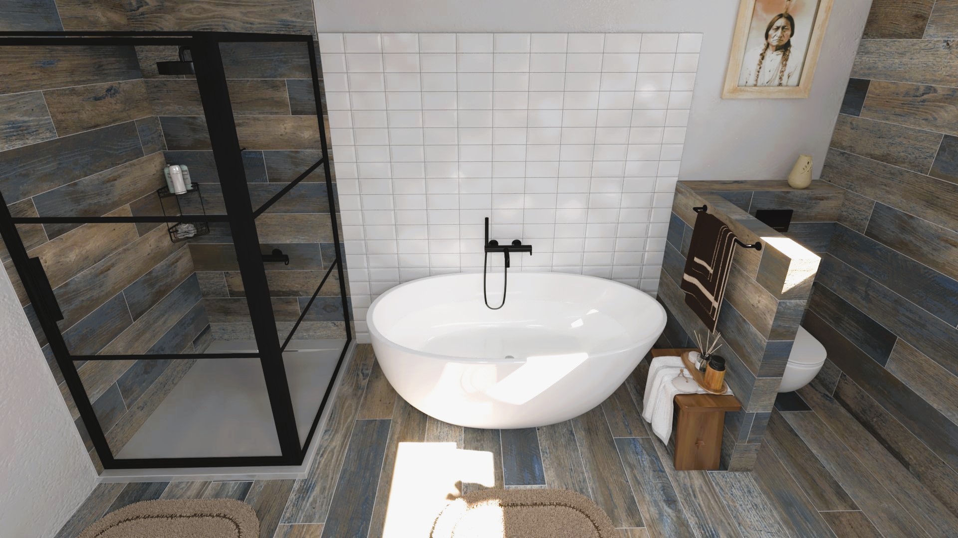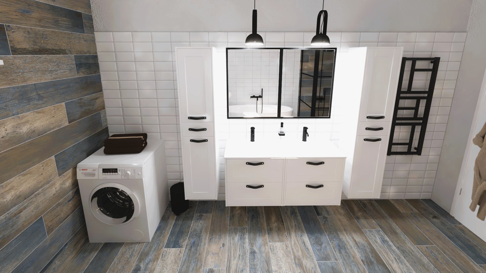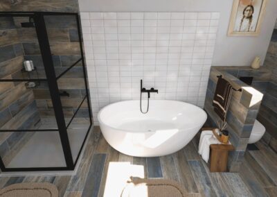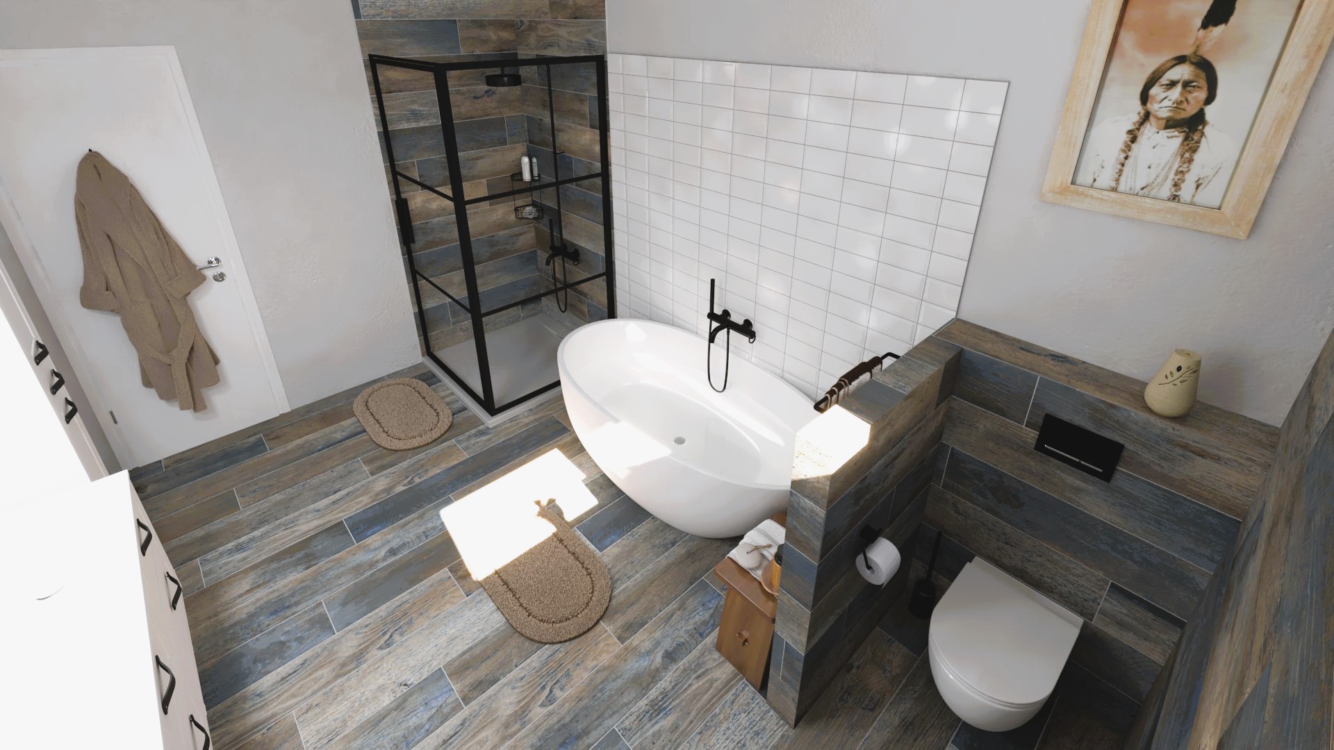 Burkolat rendelésre: Sant’Agostino Yorkwood 120×20 cm fahatású lap, Vilar Metro fényes fehér 10×20 cm csempe; Kád rendelésre: Arezzo Glow 170×86 cm; Zuhanyfülke rendelésre: Riho GRID 201 100×100 cm; WC rendelésre: Arezzo Arizona Vortex rimless fali wc+ ülőke; WC tartály készletről: Geberit Duofix+ Sigma nyomógomb; fürdőszoba bútor rendelésre: Royo Inge New család fekete bőr fogantyúval; Skappa 60-as mosdó, 60-as fekete keretes tükör; csaptelepek rendelésre: Bugnatese B-Color család matt fekete színben; radiátor rendelésre: Arezzo Rockwall fekete 114×40 cm