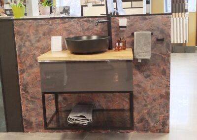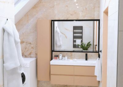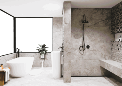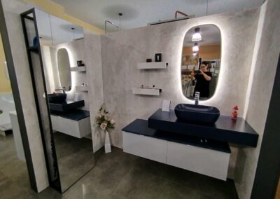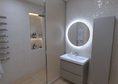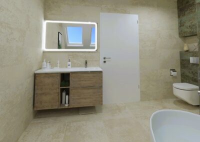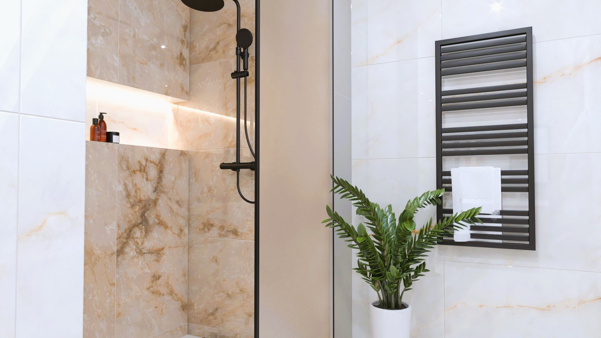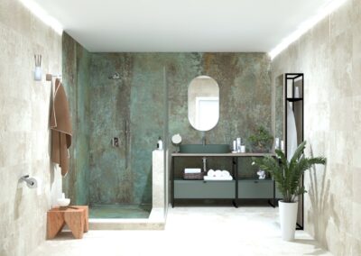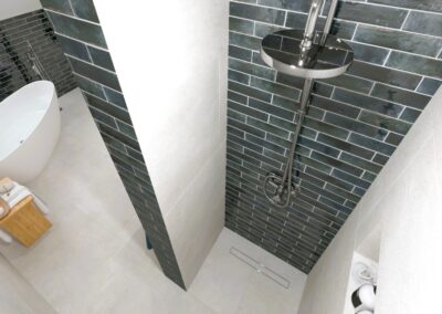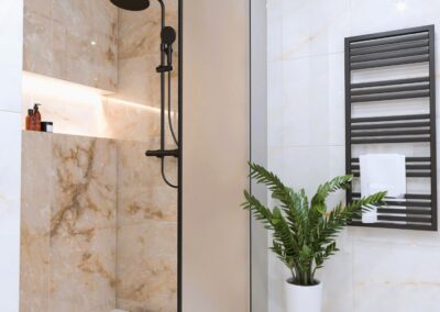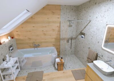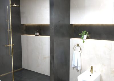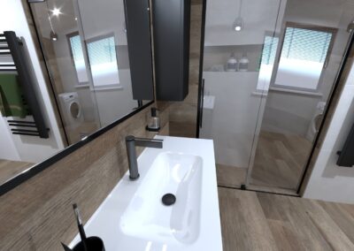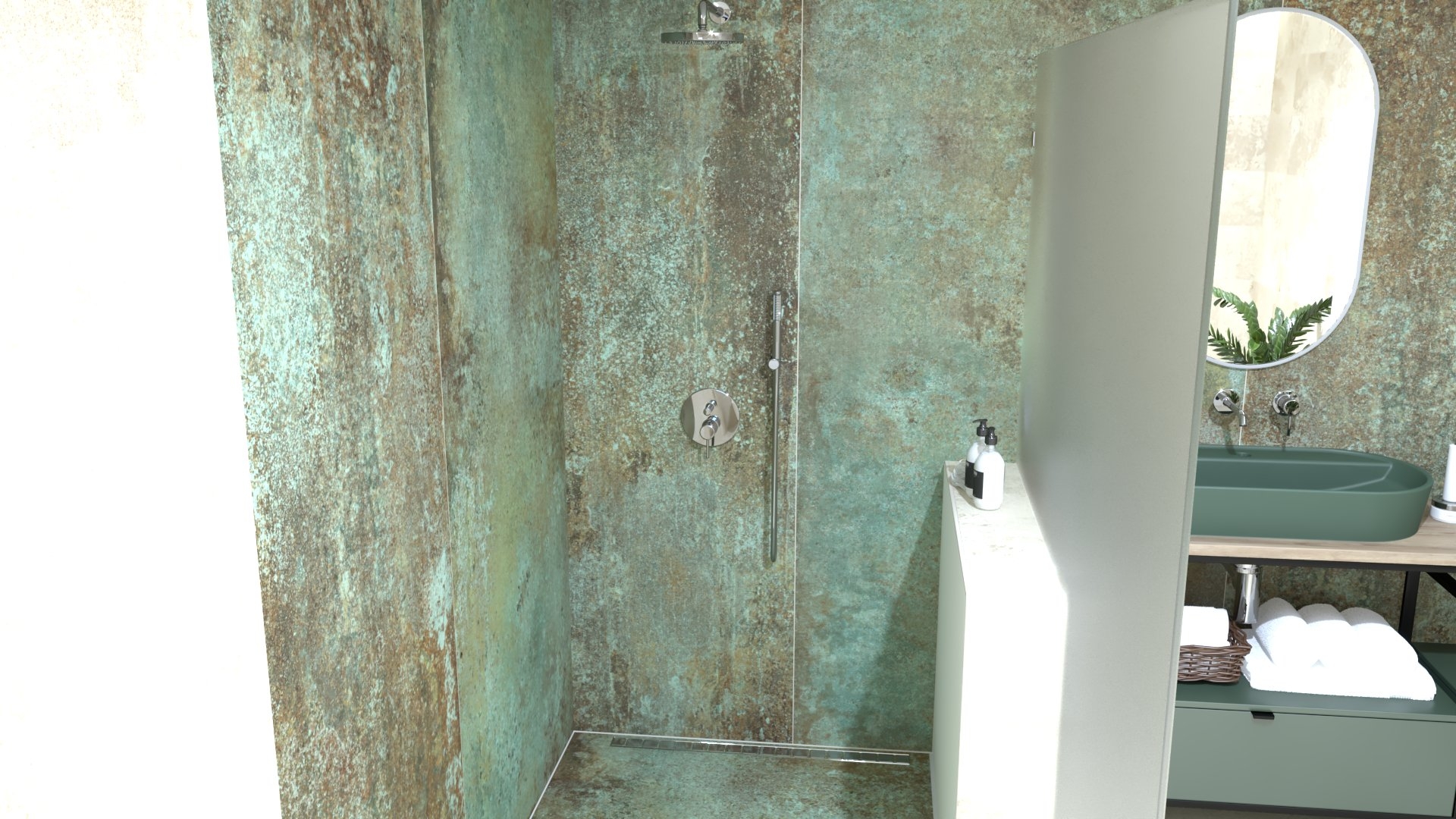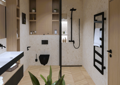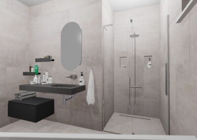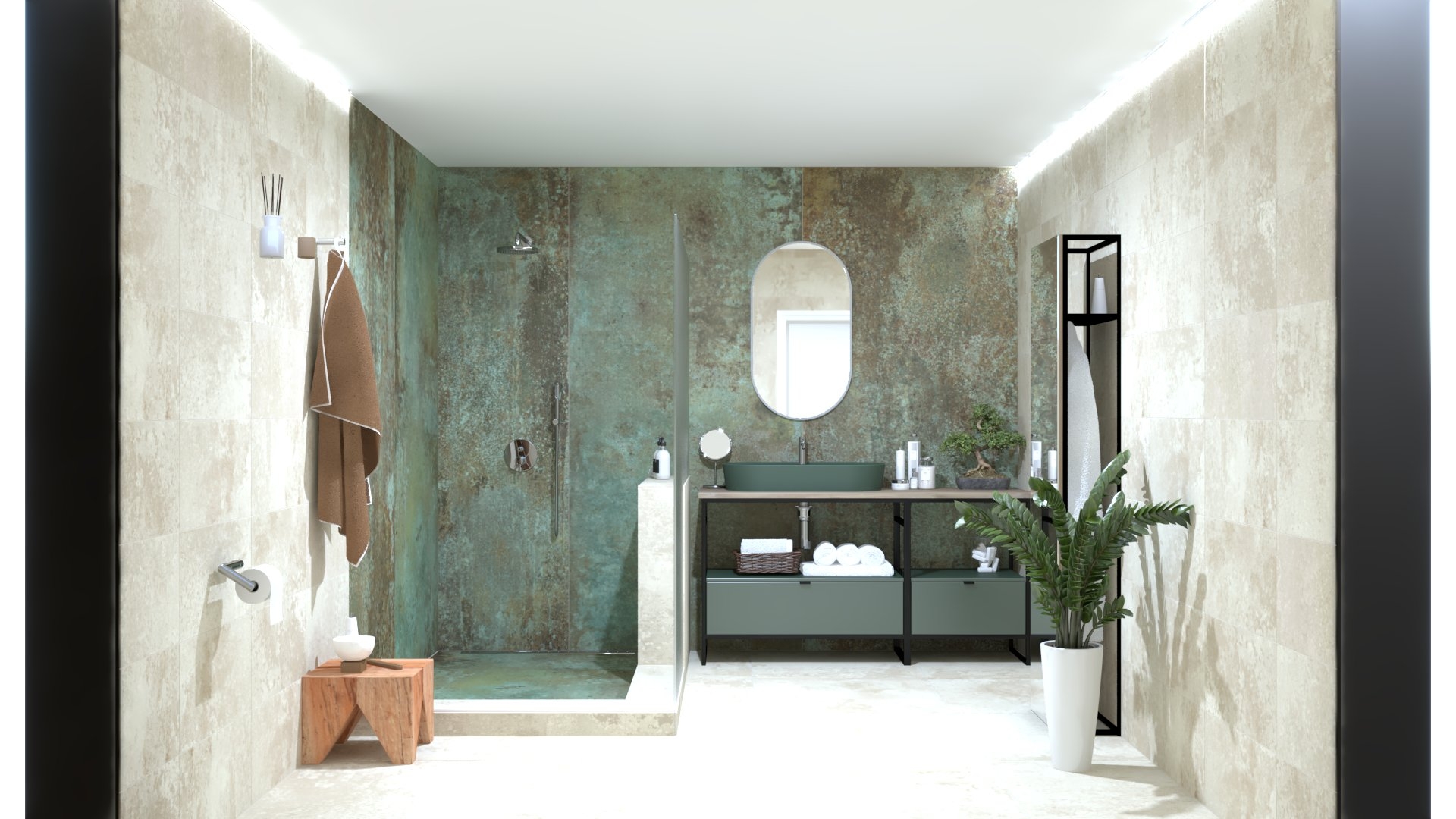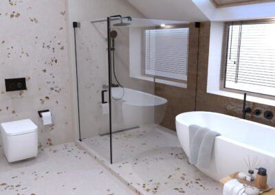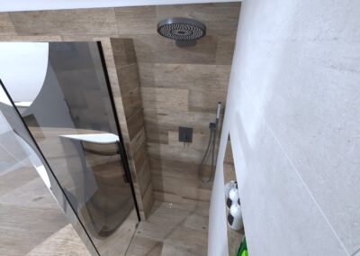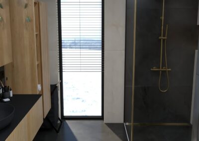 Burkolat: Atlas Concorde Boost Pro Cream 60*120 cm; Fap True Color Groove Jade 50*120 ; Porcelangres Urban Antracite 60*120 cm; Szaniter: Hansgrohe, Laufen, Radeco, Elita, Radaway