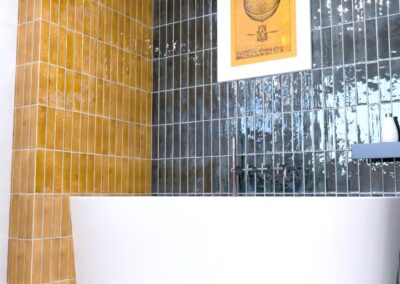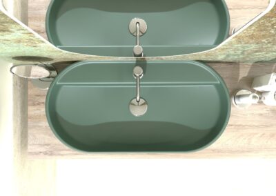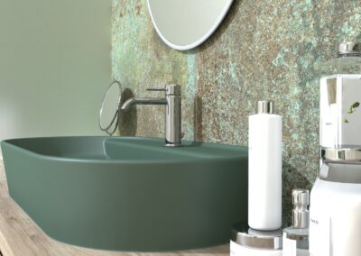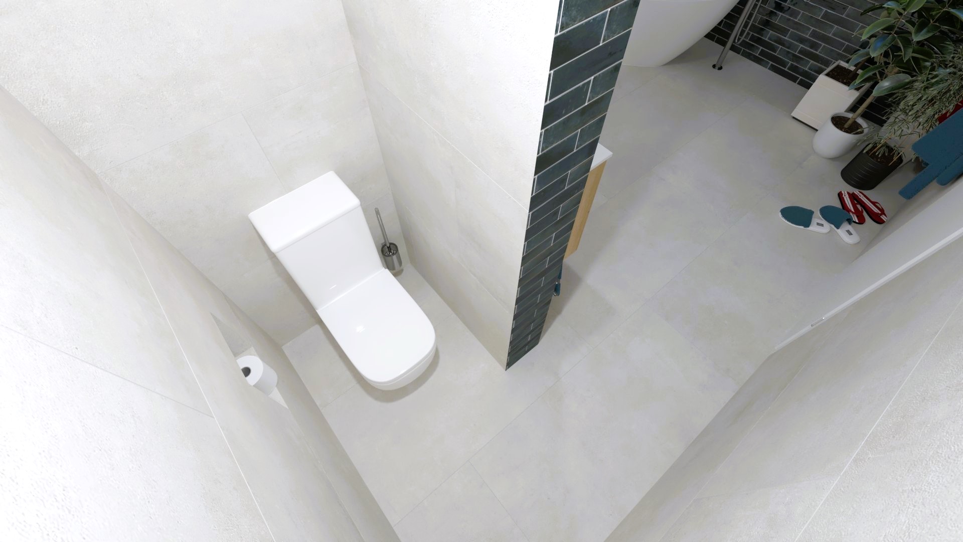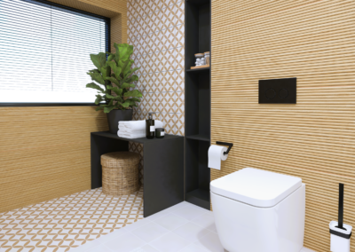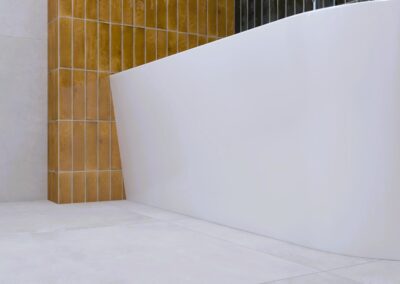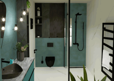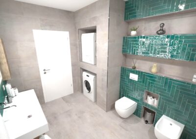 Burkolat rendelésre: Zöld Atlas Concorde Boost Wall 80×40 cm, fahatás: készletről Atlas Concorde Log Icon 20×120 cm; kád rendelésre: Arezzo Silk Glow 170×86 cm térben álló kád; csaptelepek rendelésre: Arezzo Cubefield család fekete; WC + bidé rendelésre: Arezzo Ohio család; wc tartály készletről: Geberit Duofix+ Sigma nyomógomb fekete