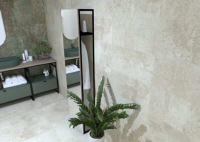 padló: Ragno Travertino 60x60 cm; fal: Vida Romantica Beige 30x90 cm; dekor : Cifre Kie Amber 30x90 cm; Zuhanyfal: Radaway; Bútor/tükör: Elita; Csaptelepek: Kludi; Kád: M-Acryl