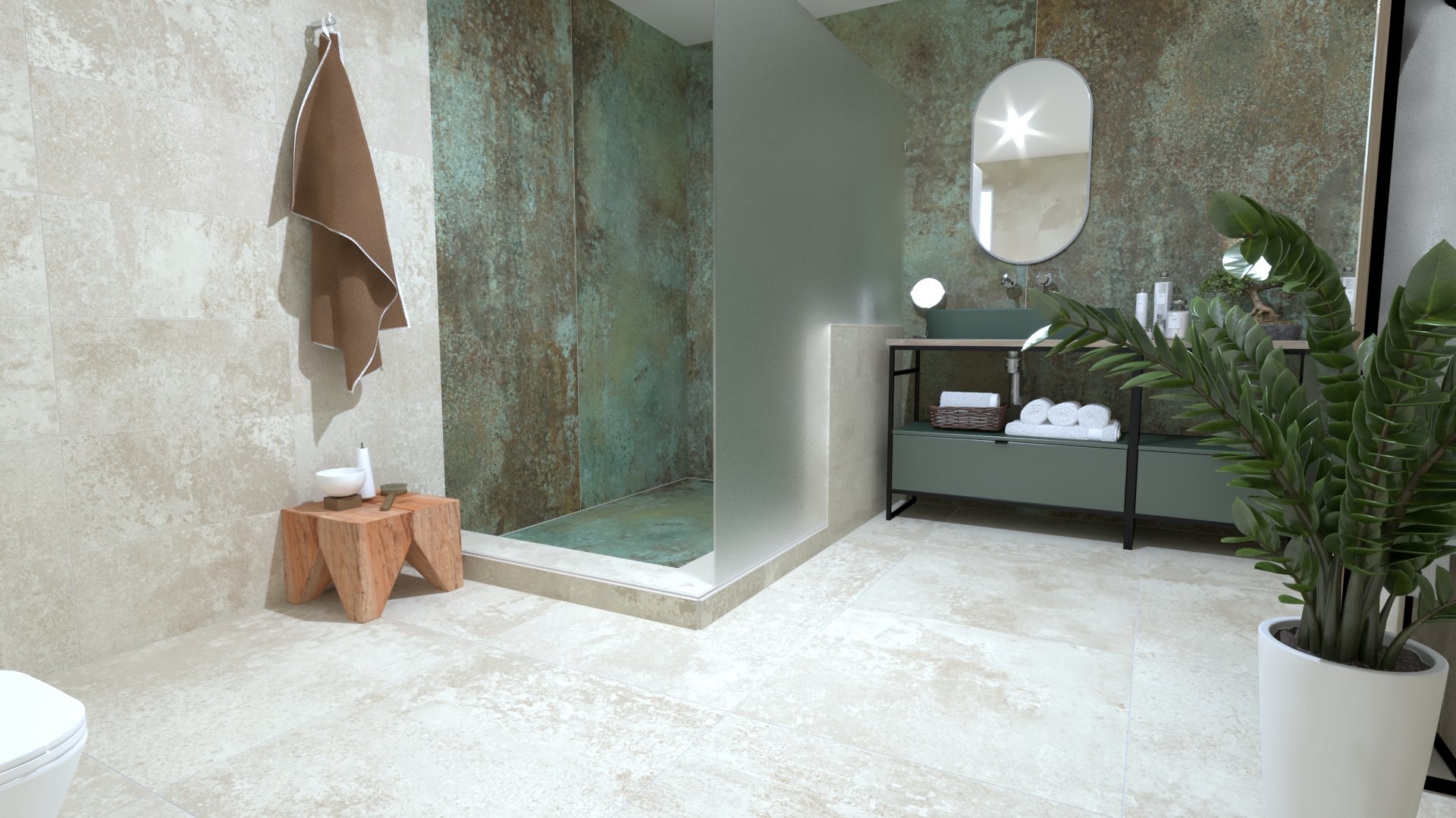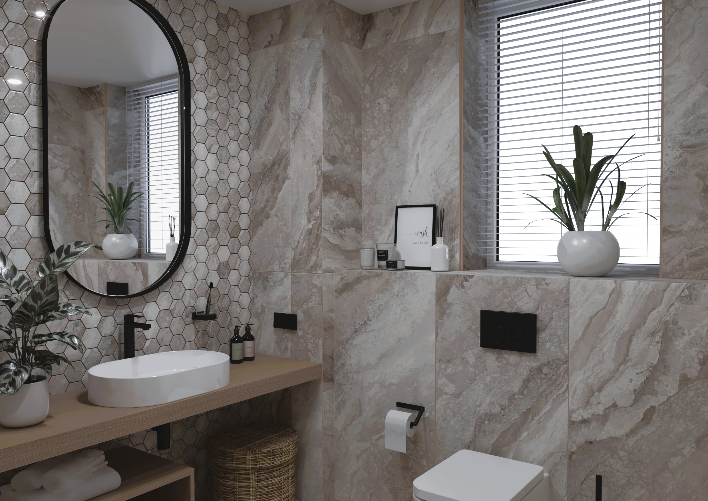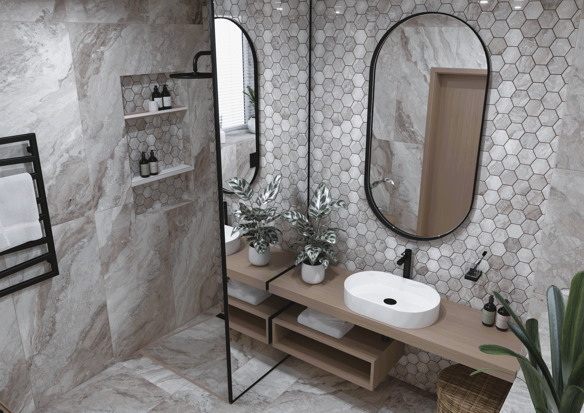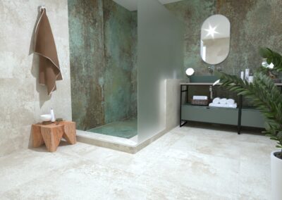 Burkolat: Ariana Worn Stone 120*120 cm, Ariana Futura Cenere 120*120 cm, Novabell Eiche Natur 120*20 cm;szaniter: Geberit, Radaway, Hansgrohe, Sapho