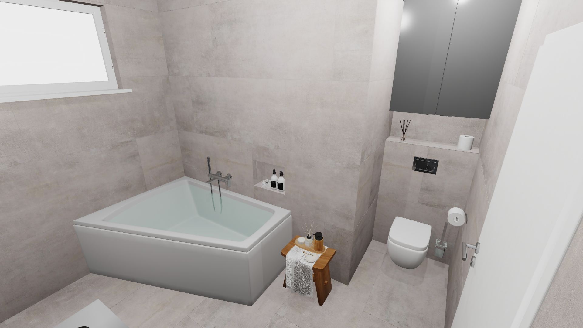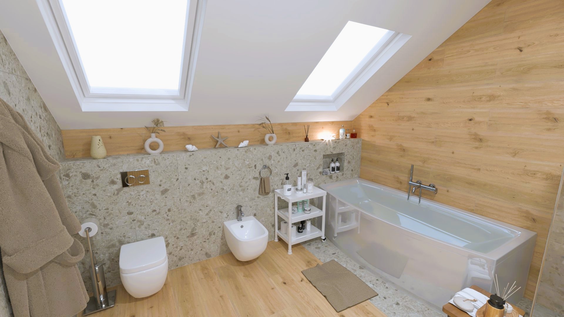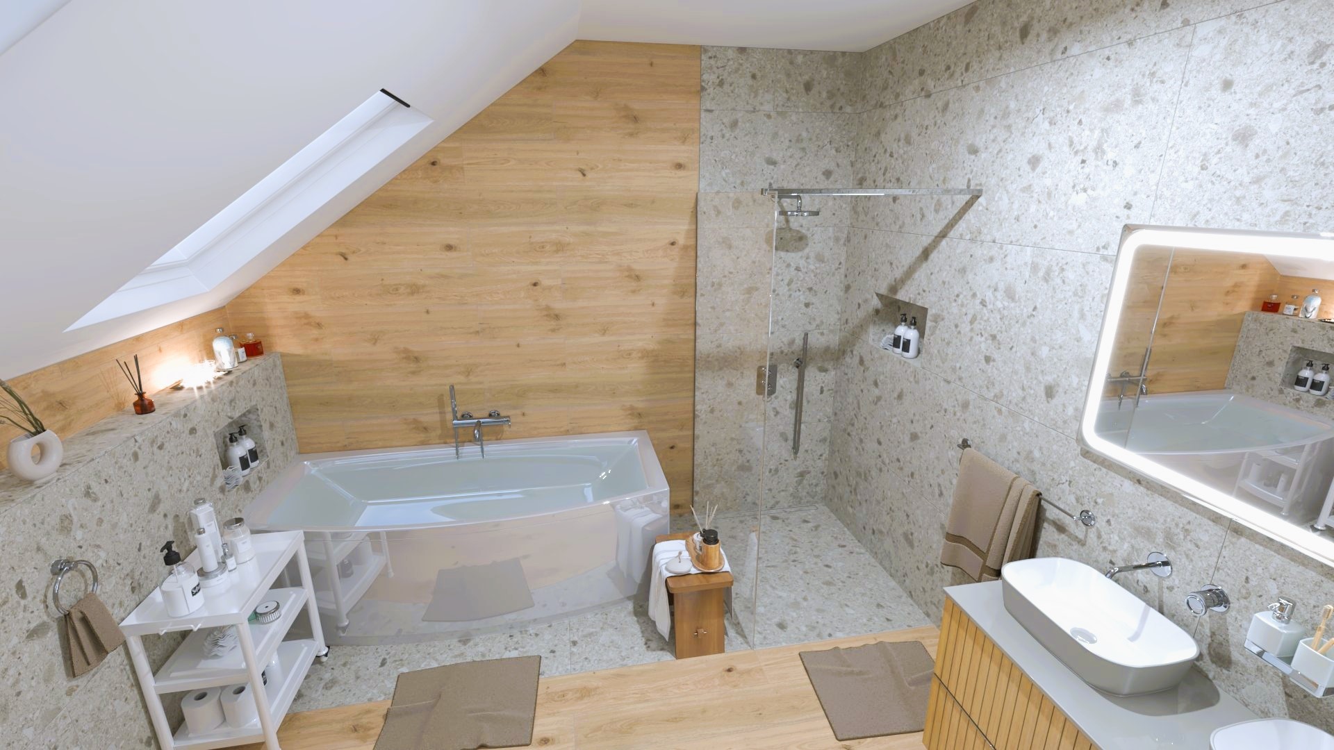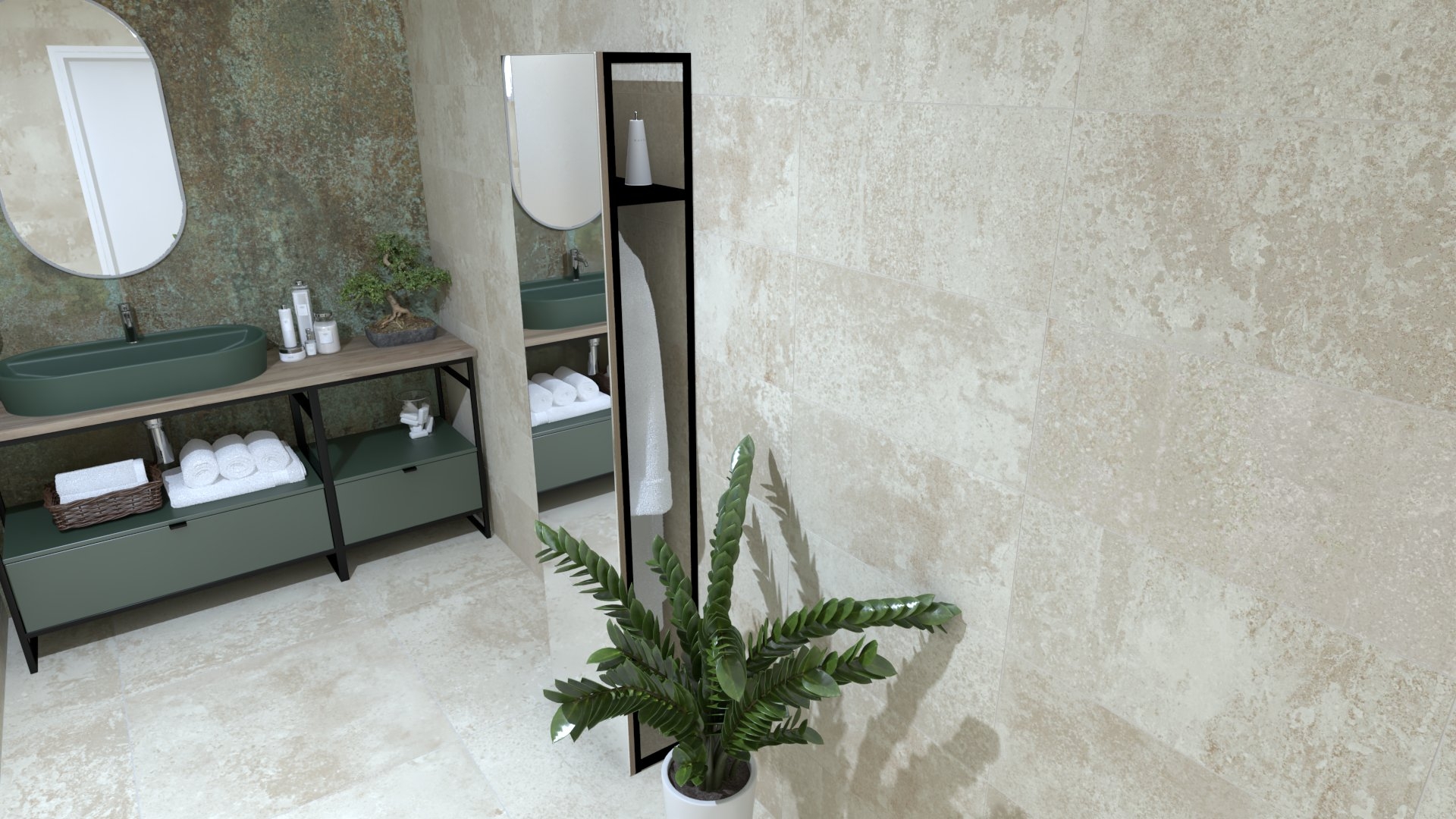 Burkolat: Ariana Worn Stone 120*120 cm, Ariana Futura Cenere 120*120 cm, Novabell Eiche Natur 120*20 cm;szaniter: Geberit, Radaway, Hansgrohe, Sapho