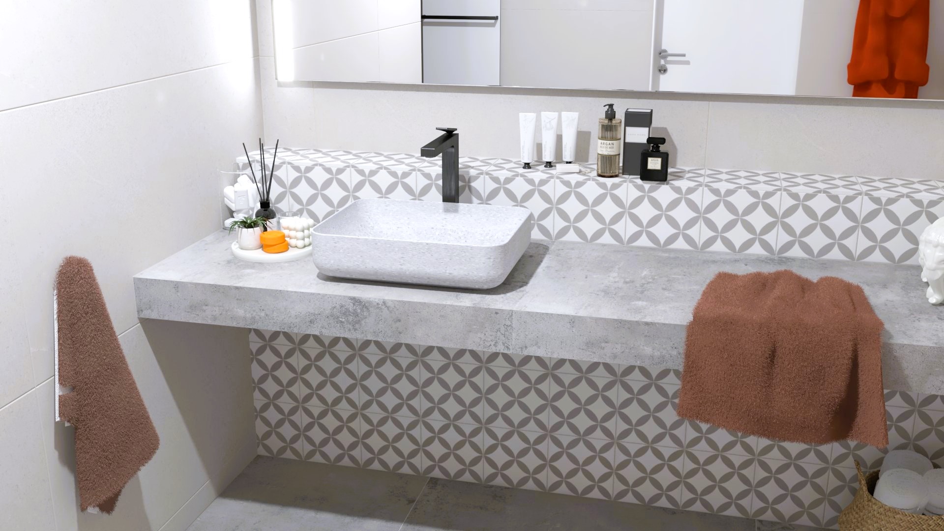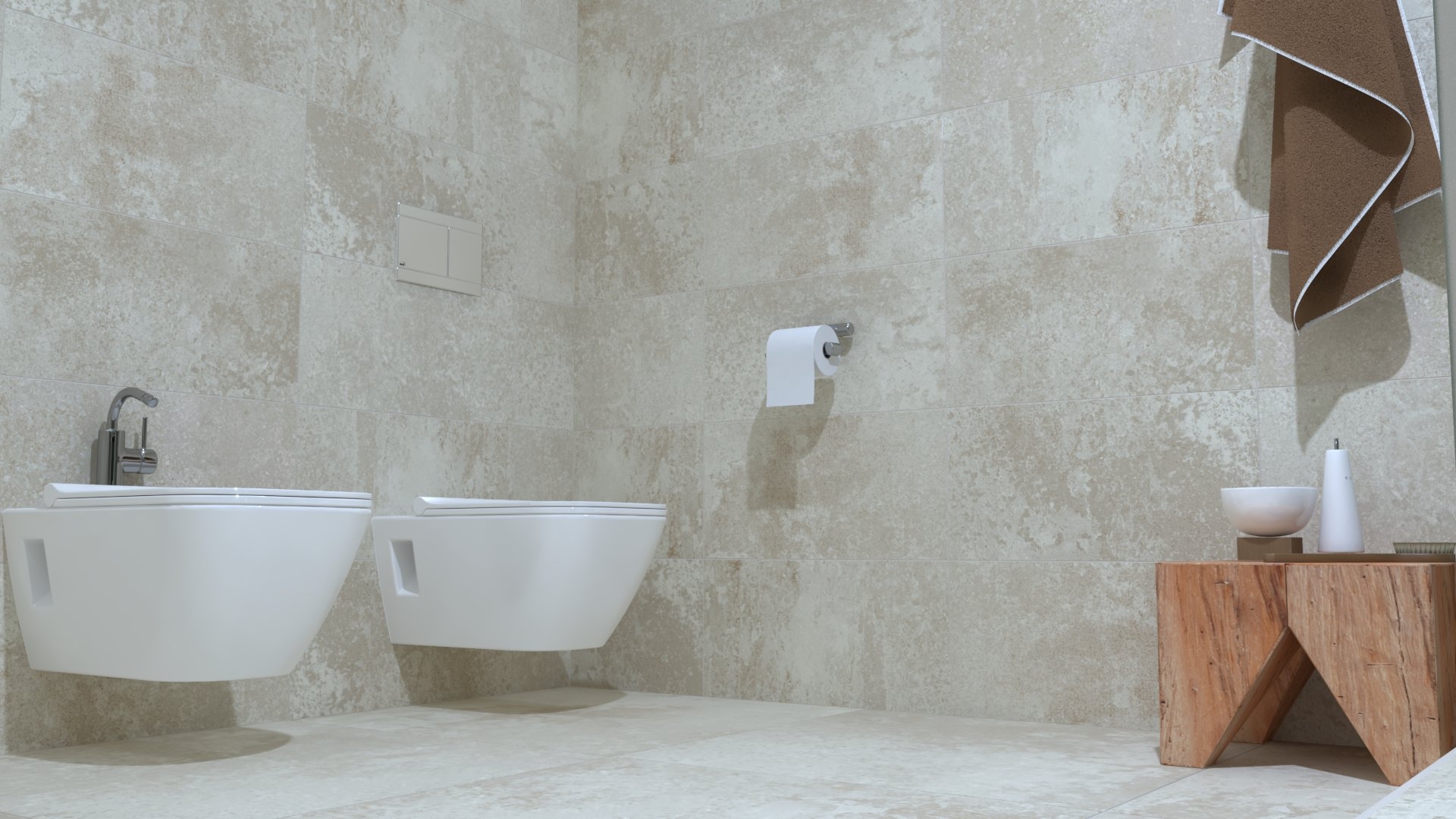 Burkolat: FAP Oxide Grey Rust Matt rett. 60x60 cm ; szaniter: Kolpa San, Elita, Hansgrohe, Geberit