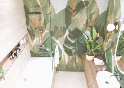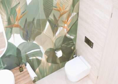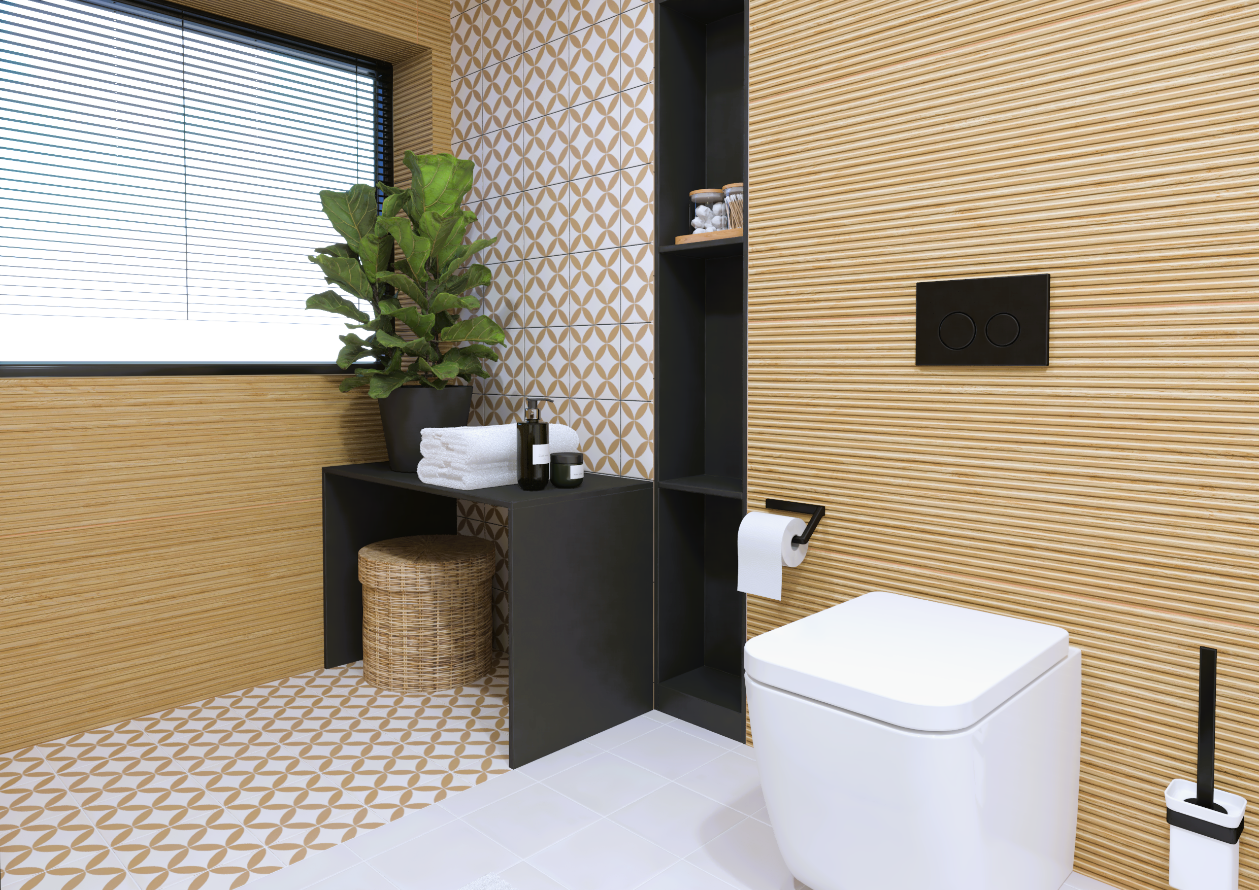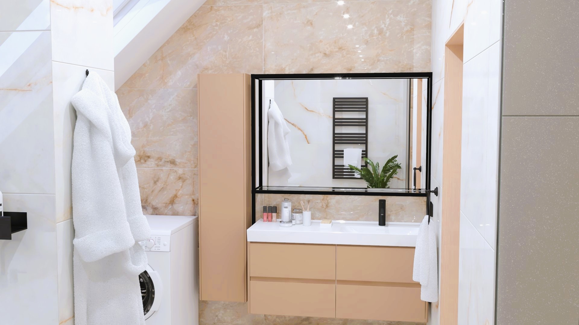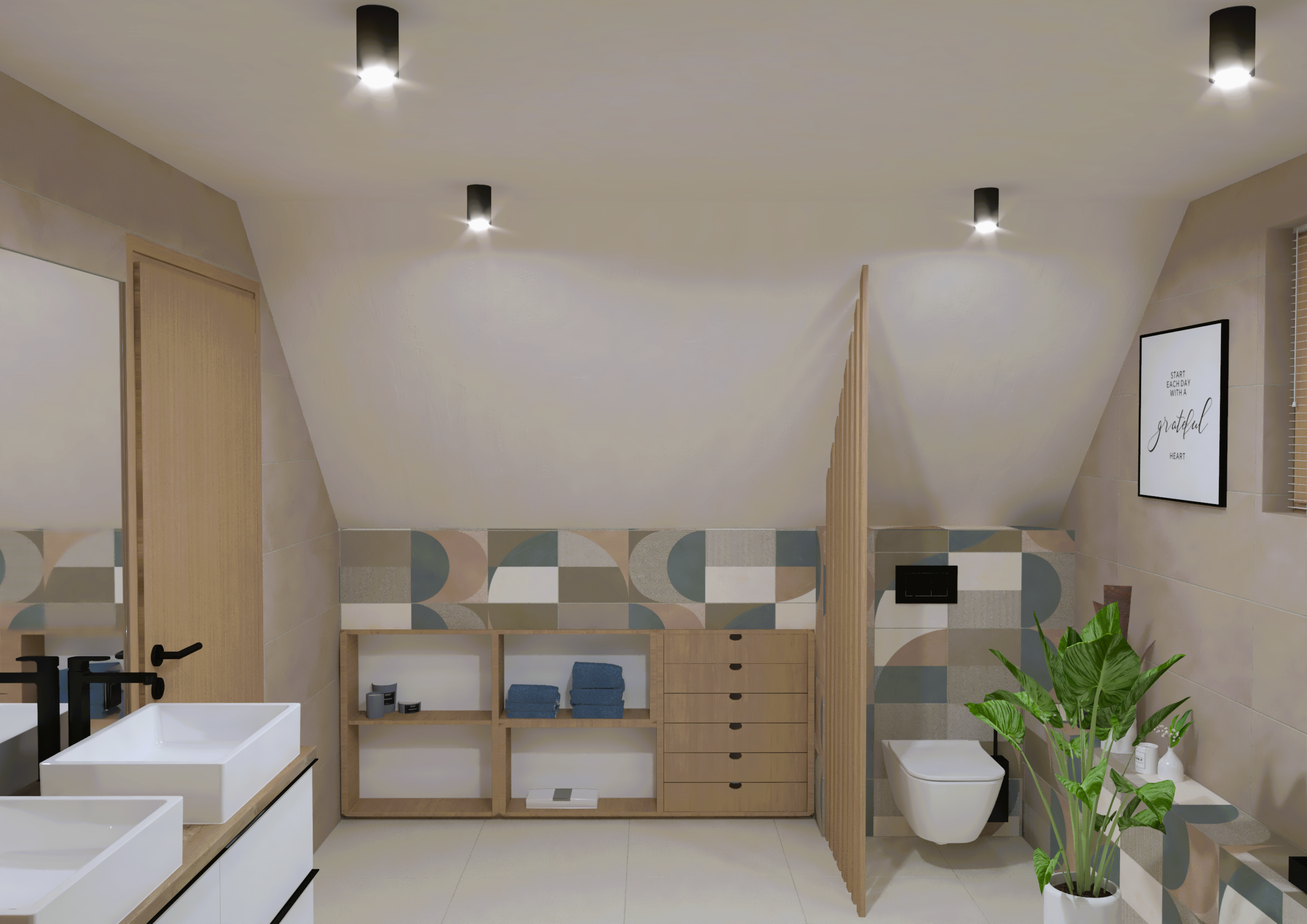 Burkolat: Savoia Italia Mood Almond 25*60 cm, Savoia Italia Mood Muretto Decor 25*60 cm, Ragno Grove Foresta 14,5*90 cm; Szaniter: Geberit, Radaway, Elita, Kludi, Radeco