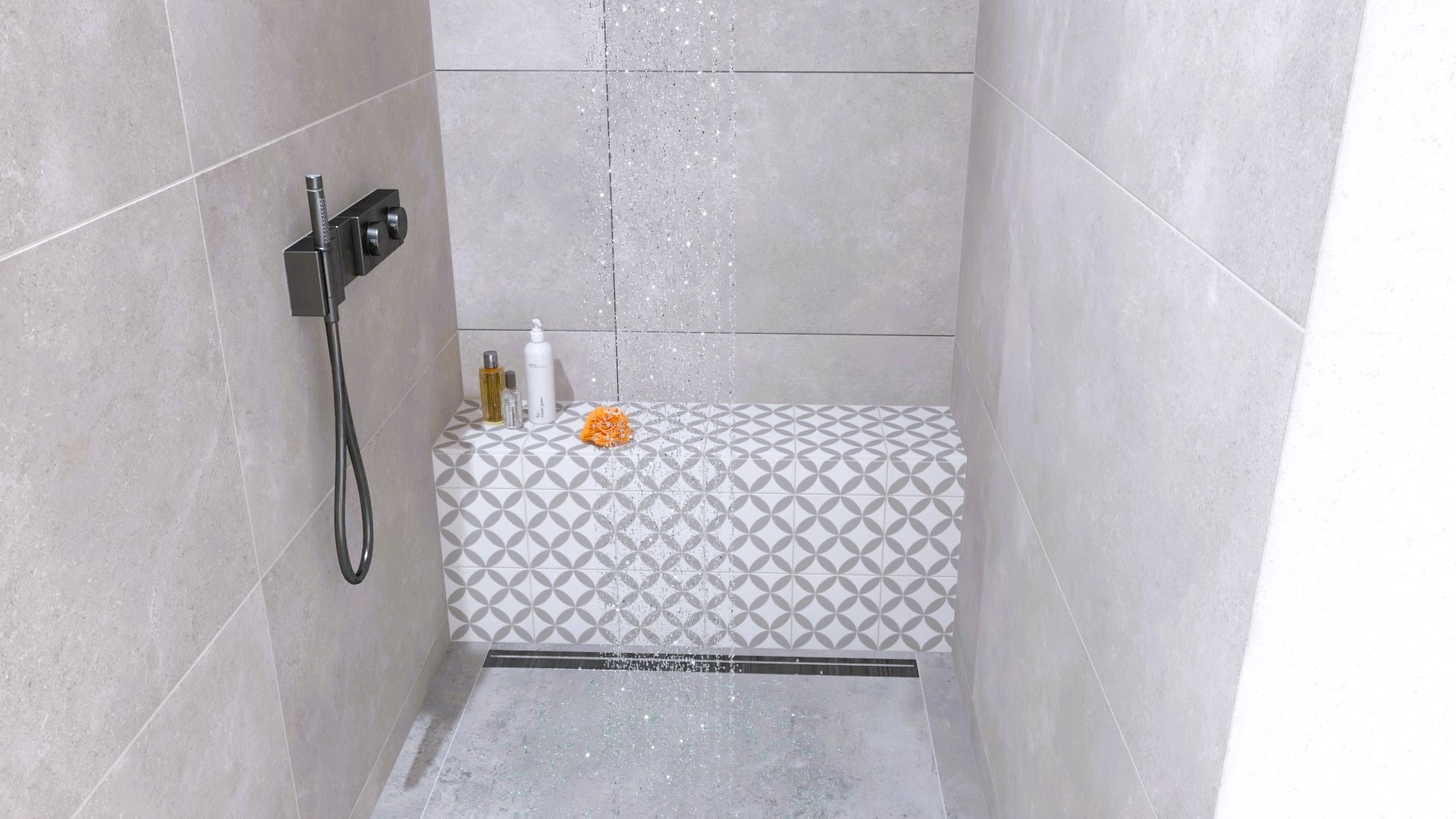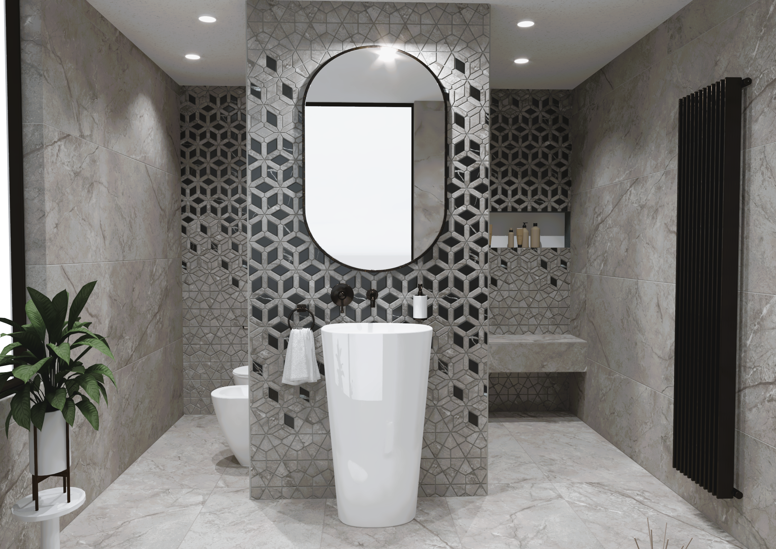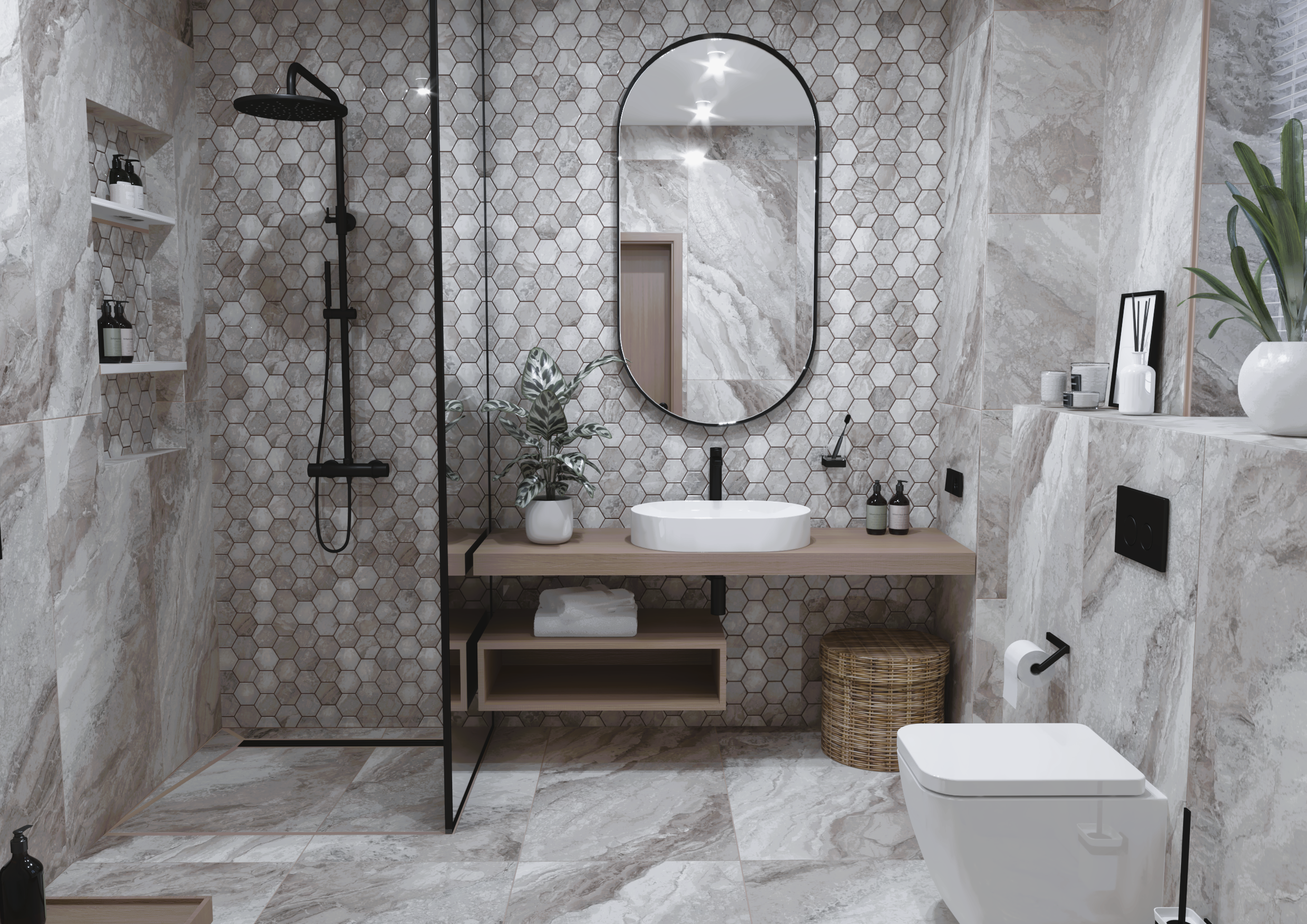 Burkolat: Flaviker Supreme Memories grey soapstone 120*120 cm; Flaviker Supreme Memories star clod 3D 60*120 cm ; szaniter: Radaway, Bugnatese, M-Acryl