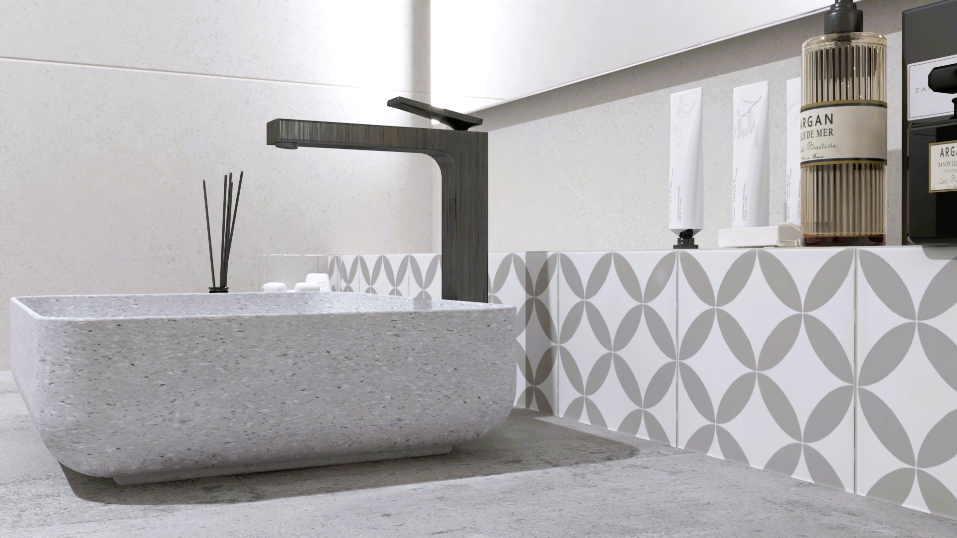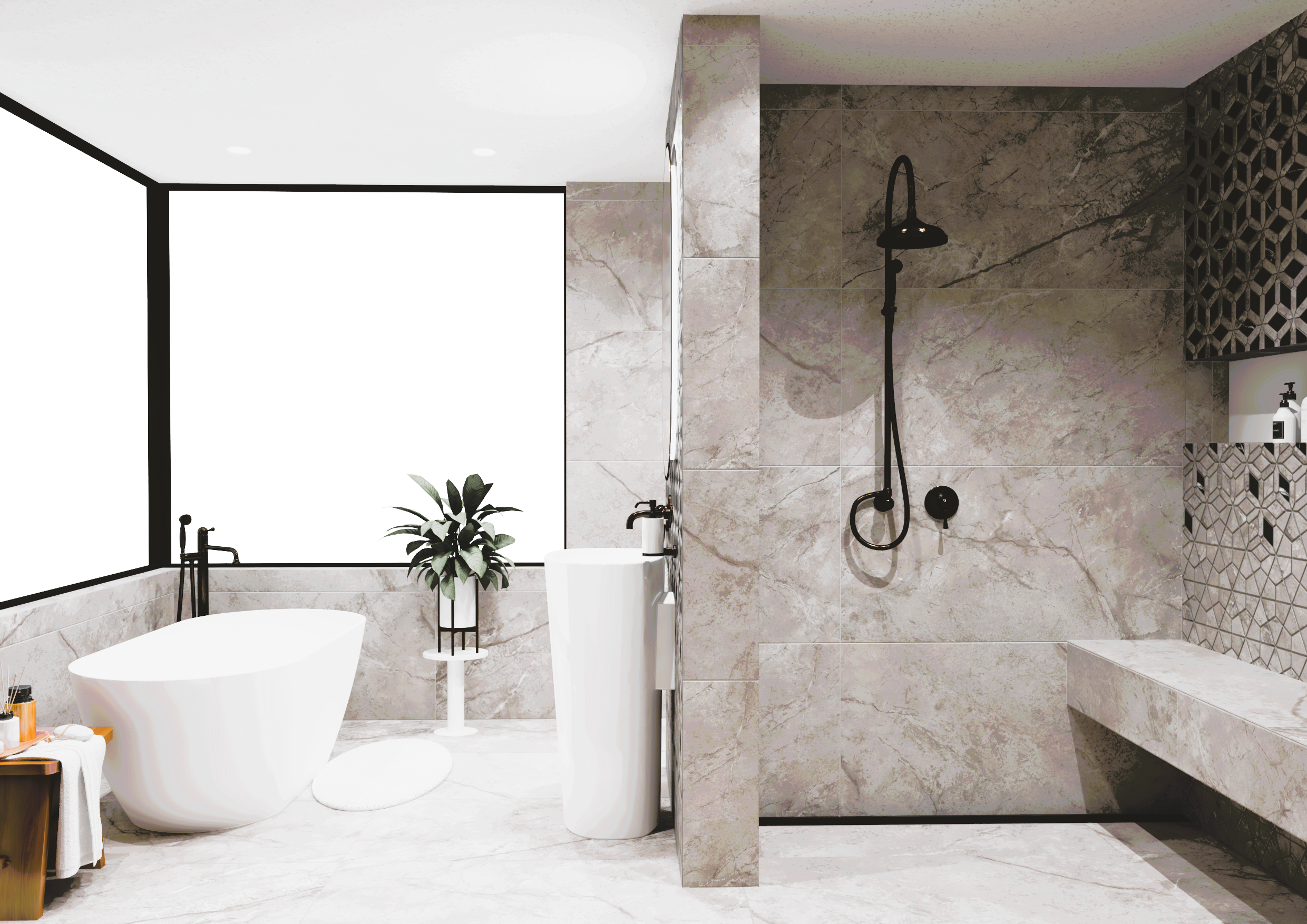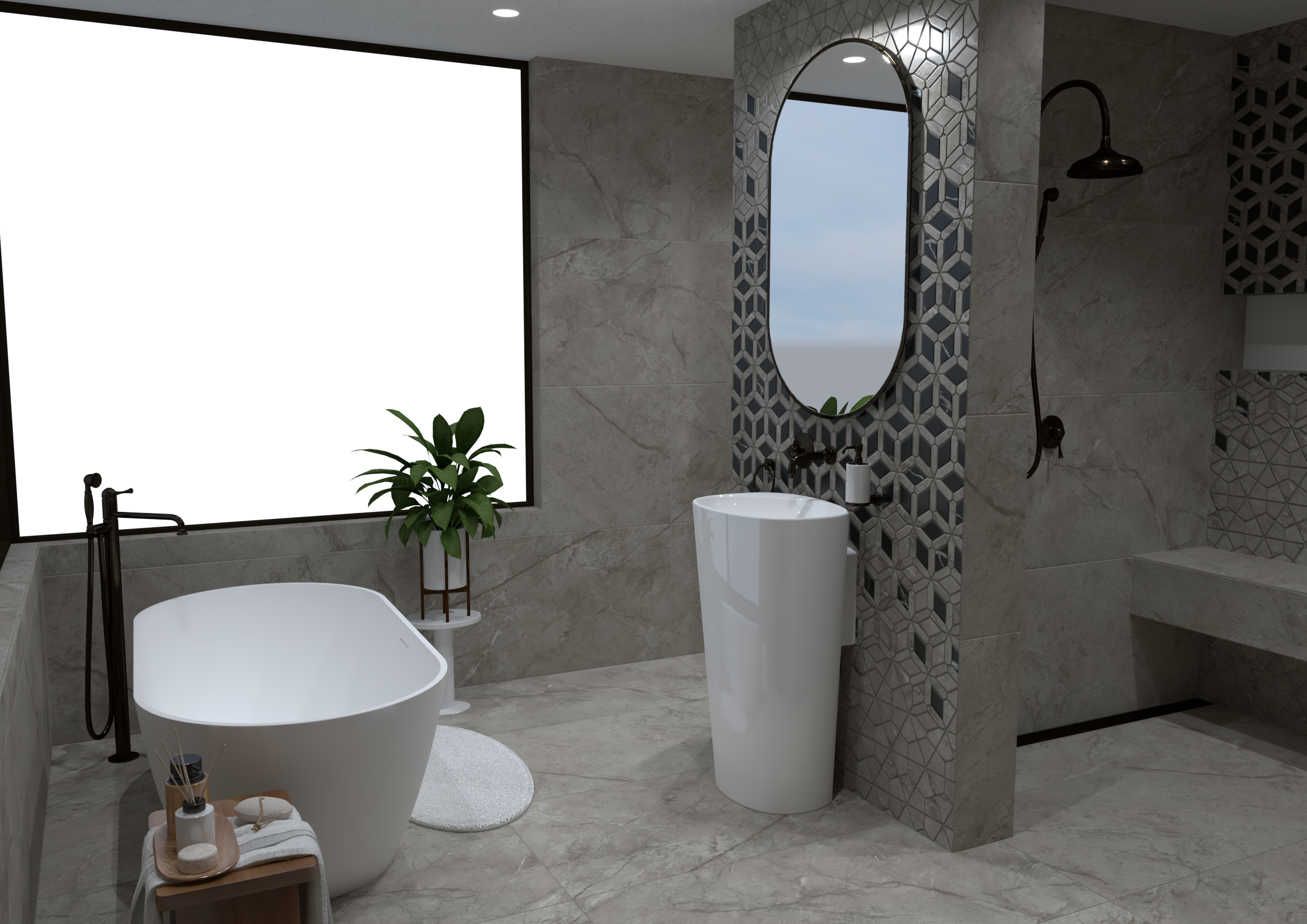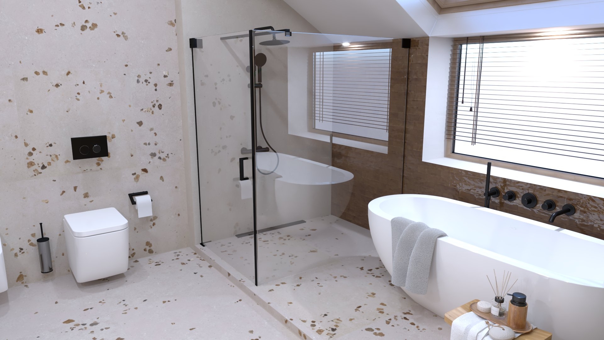 Burkolat: Flaviker Supreme Memories grey soapstone 120*120 cm; Flaviker Supreme Memories star clod 3D 60*120 cm ; szaniter: Radaway, Bugnatese, M-Acryl