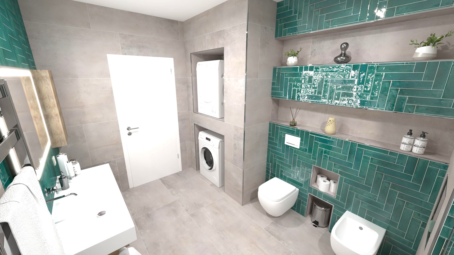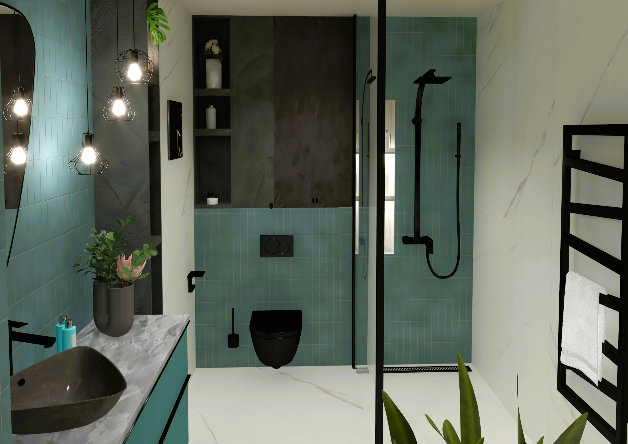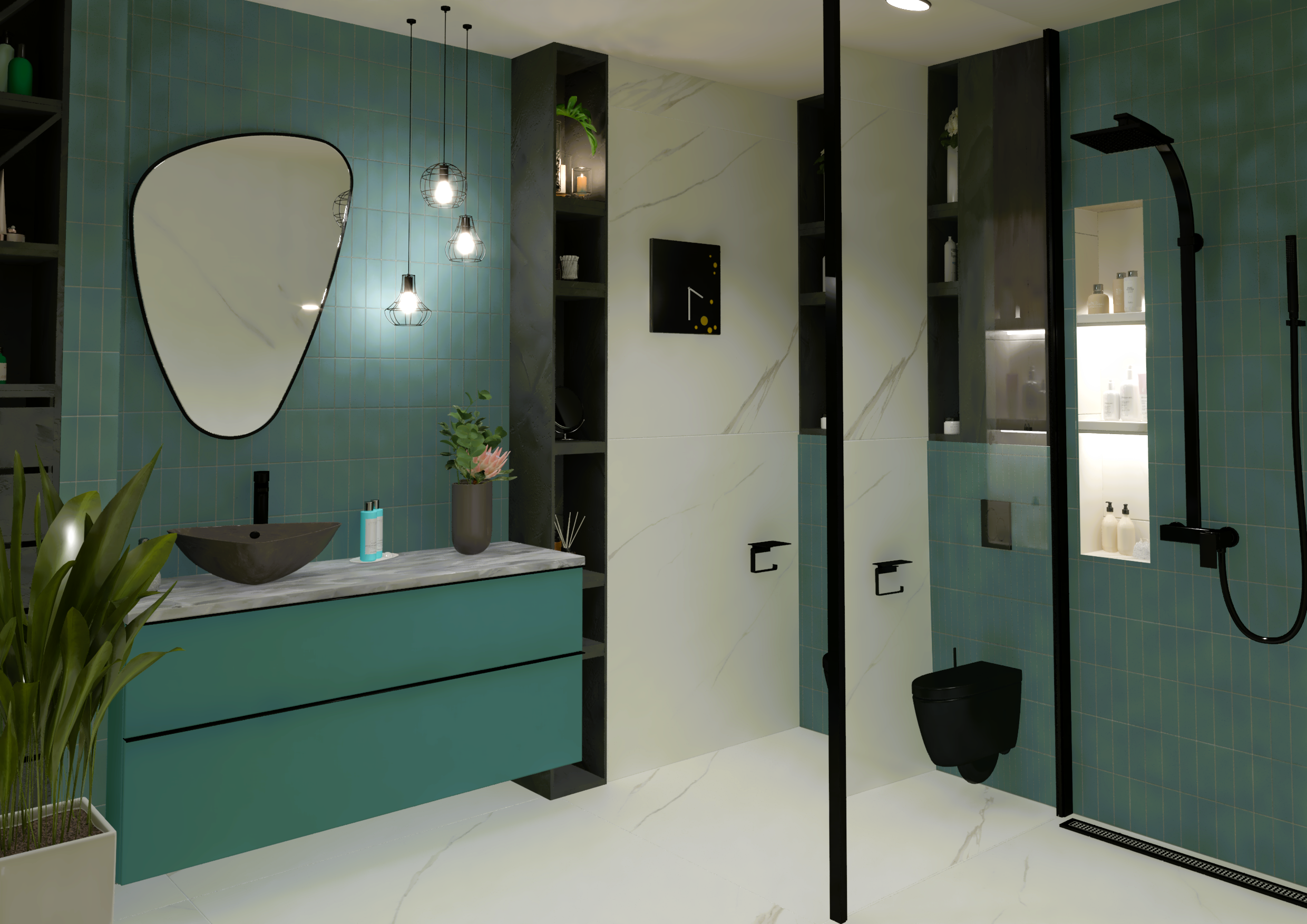 Burkolat: Atlas Concorde Marvel Meraviglia Calacatta 120*120 cm; Atlas Concorde Boost Color Teal 37*33 cm; Szaniter: Elita, Geberit, Sapho, Radaway, Radeco, Kludi