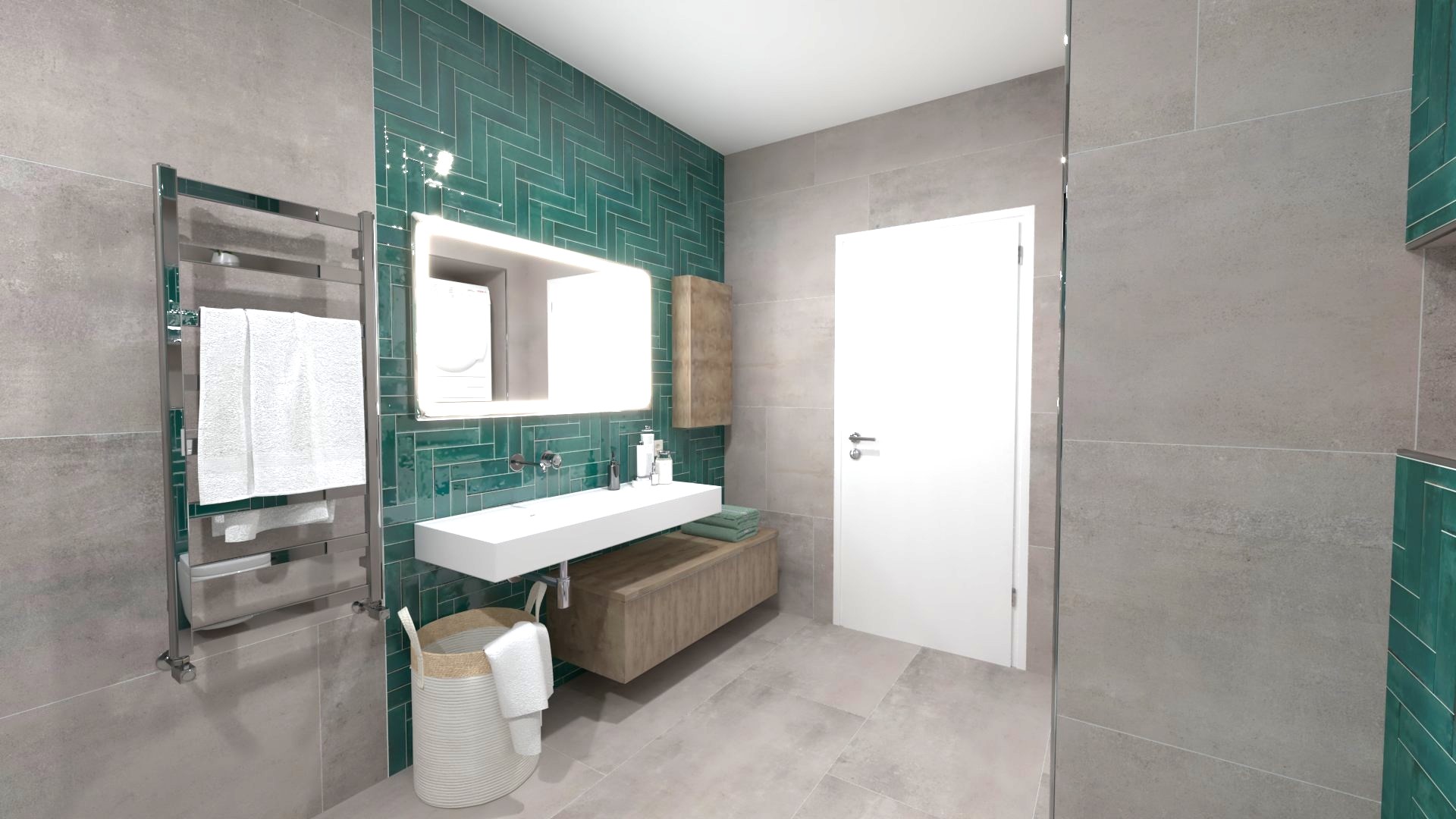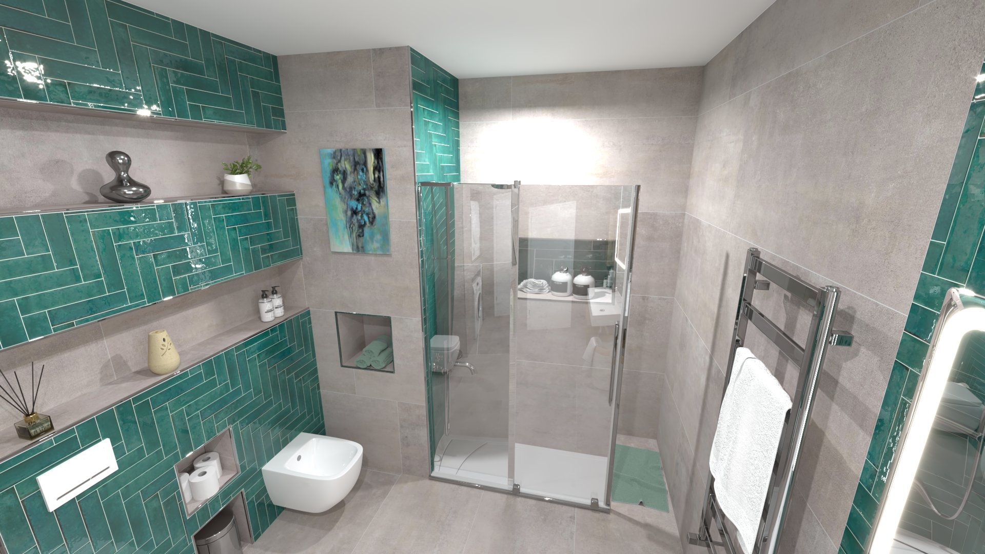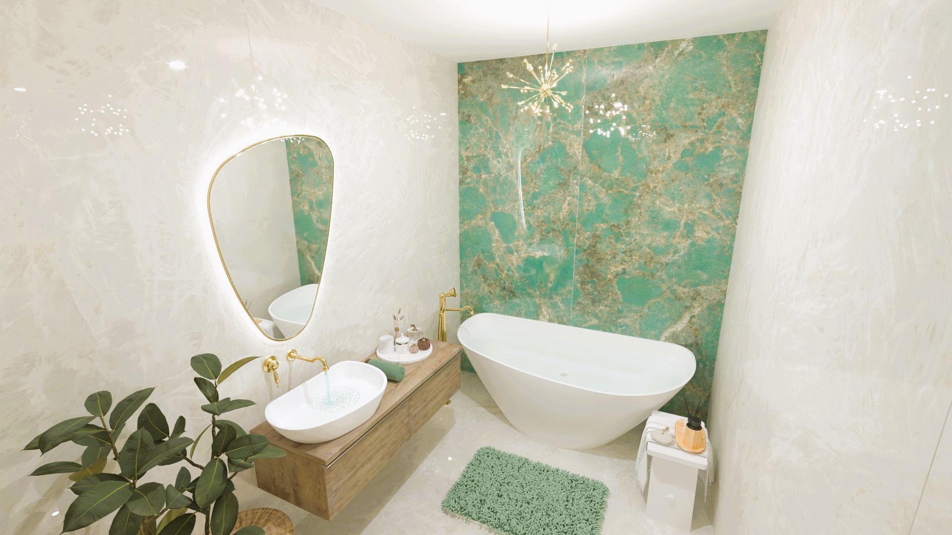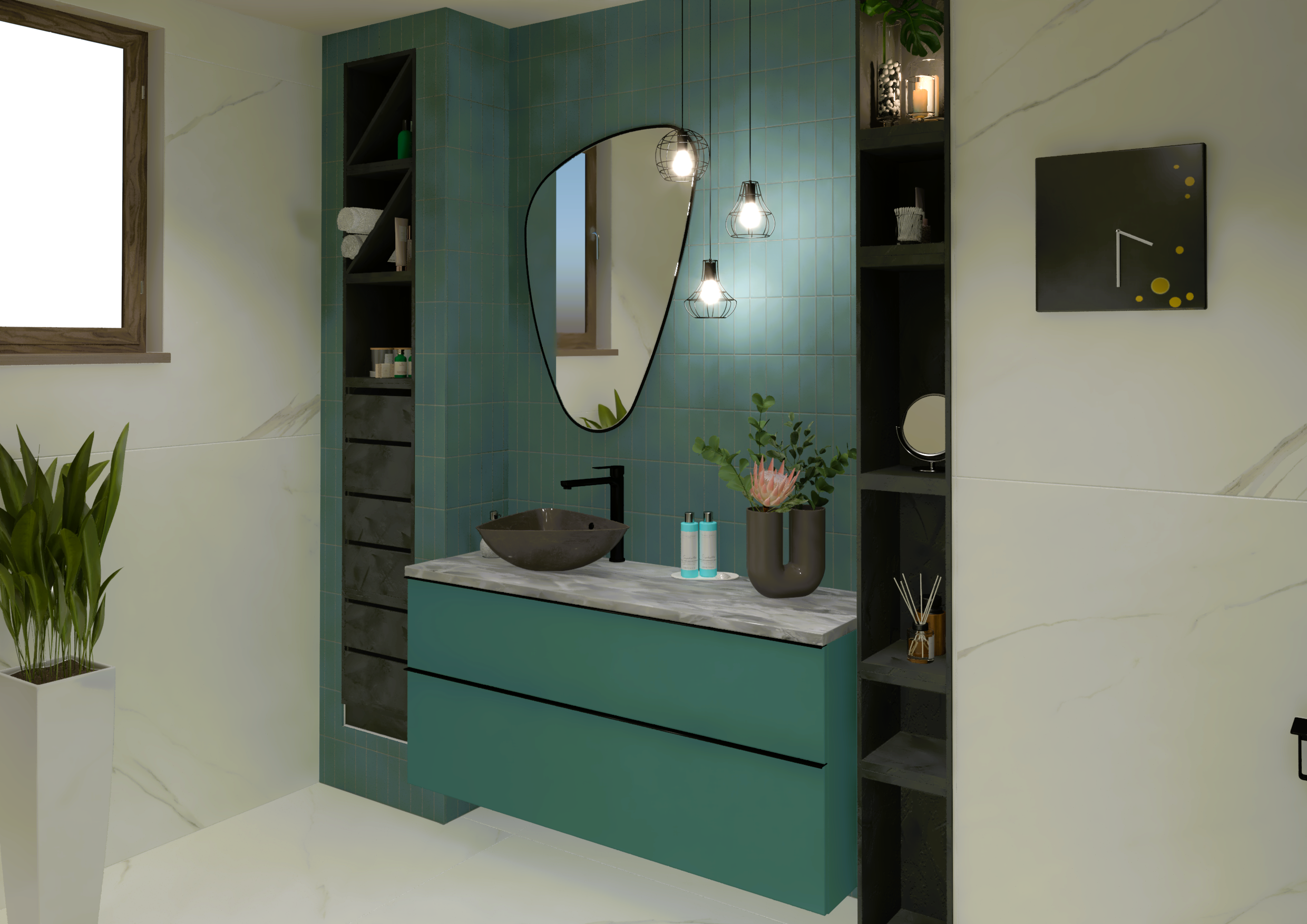 Burkolat: Atlas Concorde Marvel Meraviglia Calacatta 120*120 cm; Atlas Concorde Boost Color Teal 37*33 cm; Szaniter: Elita, Geberit, Sapho, Radaway, Radeco, Kludi