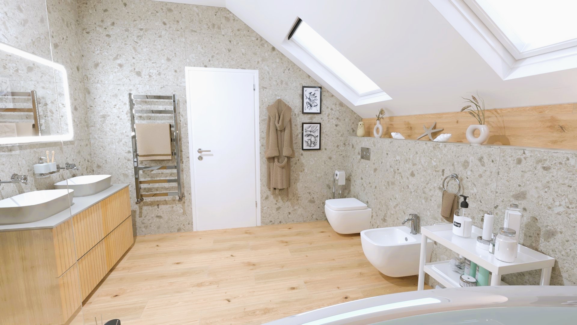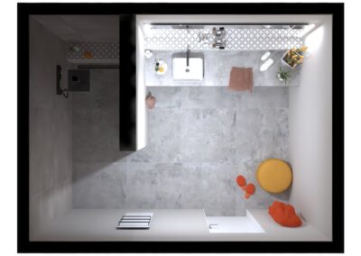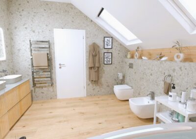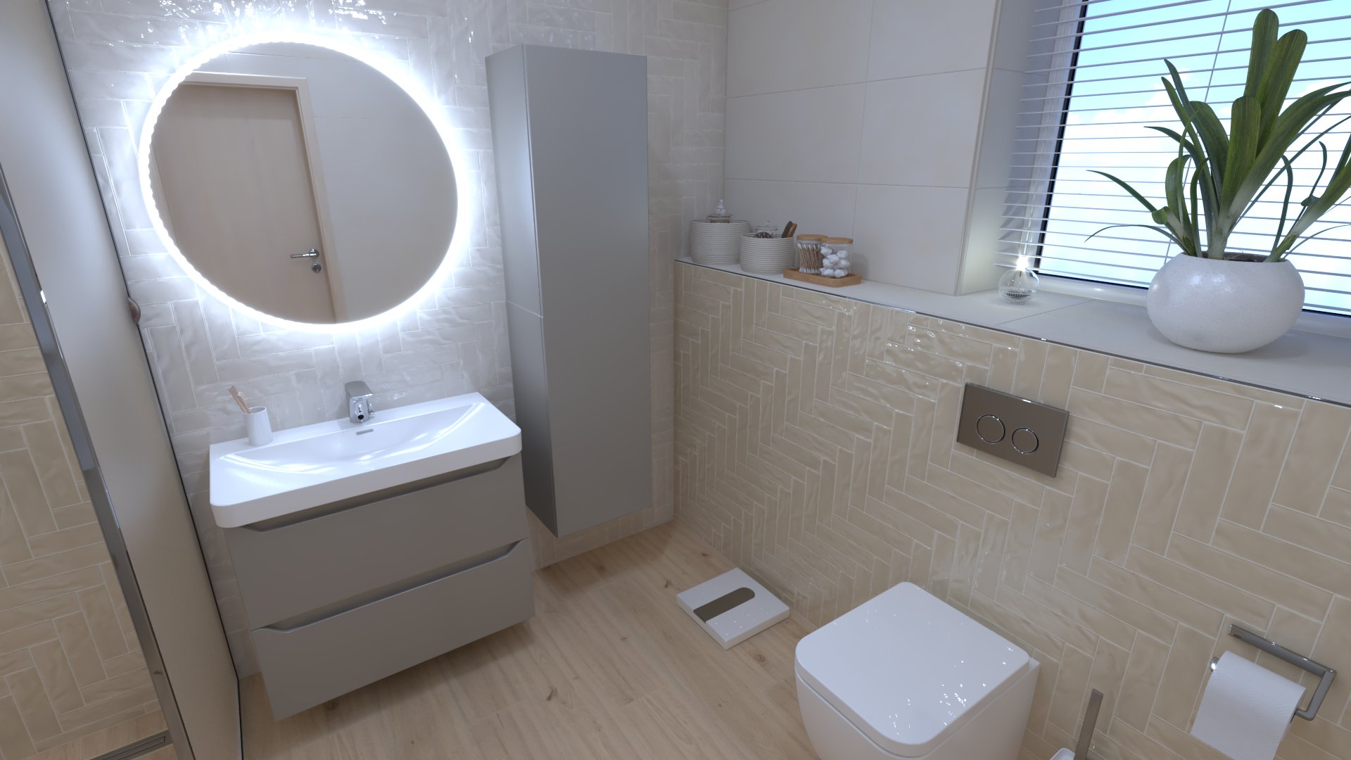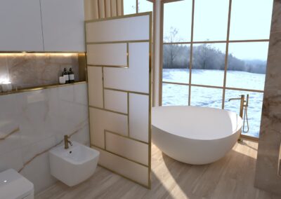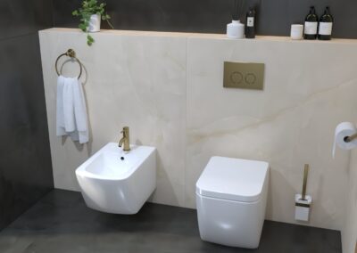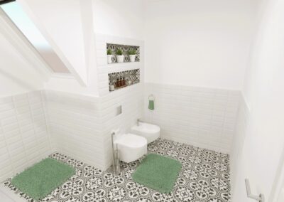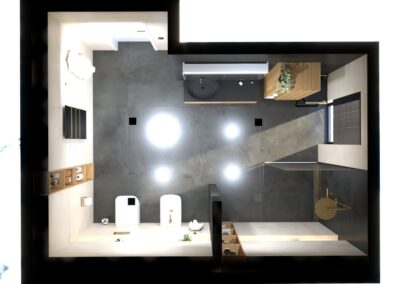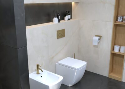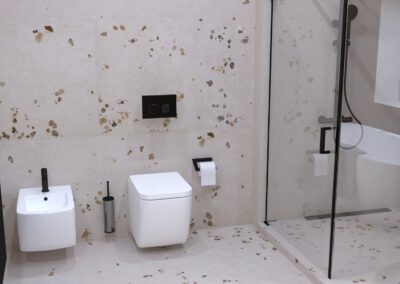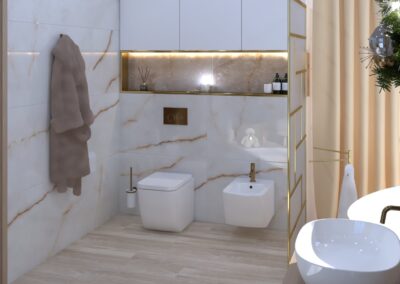 Burkolat: Coem Mea Lapis Play Avorio 30*60 cm; Coem Mea Lapis Play Sabbia 30*60 cm; Coem Mea Laois Avorio 60*60 cm; Coem Mea Lapis Sabbia 60*60 cm; szaniter: Méta, Elita, Hansgrohe, Sapho, Geberit , Radaway