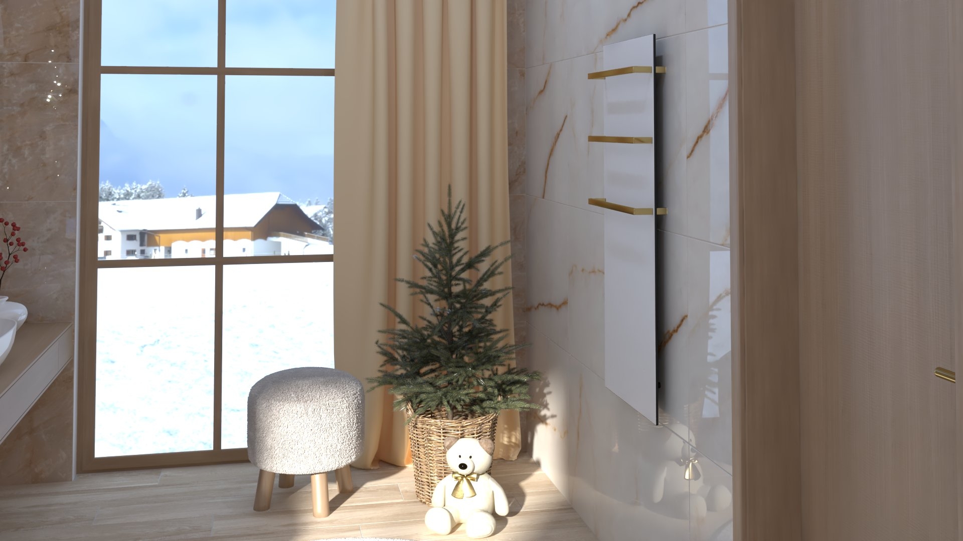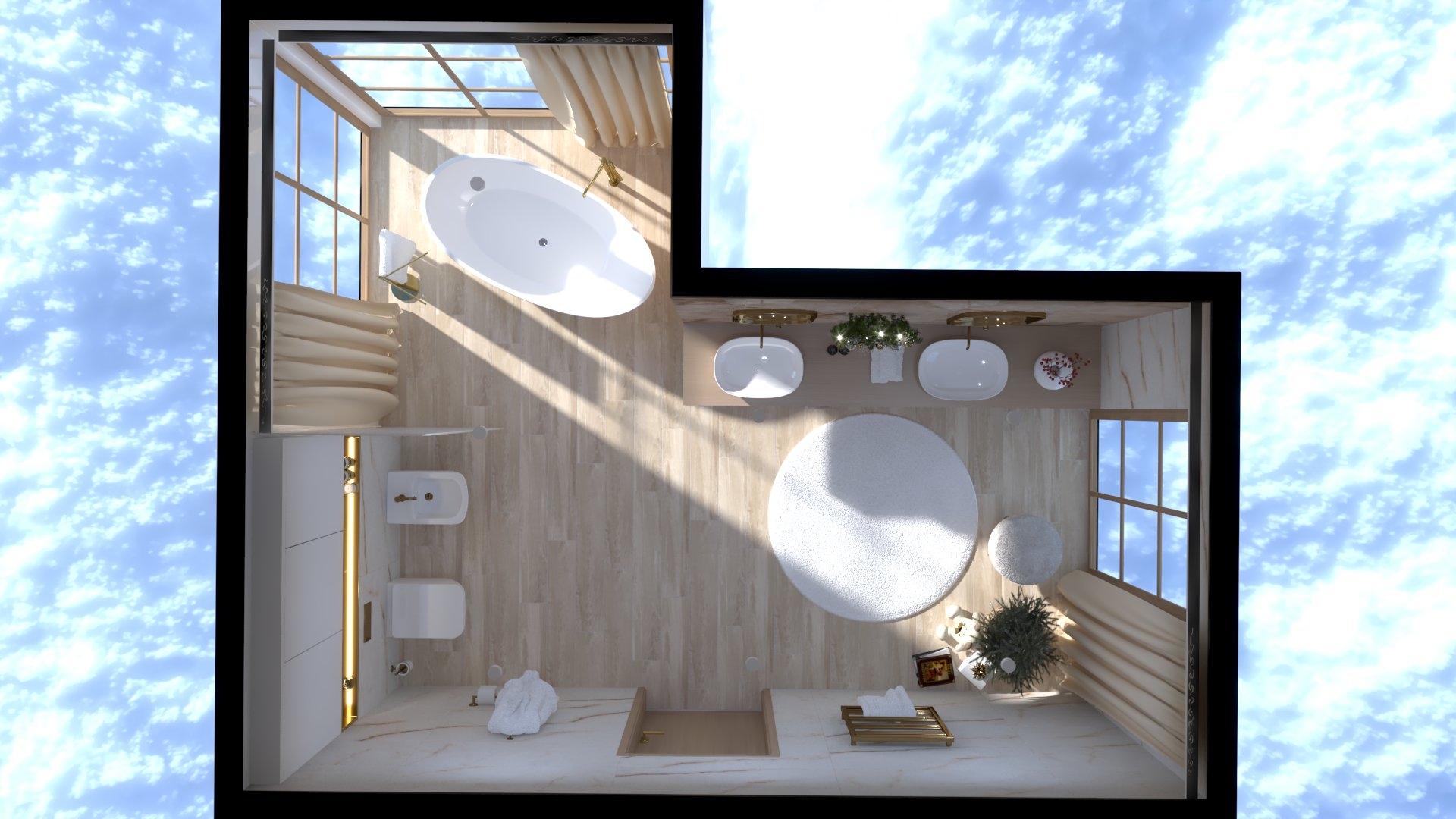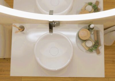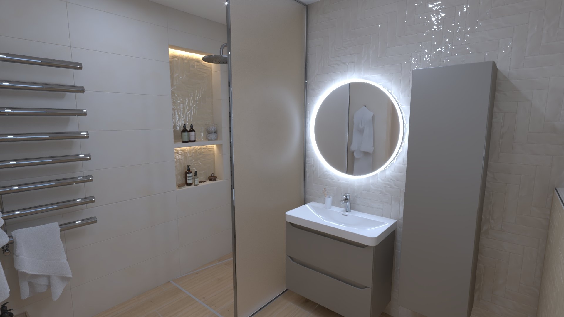 Burkolat: Coem Mea Lapis Play Avorio 30*60 cm; Coem Mea Lapis Play Sabbia 30*60 cm; Coem Mea Laois Avorio 60*60 cm; Coem Mea Lapis Sabbia 60*60 cm; szaniter: Méta, Elita, Hansgrohe, Sapho, Geberit , Radaway