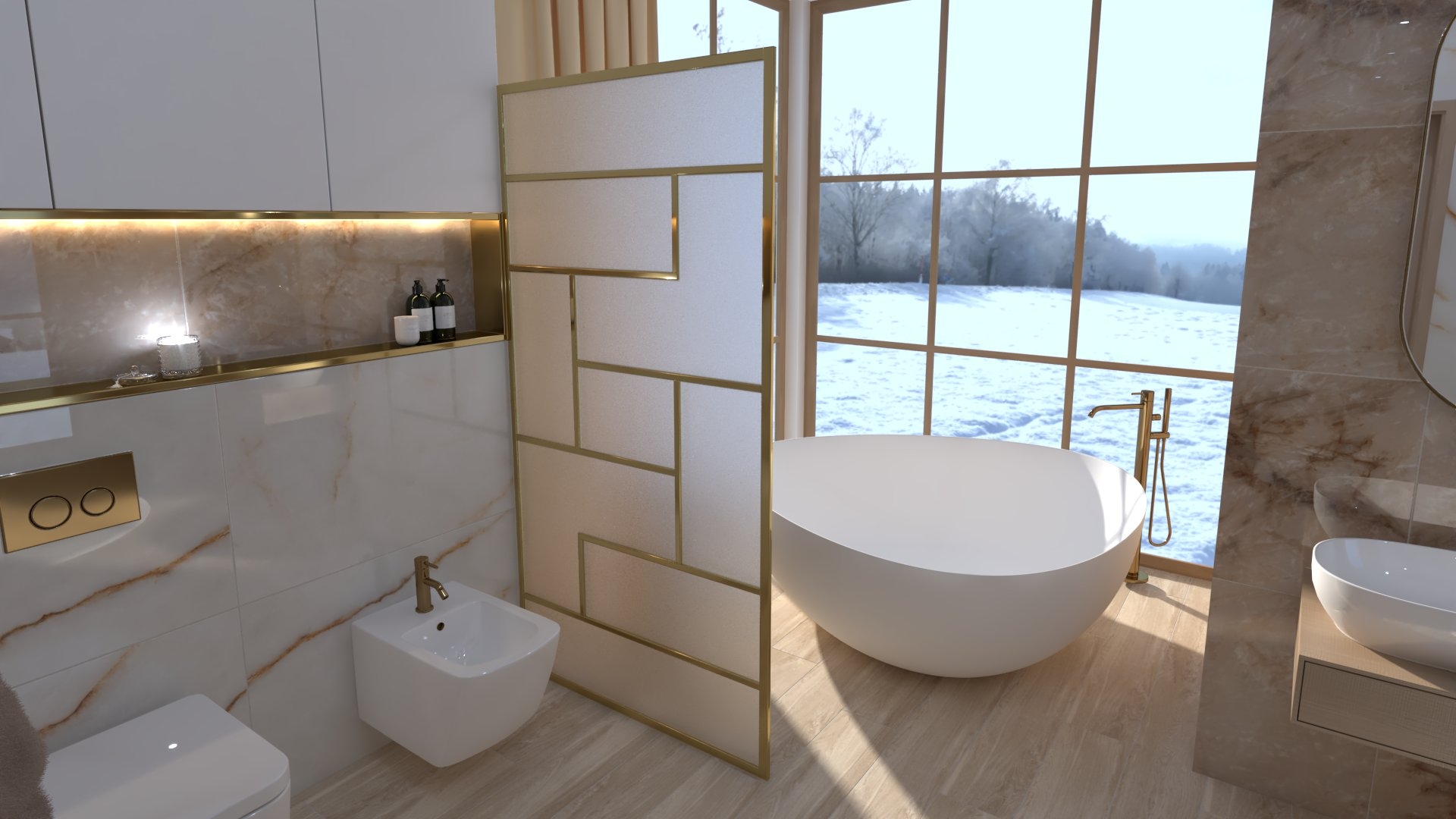 Burkolat: padlólap Atlas Concorde Diva Ice Crystal Matte Sensitech 60×120 cm ; falburkolat Atlas Concorde Diva Ice Crystal Polished 60×120 cm; csaptelepek: Bugnatese Oxford család arany színben; mosdó és kád, folyóka, radiátor: Arezzo Maryland család öntöttmárvány anyagból, aranyszínű folyóka 80 cm, horizont arany slim 1200×500-as radiátor; mosdó alatti szekrény és az álló szekrény , tükör és lámpa: Elita/Royo Look 120-as fényes fehér komód+matt fehér pult, For All 40 2D fényes fehér álló szekrény, Round 60-as LED tükör arany keret Indus 60 lámpa arany színben, 160-as classic tölgy színben; WC és bidé: Geberit gyártó Icon család; zuhanyajtó: Radaway Furo SL Walk-in 120 ajtó arany színben