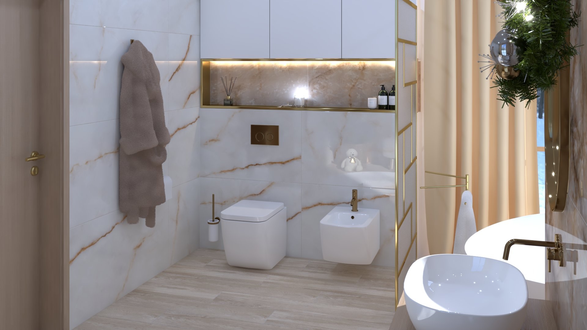 Burkolat rendelésre: Atlas Concorde Marvel Diva Ice Crystal 60×120 cm, fényes; Bútor rendelésre: Elita/Royo Look fényes fehér pulttal, Reni mosdóval aranyszínű fogantyúkkal, szennyeskosaras verzió, Square 80 Led tükör arany keret; WC+tartály készletről: Geberit Sigma tartály + nyomógomb, Gebertit ICON WC Csaptelepek rendelésre: Bugnatese Simple család PVD arany szín Folyóka készletről: Aco Comfort burkolható 785 cm