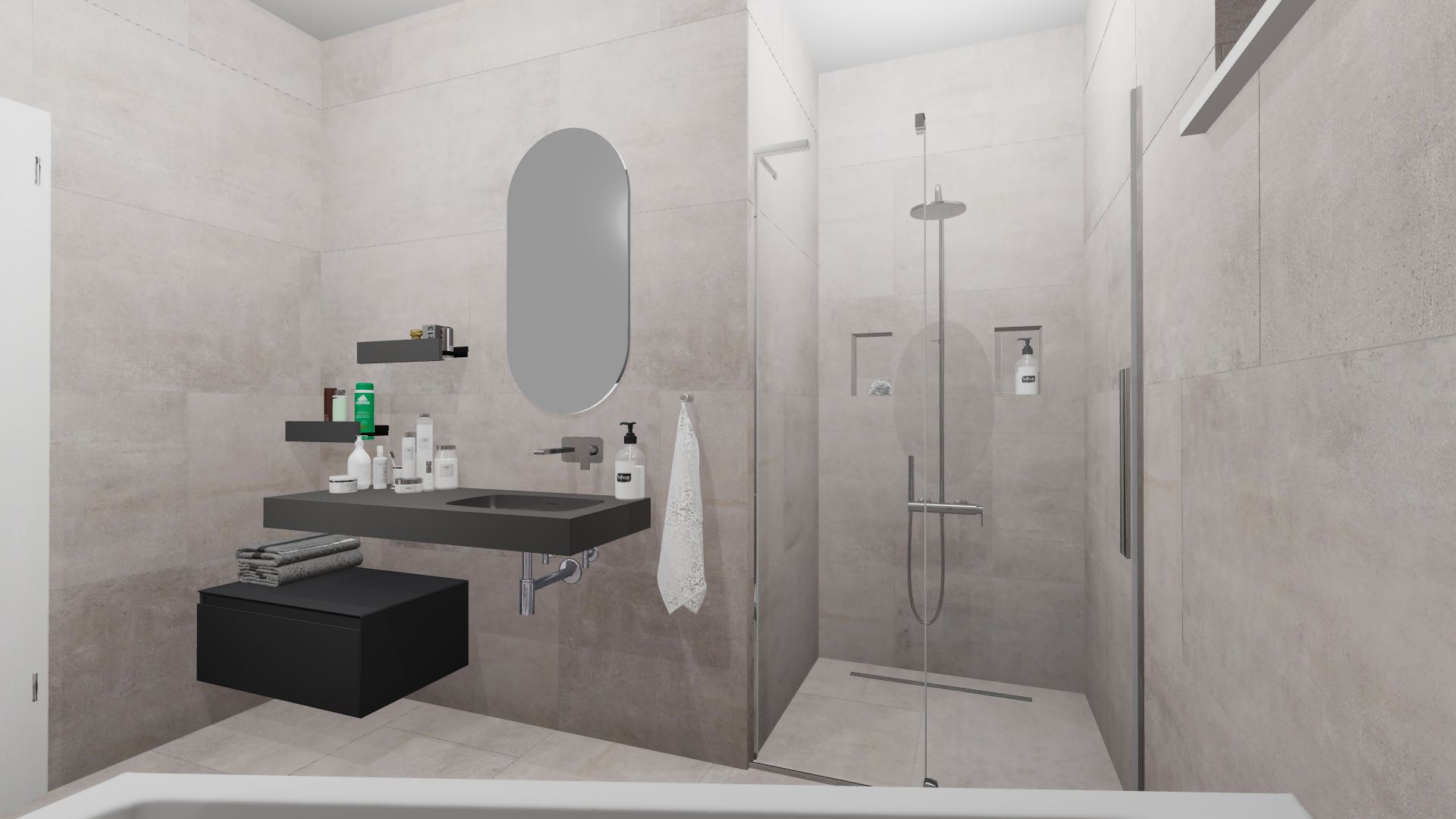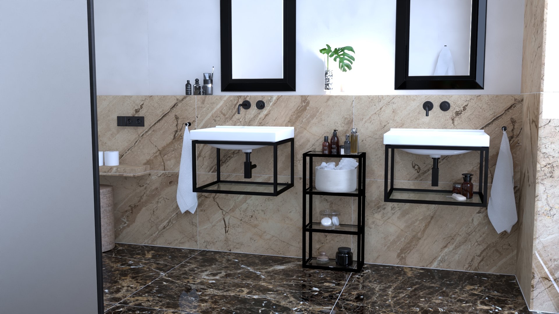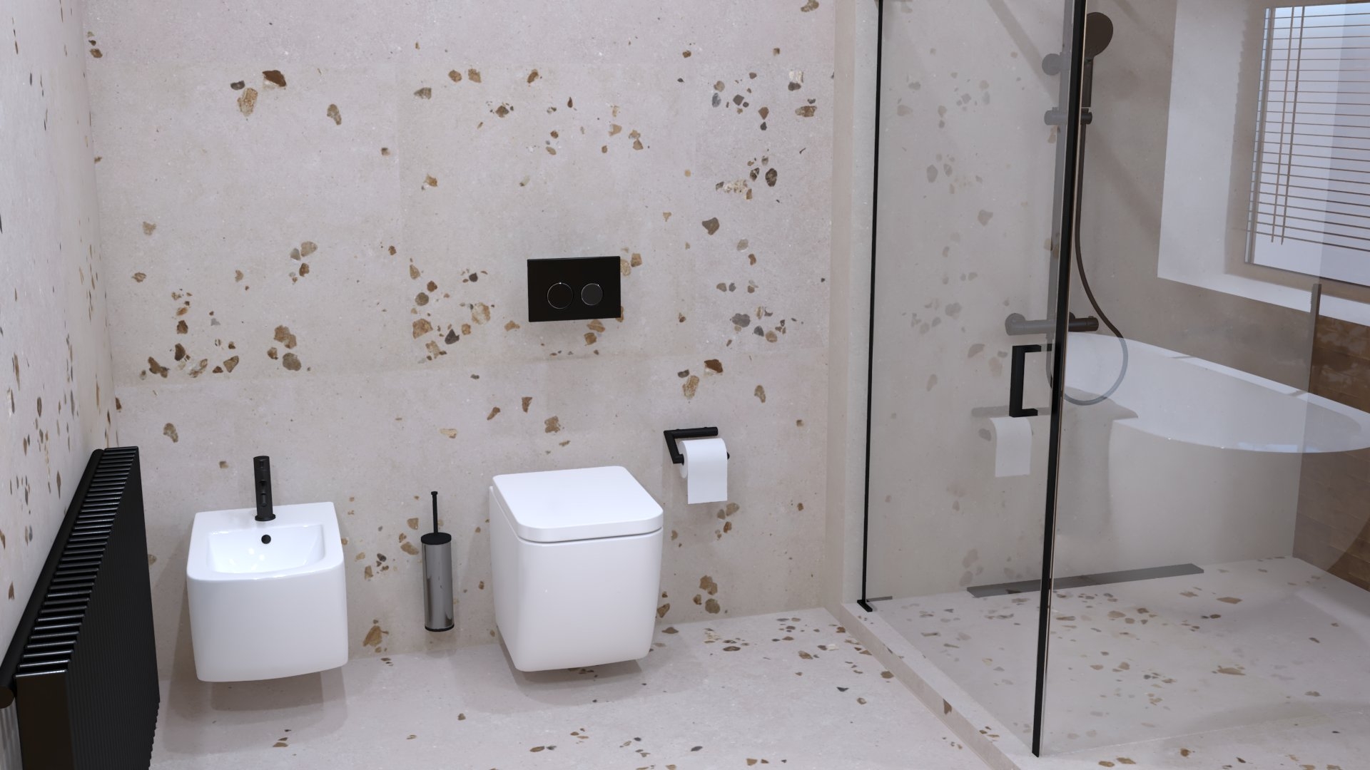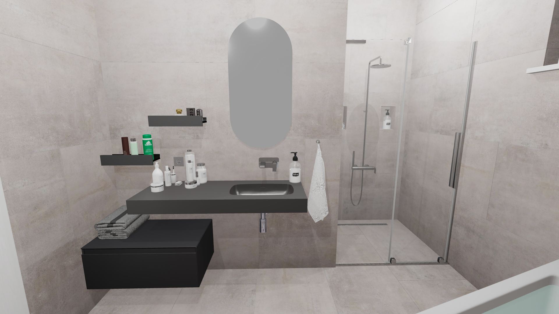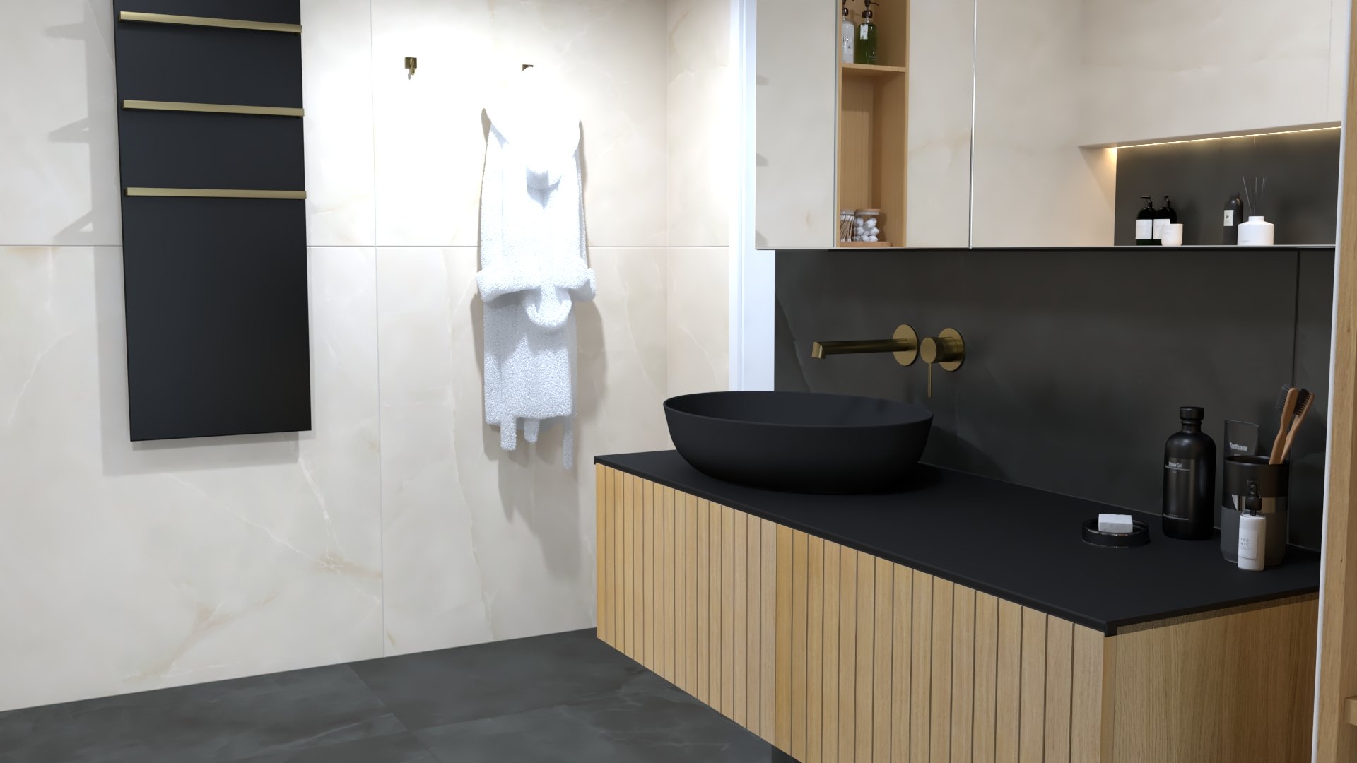 Burkolat: Saime Ferrocemento grigio matt 60*120 cm; Saime Ferrocemento nero matt 60*120 cm; szaniter: Elita, Radaway, Arezzo,Kludi