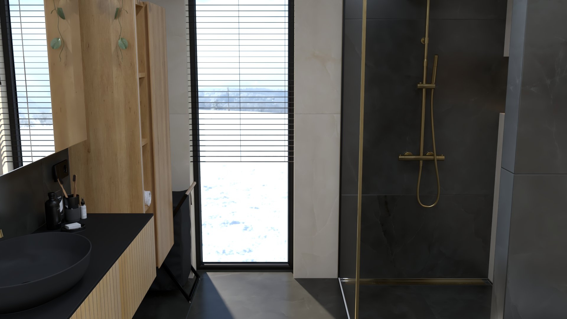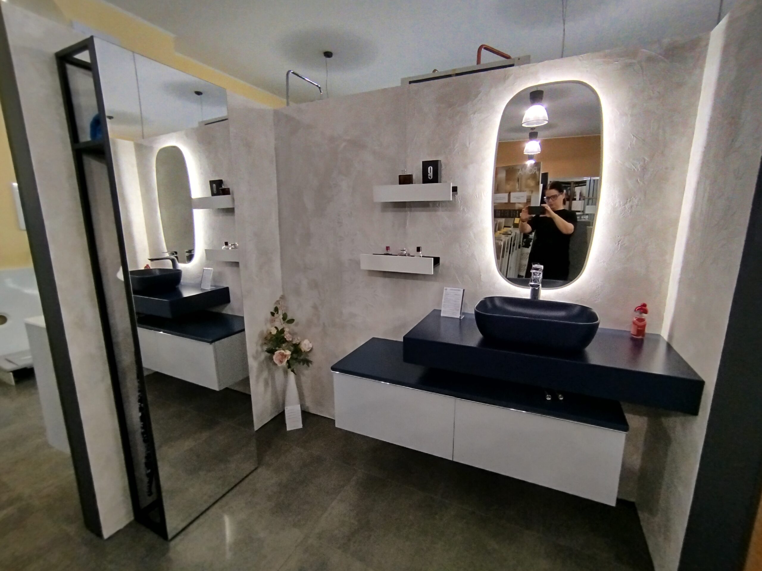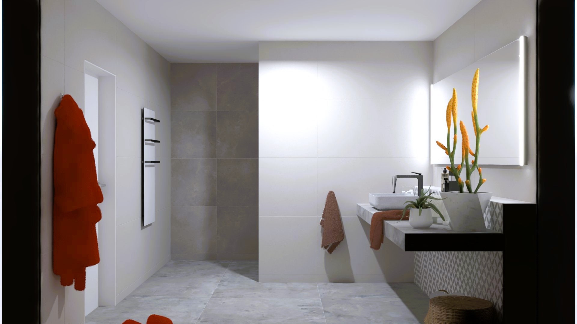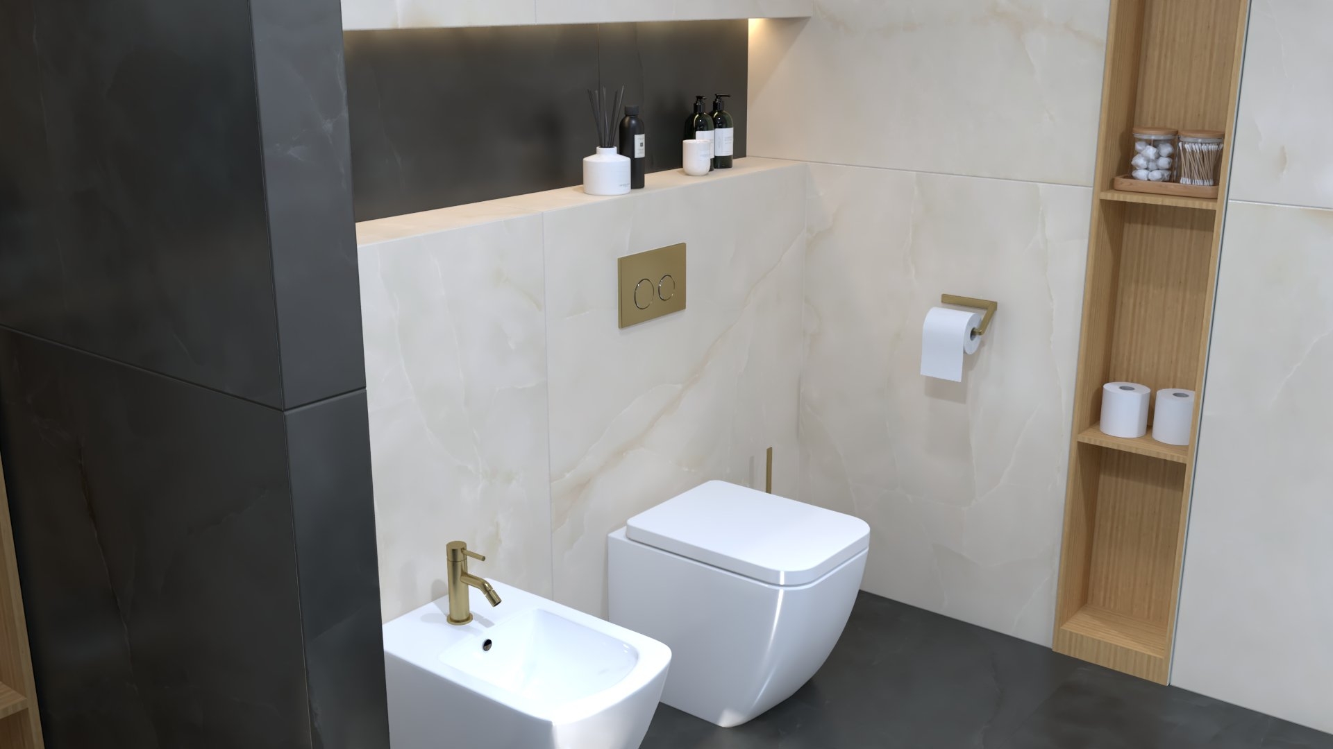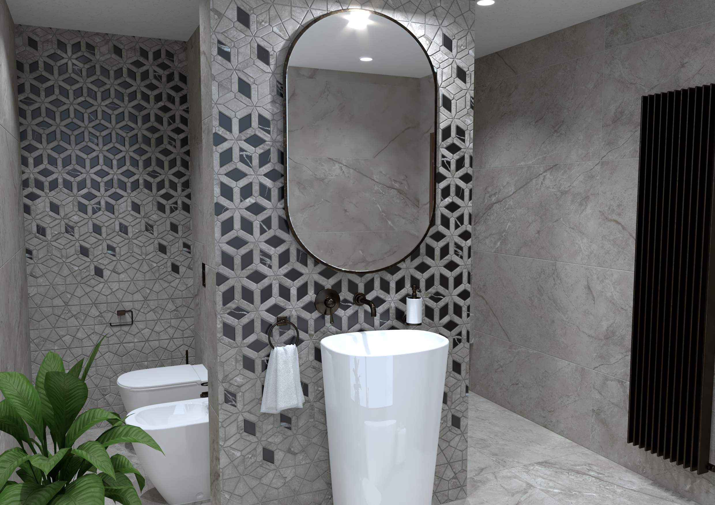 Burkolat: Saime Ferrocemento grigio matt 60*120 cm; Saime Ferrocemento nero matt 60*120 cm; szaniter: Elita, Radaway, Arezzo,Kludi