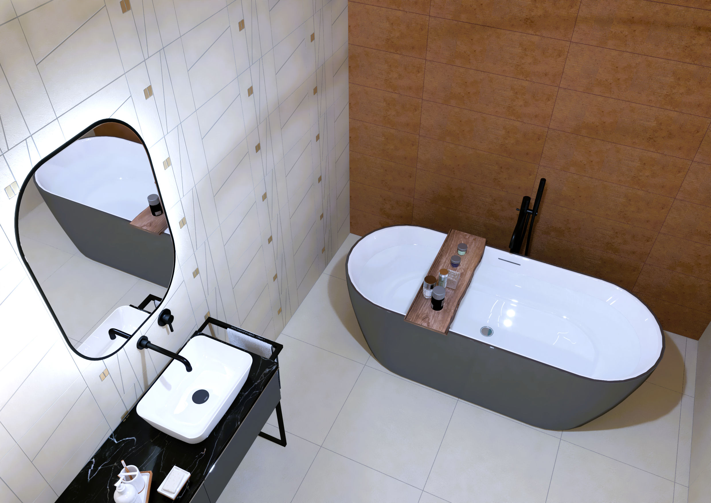 Burkolat: Sant’Agostino Mystic 120×60 cm család Dark és Pearl szín, bútor: Royo Split 120 cm antracit matt + Skappa 120 cm mosdó, 120-as Led Mia tükör; kád: M-acryl Relax 190×90 cm előlappal; zuhanyajtó rendelésre: Radaway Furo SL DWJ 120-as króm; csaptelepek: Bugnatese B-Color család króm Radiátor rendelésre: Arezzo Cube chrome 120×50 cm