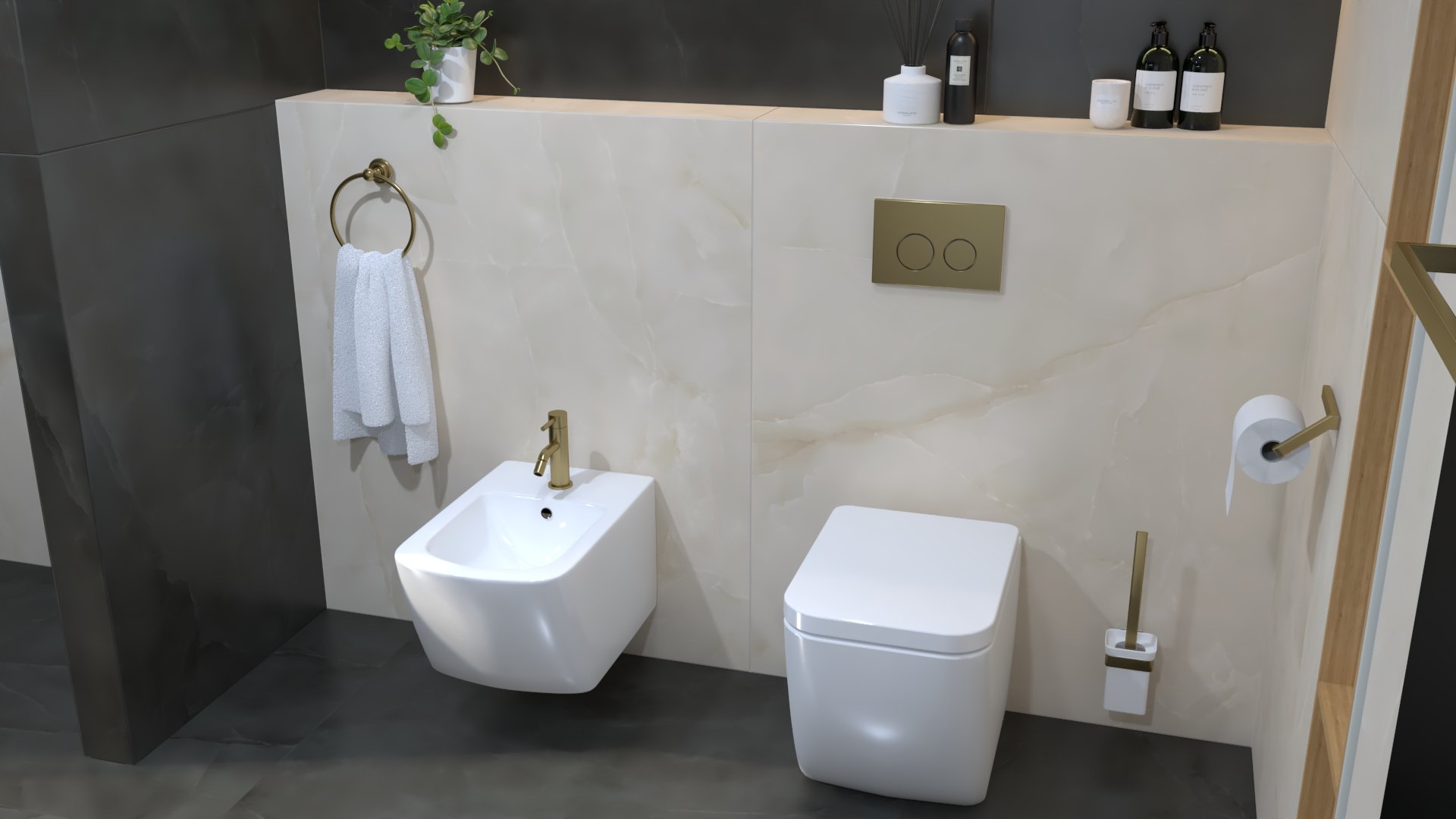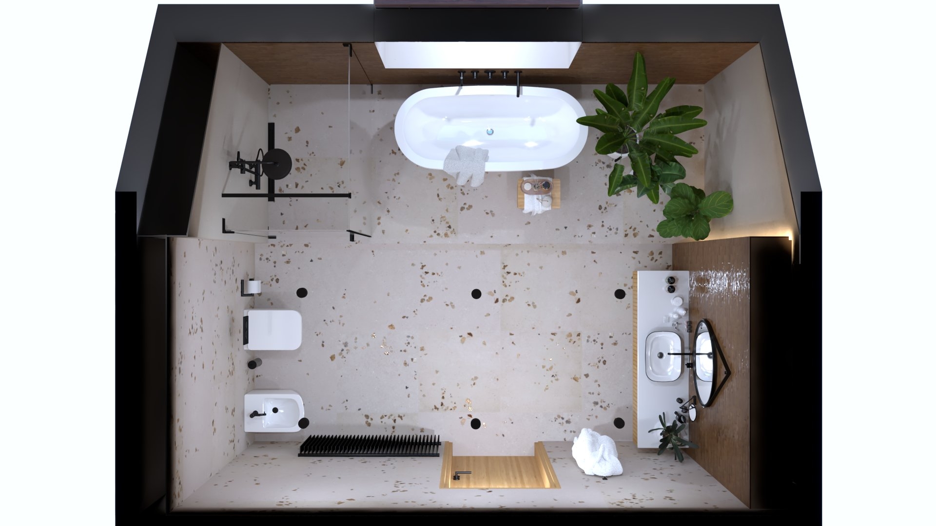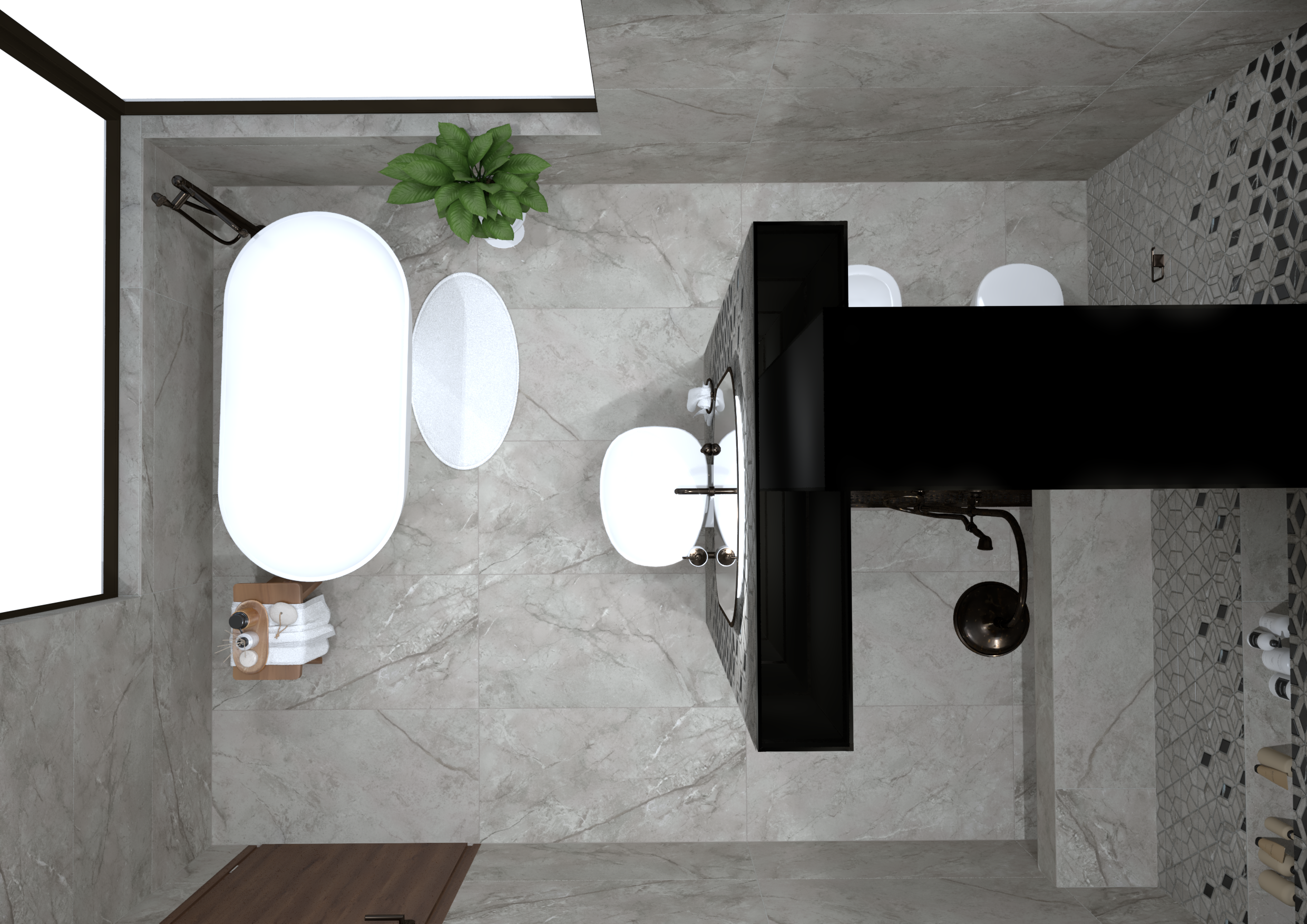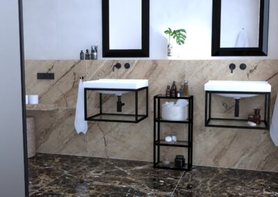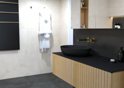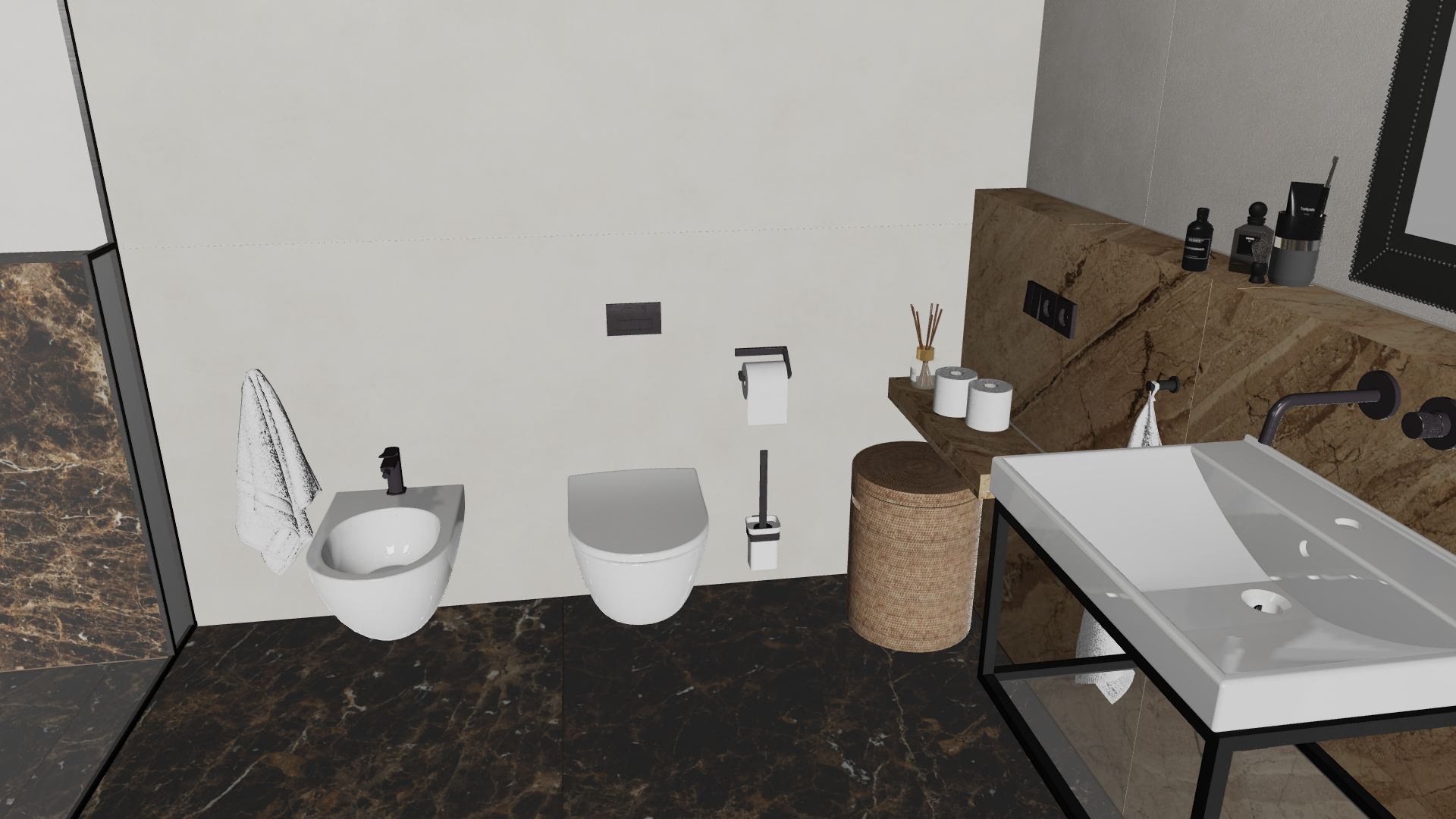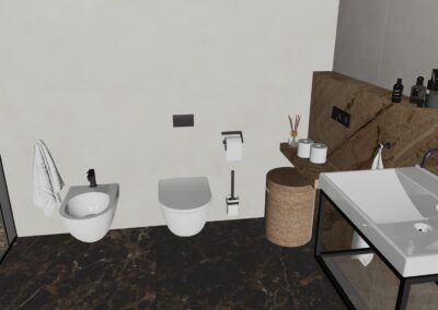 Padló burkolat: : Atlas Concorde LOG Icon szín 20×120 cm; falburkolat rendelésre: Atlas Concorde Marvel Calacatta Meraviglia selyemfényű szín 60×120 cm; bútor rendelésre: Elita/Royo Asami család fekete foganytyúval, Skappa mosdóval , 120-as tükör fekete kerettel, 80-as fekete lámpával WC+tartály készletről: Geberit Sigma tartály + nyomógomb, Geberit ICON WC Csaptelepek rendelésre: Bugnatese Simple család PVD fekete szín; Folyóka : Aco Comfort feketeráccsal 785 cm; Radiátor : Radeco Bruno Merkury 7 színben