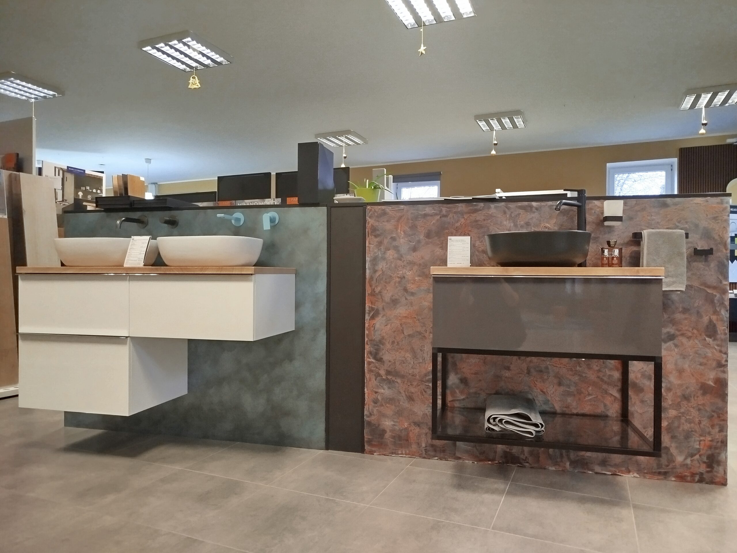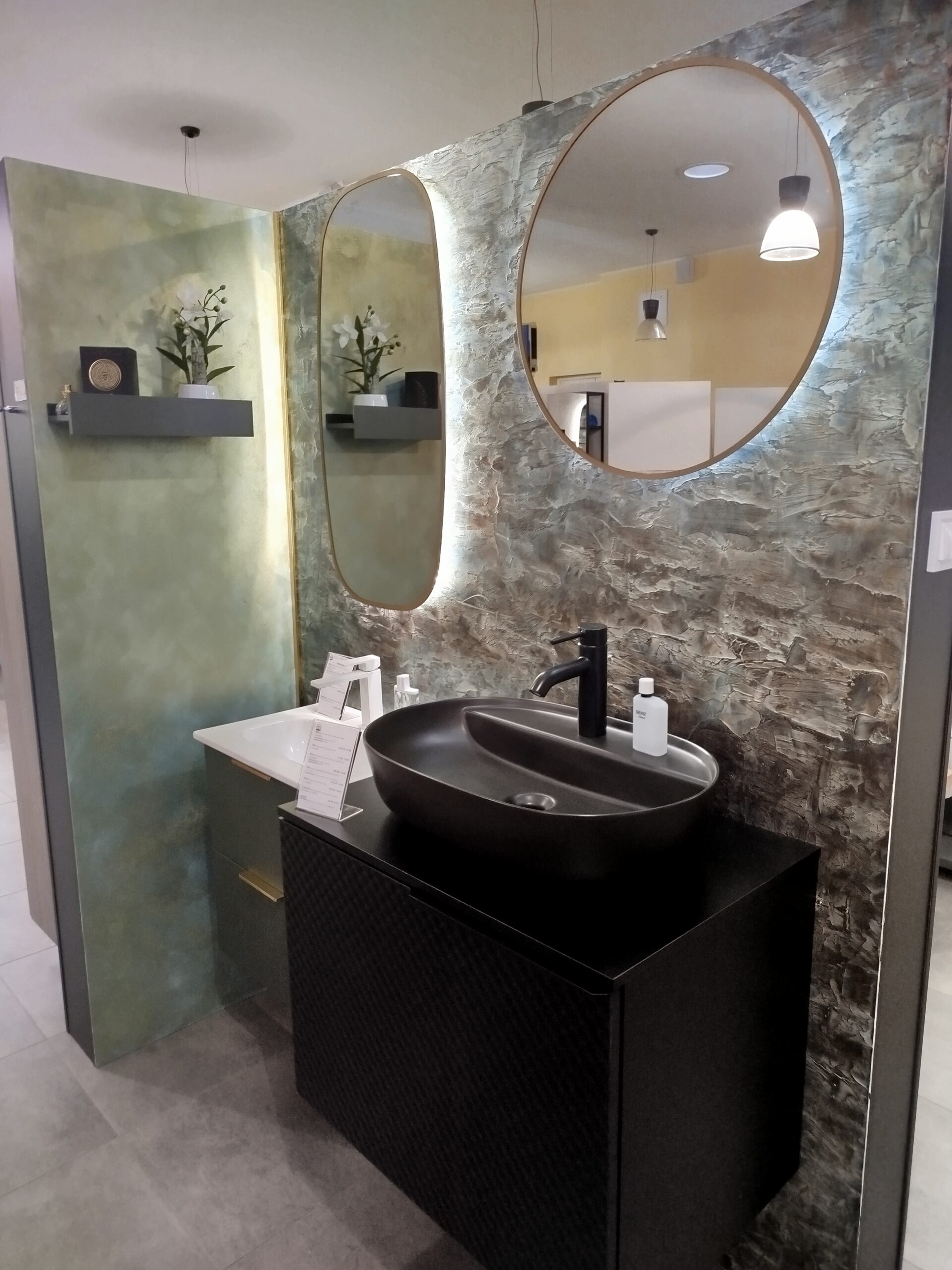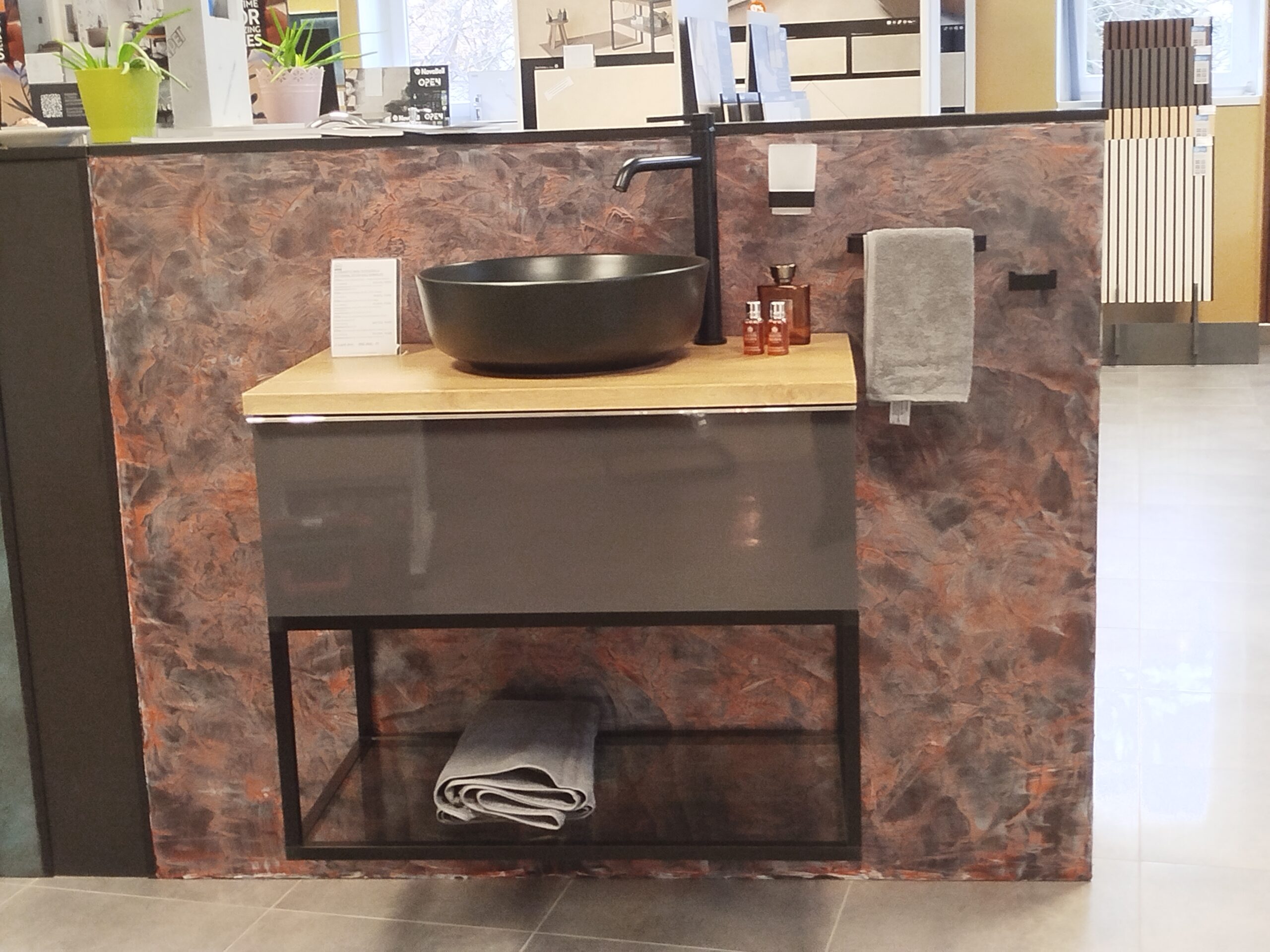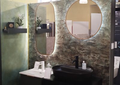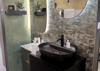 Fürdőszobaszalonunk megújult boxai, a háttér Valpaint olasz dekor falfesték, üzletünkben kapható.