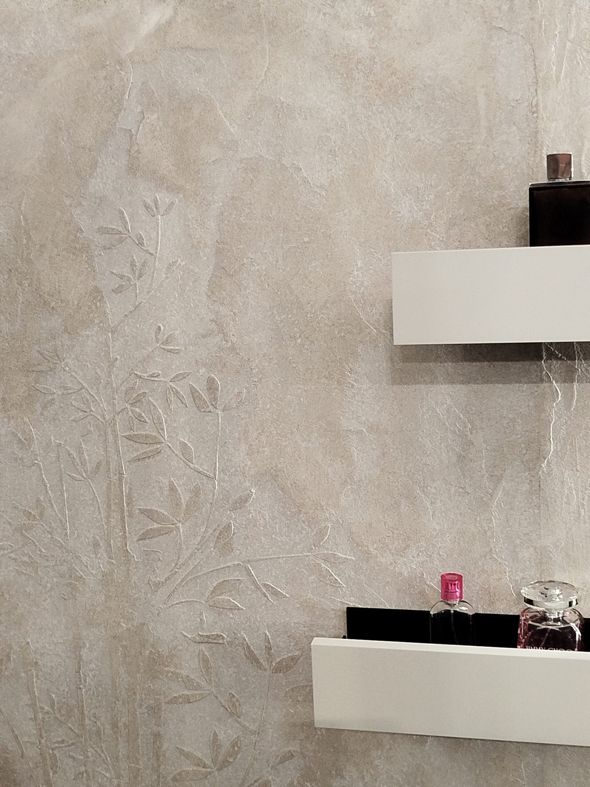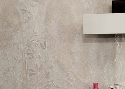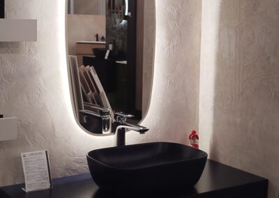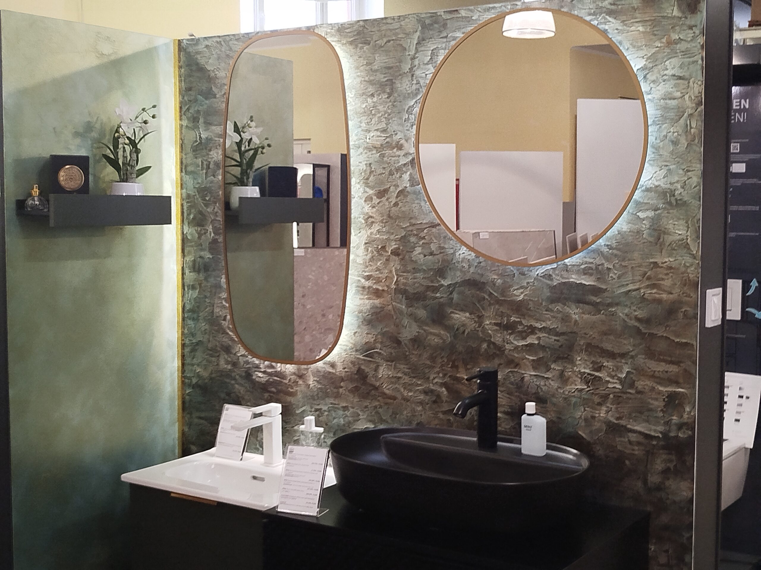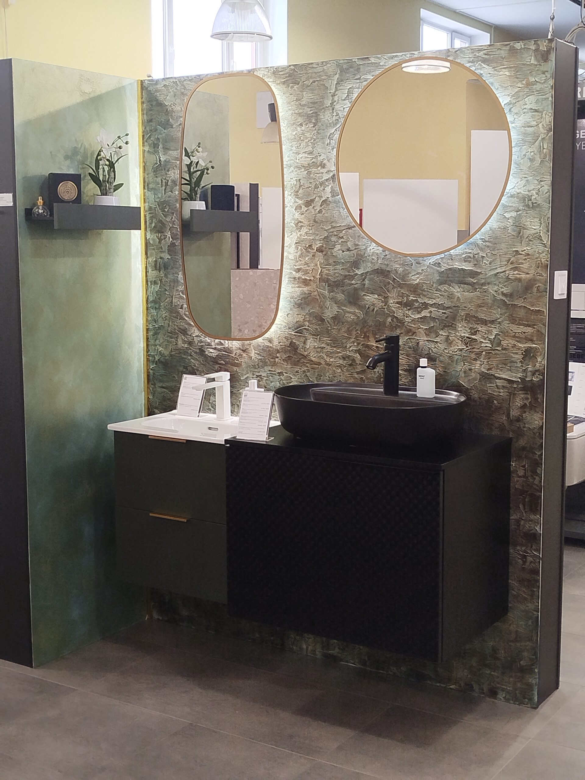 Fürdőszobaszalonunk megújult boxai, a háttér Valpaint olasz dekor falfesték, üzletünkben kapható.