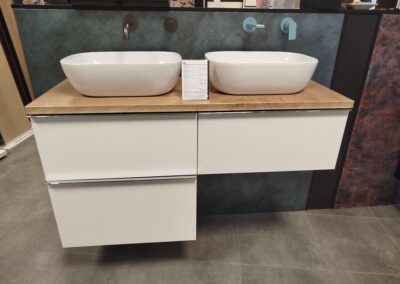 Padlólap készletről: Atlas Concorde Log 20×120 cm; falburkolat rendelésre: Savoia Italia Botanica család 25×75 cm fényes; bútor rendelésre : Royo Split 100-as; Forest green Skappa 100-as aszimmetrikus mosdó, 100-as Lina LED tükörrel, For all matt fehér fali magas szekrény; Csaptelepek rendelésre: Kludi Pure&Style család króm A-QA-zuhanyfej; Radiátor rendelésre: Arezzo ONYX 3 Blak matt 47,1×120 cm WC rendelésre: Arezzo Arizona + ülőke WC tartály+ nyomógomb rendelésre: Geberit gyártó terméke Folyóka készletről: Aco burkolható Comfort folyóka 78,5 cm