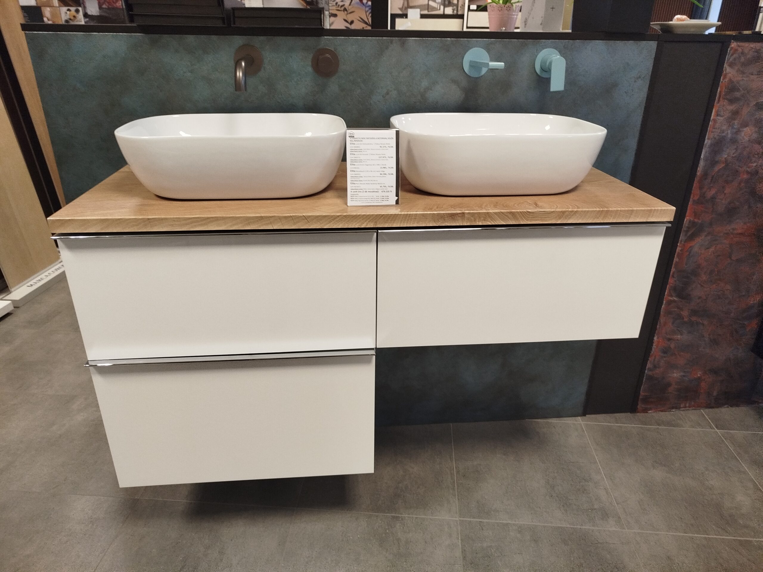 Türkiz burkolat : Ragno Look 6×24 cm Turchese csempe; szürke burkolat : Novabell Open Grigio 60×120 cm padlólap; Zuhanyajtó/fal: Radaway Furo SL Walk-in 120-as króm; WC bidé és radiátor: Arezzo OHIO család, a radiátor Cube Crome 120×50 cm; Nyomógomb és tartály : Geberit Duofix tartály és Sigma nyomógomb; Bútor és a mosdó: Royo Look család For All fali szekrény 120-as LED lámpa; Csaptelepek: Bugnatese B-Color króm család