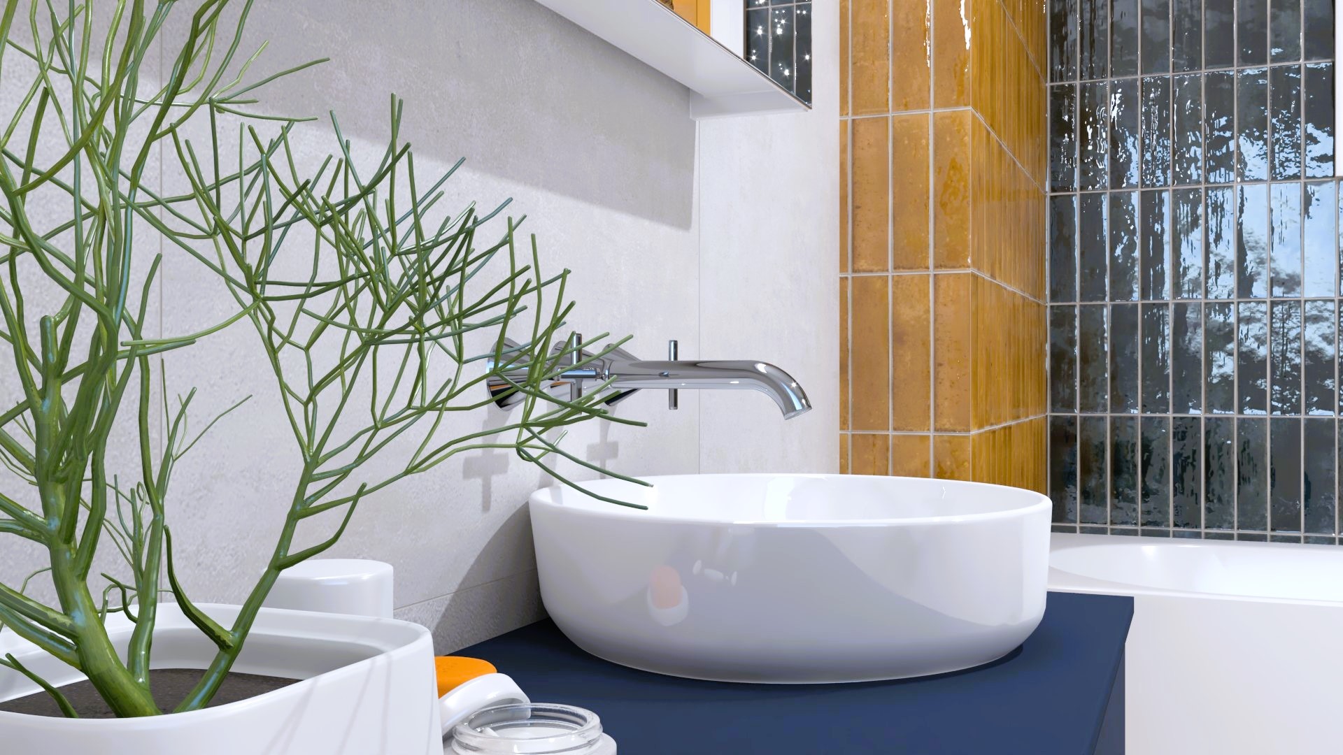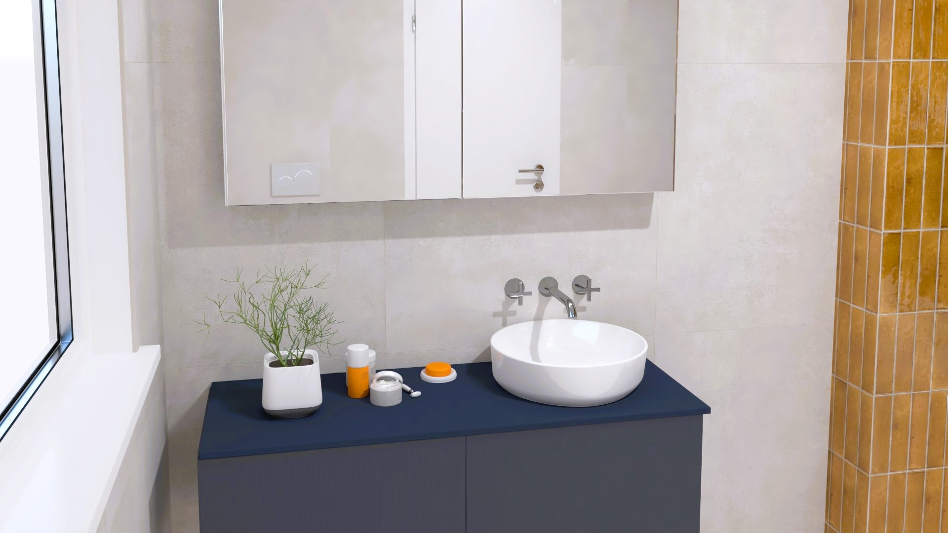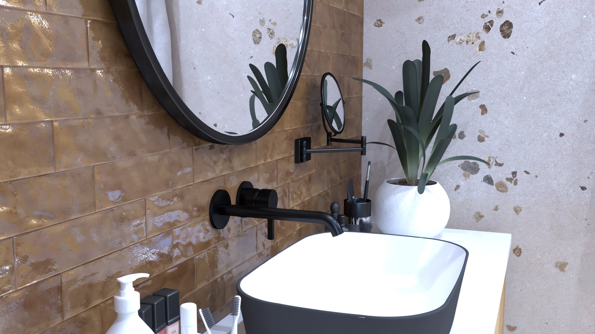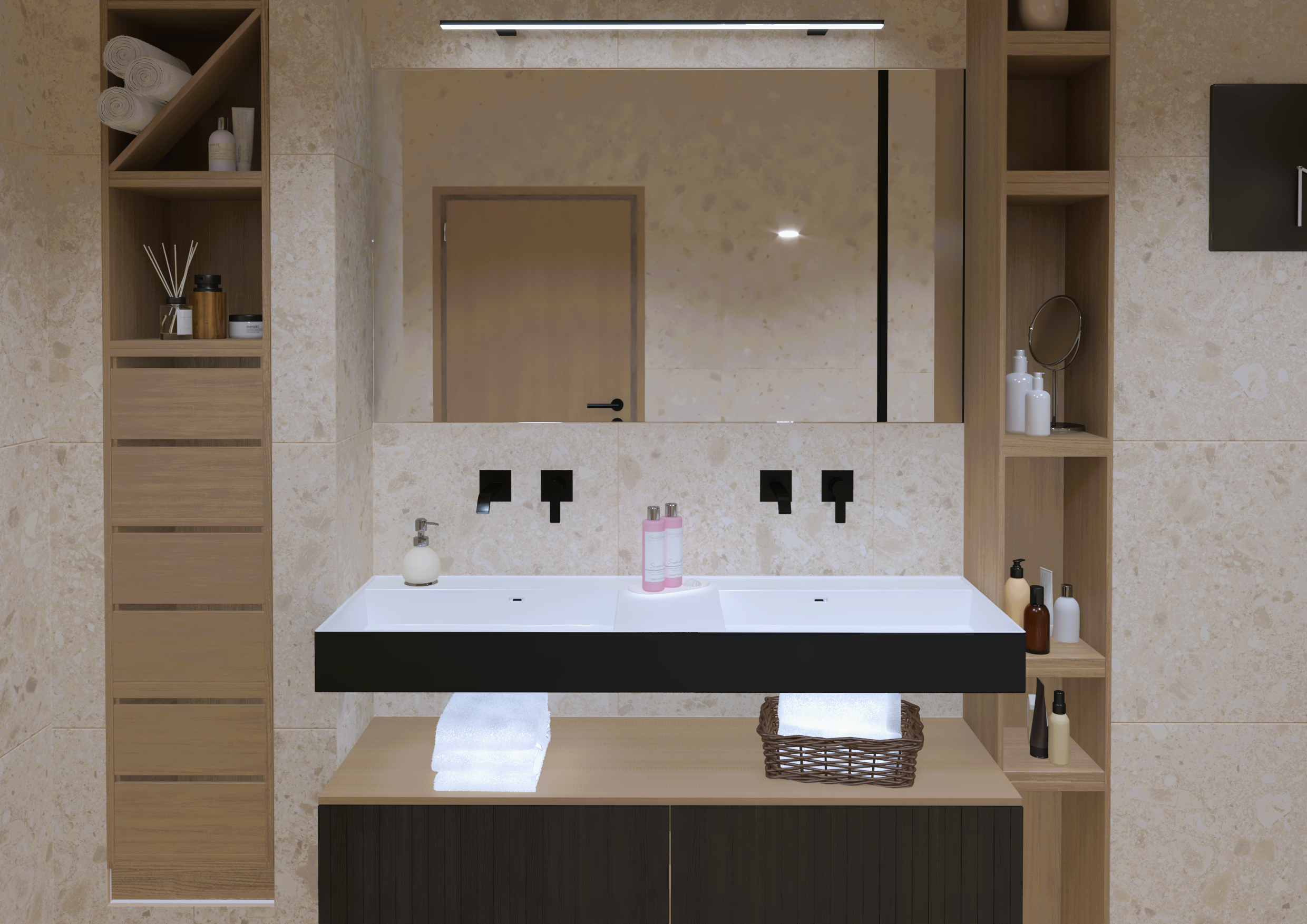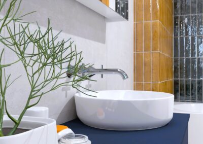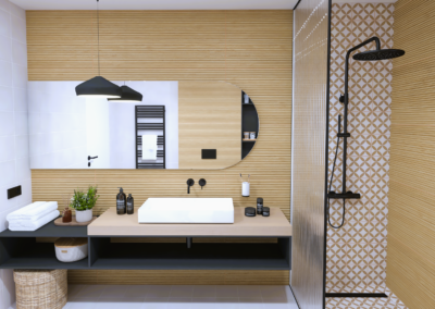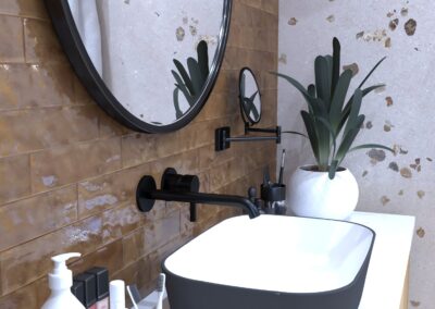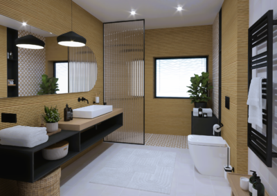 Burkolat rendelésre: Atlas Concorde Boost Pro 40×80 cm; Mustard és Ivory színek, padló Boost Pro Ivory 60×60 cm; bútor rendelésre: Elita/Royo Indus család; Maxxi mosdó; kerek fekete keretes LED-es tükör; csaptelepek rendelésre: Kludi Pure&Style fekete család; Logo fekete zuhanyrendszer; WC tartály és nyomógomb rendelésre: Geberit WC tartály+Sigma nyomógomb; WC rendelésre: Arezzo Arizona fekete WC és ülőke