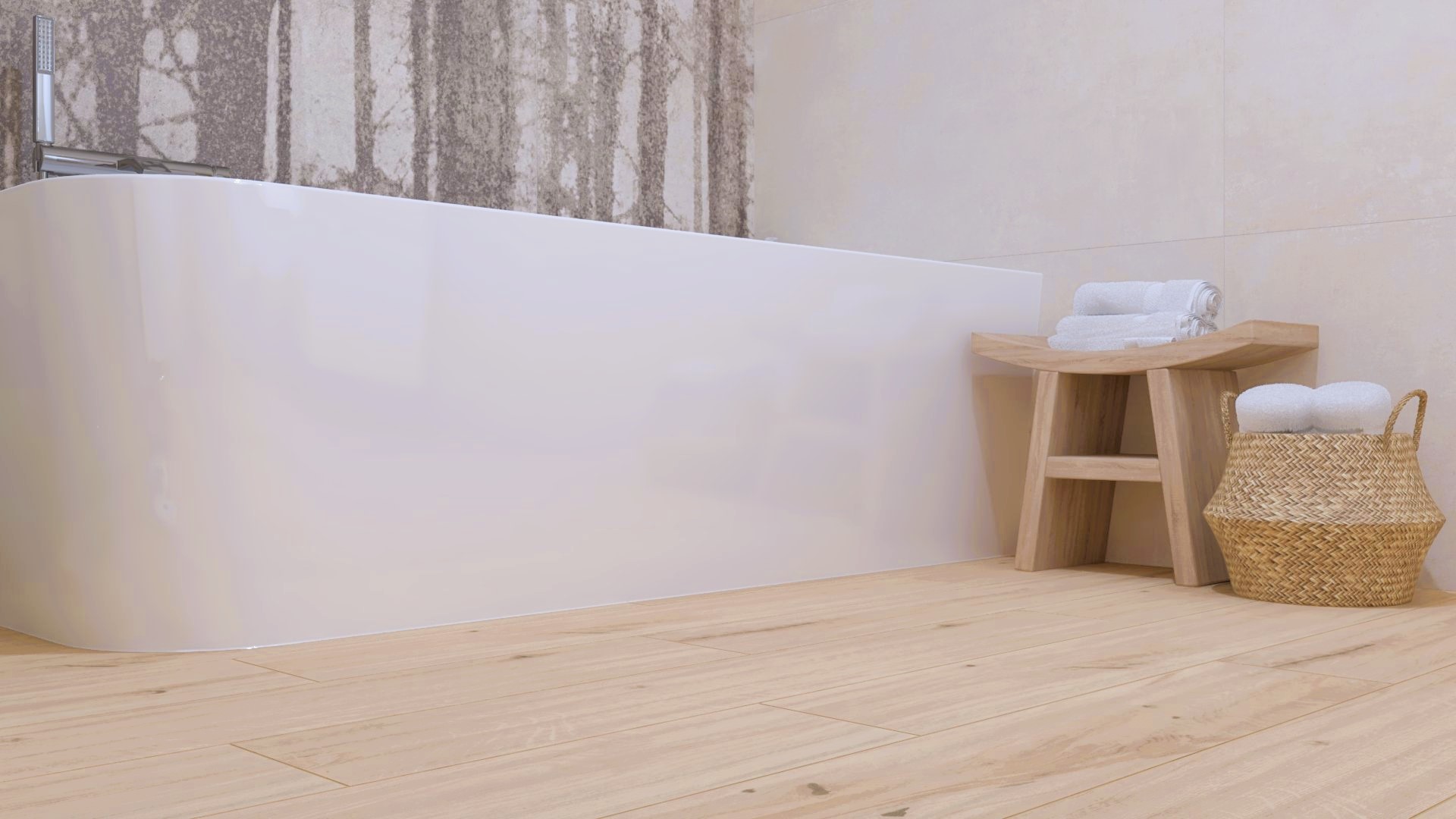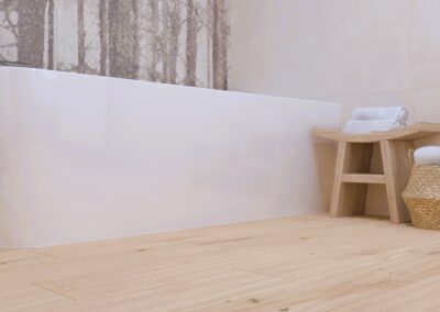 Burkolat: Novabell Eiche Natur 20*120 cm; Fap Lumina White Gloss 25*75 cm; Fap Lumina White Curve Gloss 25*75 cm; Szaniter : Elita, Hansgrohe, Radaway, Geberit