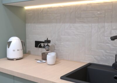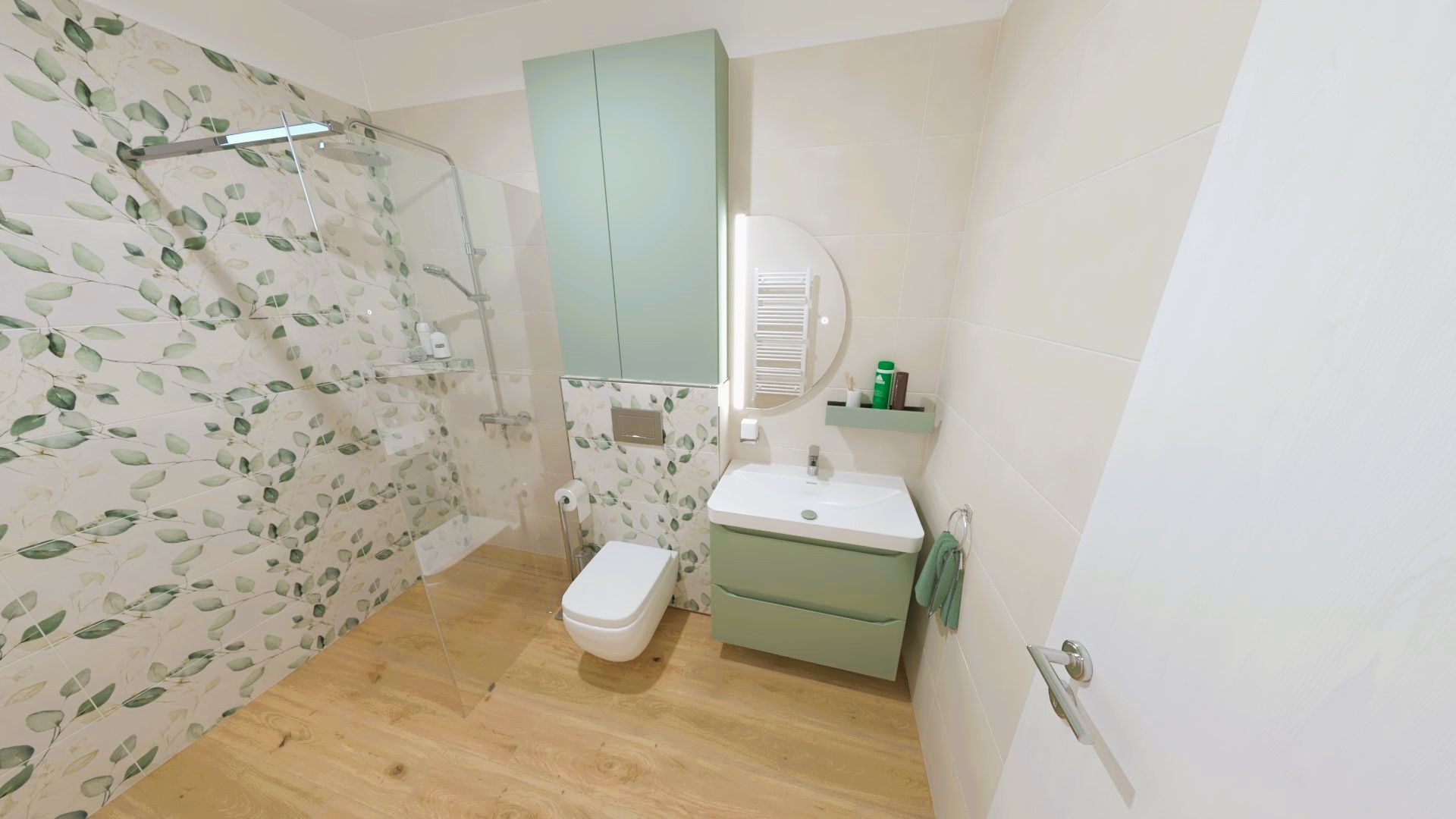 Burkolat: Flaviker Palette Mud nat. 60*120 cm; Flaviker Flow Mint satin 6*25 cm; szaniter: Méta, Hansgrohe, Radeco, Elita