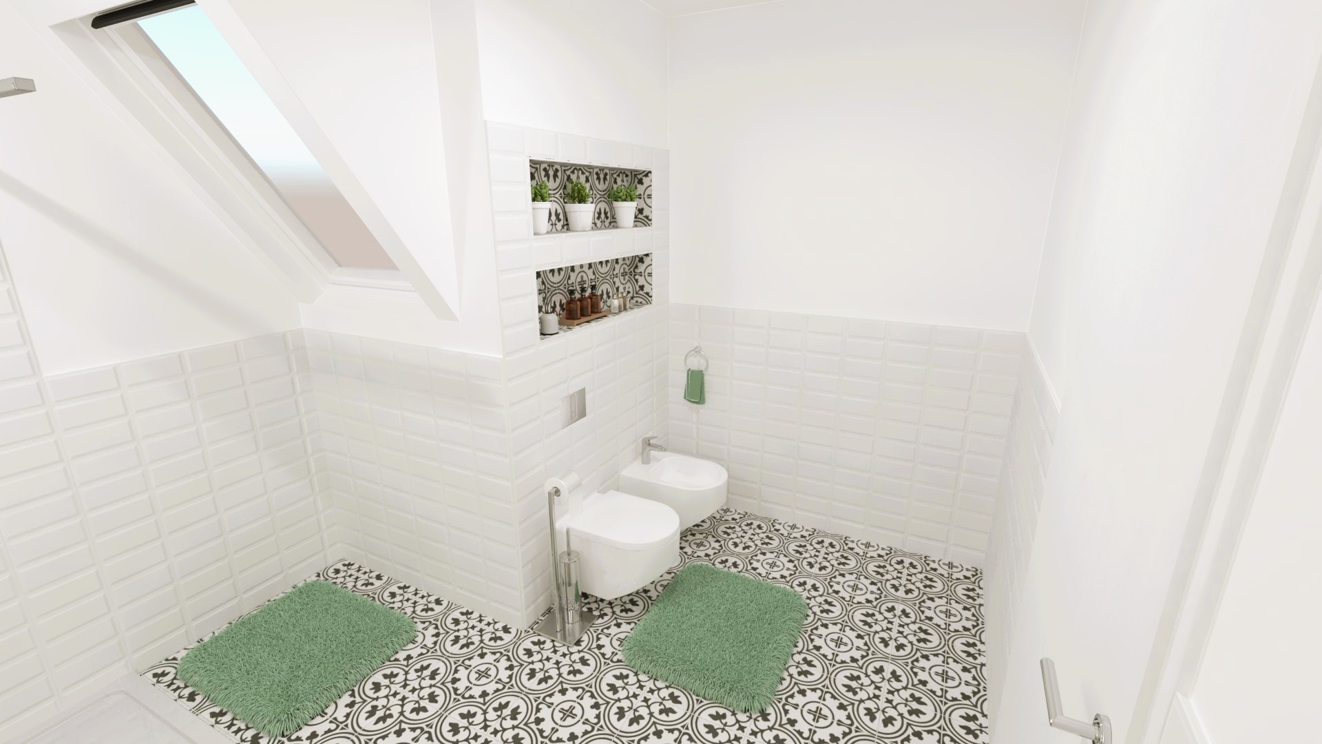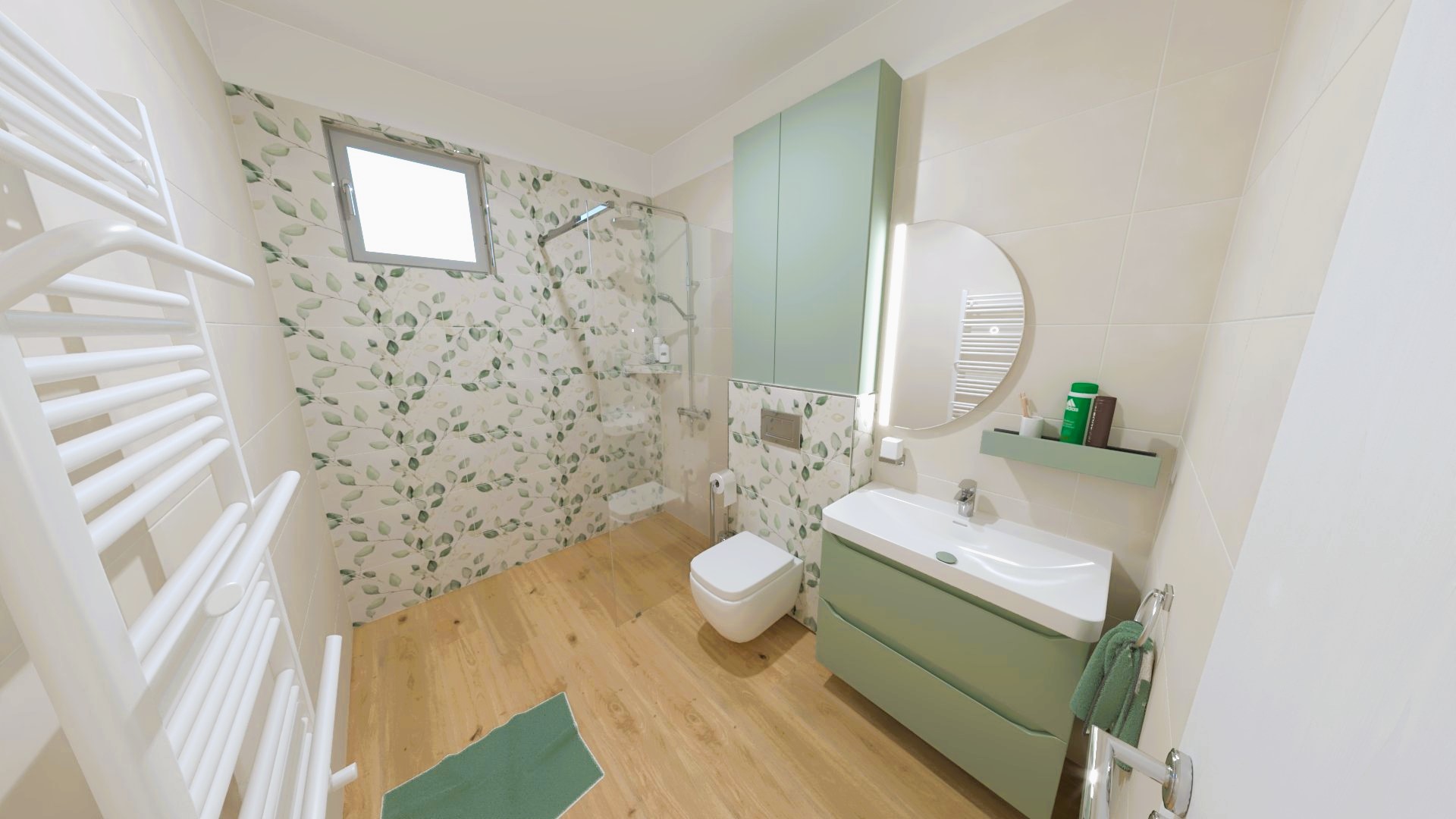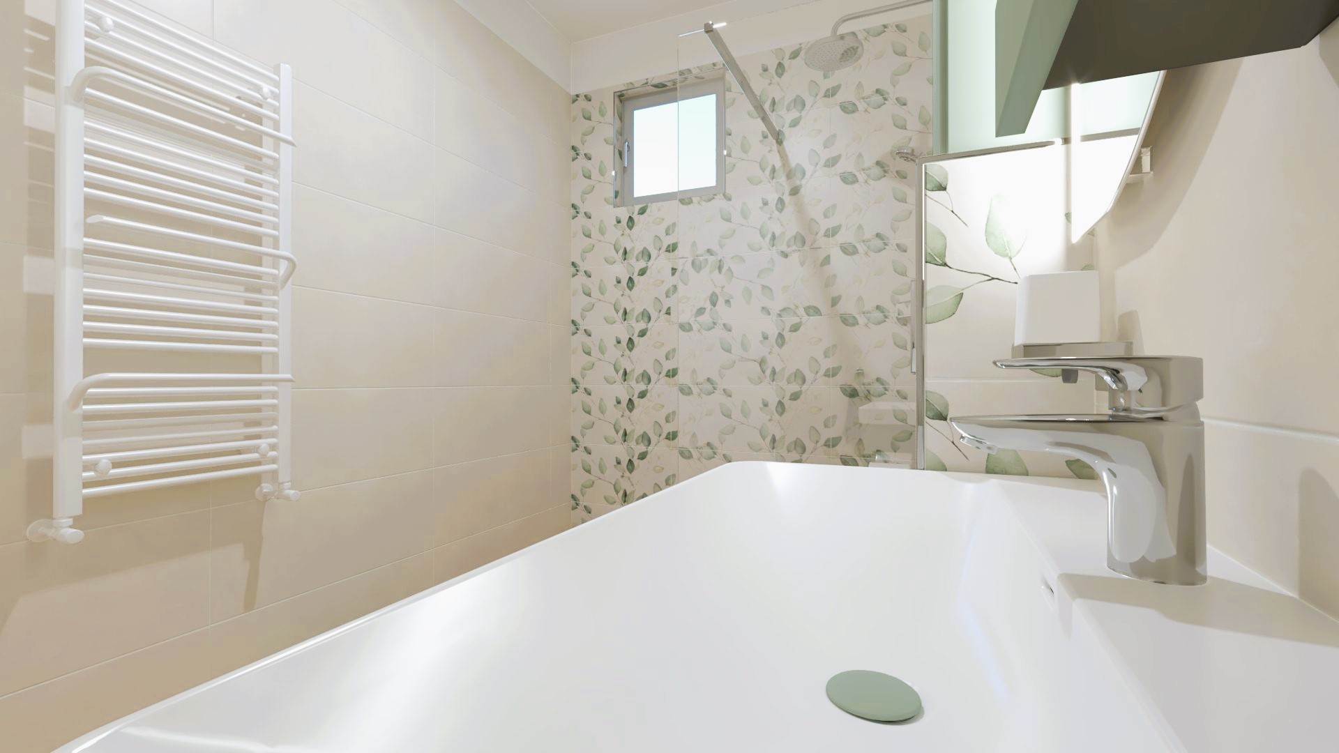 Padlólap és falburkolat a 60×120 cm FAP Ceramiche Vento Del Sud white rendelésre; Metro jellegű csempe Marca Corona 1741 Miniature Soda Verde Perla 6x24 cm(J376) KÉSZLETRŐL!!; Walk-in fal: Radaway Modo New II Walk-in; Mosdó és a bútor: Laufen Ino család; tükör : Royo/Elita 80-as Lina Led tükör; wc és bidé: Geberit Icon Square család; csaptelep: Kludi Pure&Sytle család; folyóka: Aco Comfort család; radiátor: Arezzo Cube Chrome 120×50 cm
