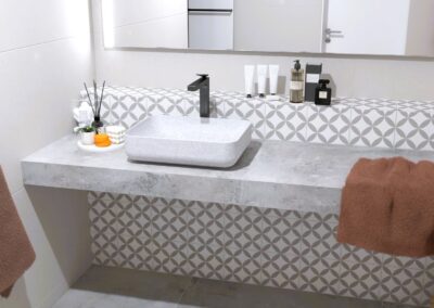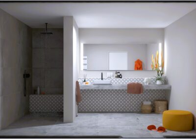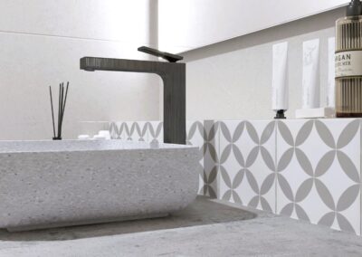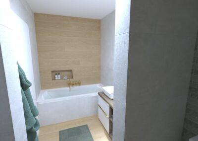 Padlólap készletről: Atlas Concorde Log Select Moon Pure 20×120 cm; falburkolat rendelésre: Cifre Alure család; csaptelepek készletről: Hansgrohe My Sport csempe család, zuhanyrendszer Crometta E Showerpipe 240 Bútor rendelésre: Royo Elita Helo 80-as Sage mat színben For All magasszekrény és Mia LED 80-as tükör Kád rendelésre: M-Acríl Sabina Pro kád 170×75-ös előlappal és oldallappal Kabin rendelésre: Radaway Torrenta 90-es KDJ 90 króm profil átlátszó üveggel; WC és bidé és nyomógomb rendelésre: Arezzo Ohio család nyomógomb Geberit króm