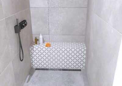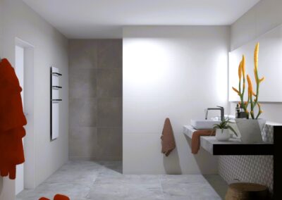 Burkolat: Flaviker rockin grey 60x60 cm, Flaviker Hedonism Dover White 120x120 cm, Flaviker Supreme memories weavig cold 60x120 cm; szaniter: Radaway, Hansgrohe, Sapho, Geberit, Elita