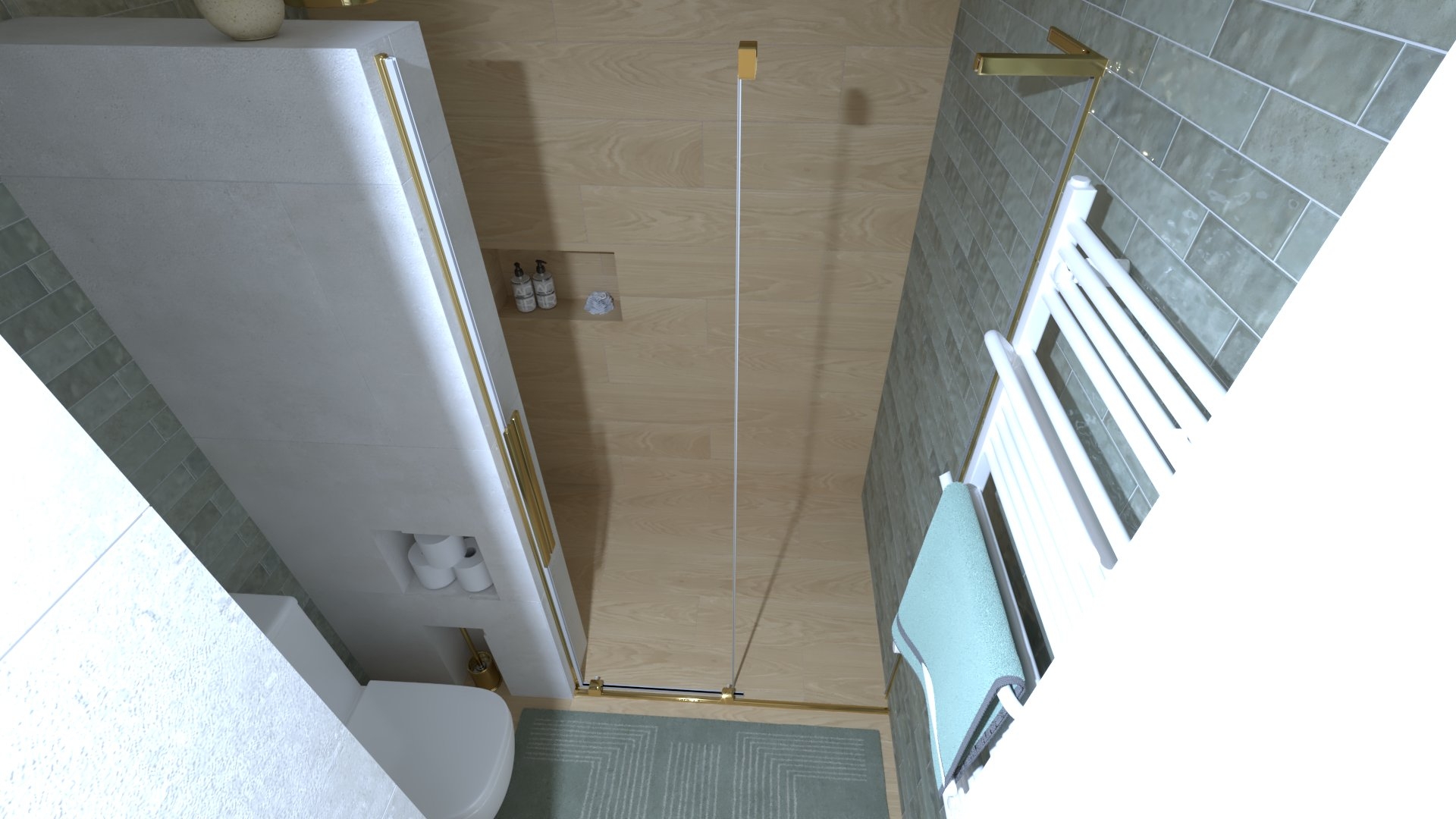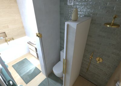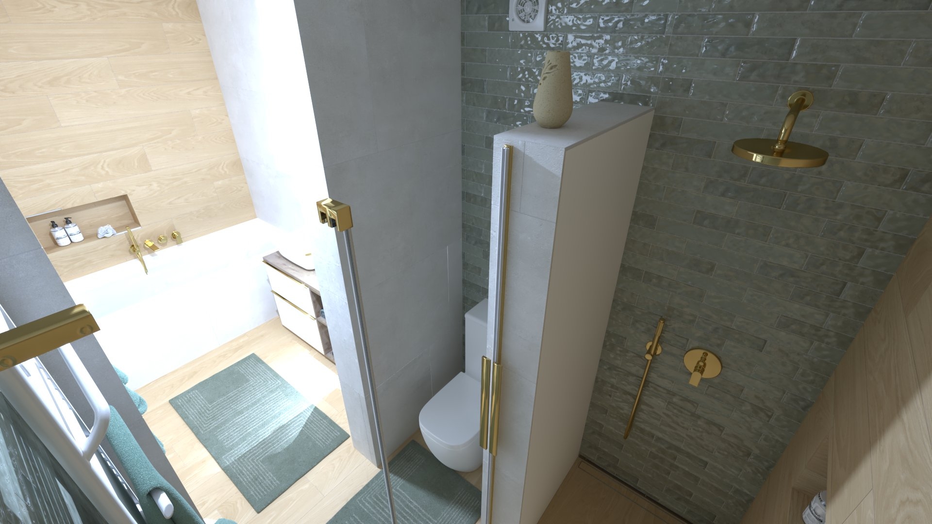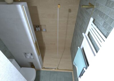Padlólap készletről: Atlas Concorde Log Select Amber Pure 20×120 cm; fahatású burkolat, falburkolat készletről: Novabell Open Bianco 60×120 cm, burkolat és Marca Corona 1741 Miniature Soda Verde Perla 6x24 cm kis csempe; bútor rendelésre: Royo Look bútor tölgy mosdópulttal arany foganttyúval, Reni fehér mosdóval, Diamont 45-ös tükörrel LED világítással arany kerettel; csaptelepek rendelésre: Bugnatese Simple család arany színben; WC rendelésre: Arezzo Ohio monoblokkos WC ; Radiátor rendelésre: Arezzo Smart White 50×120 cm; folyóka készletről: Aco Comfort burkolható folyóka