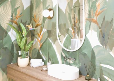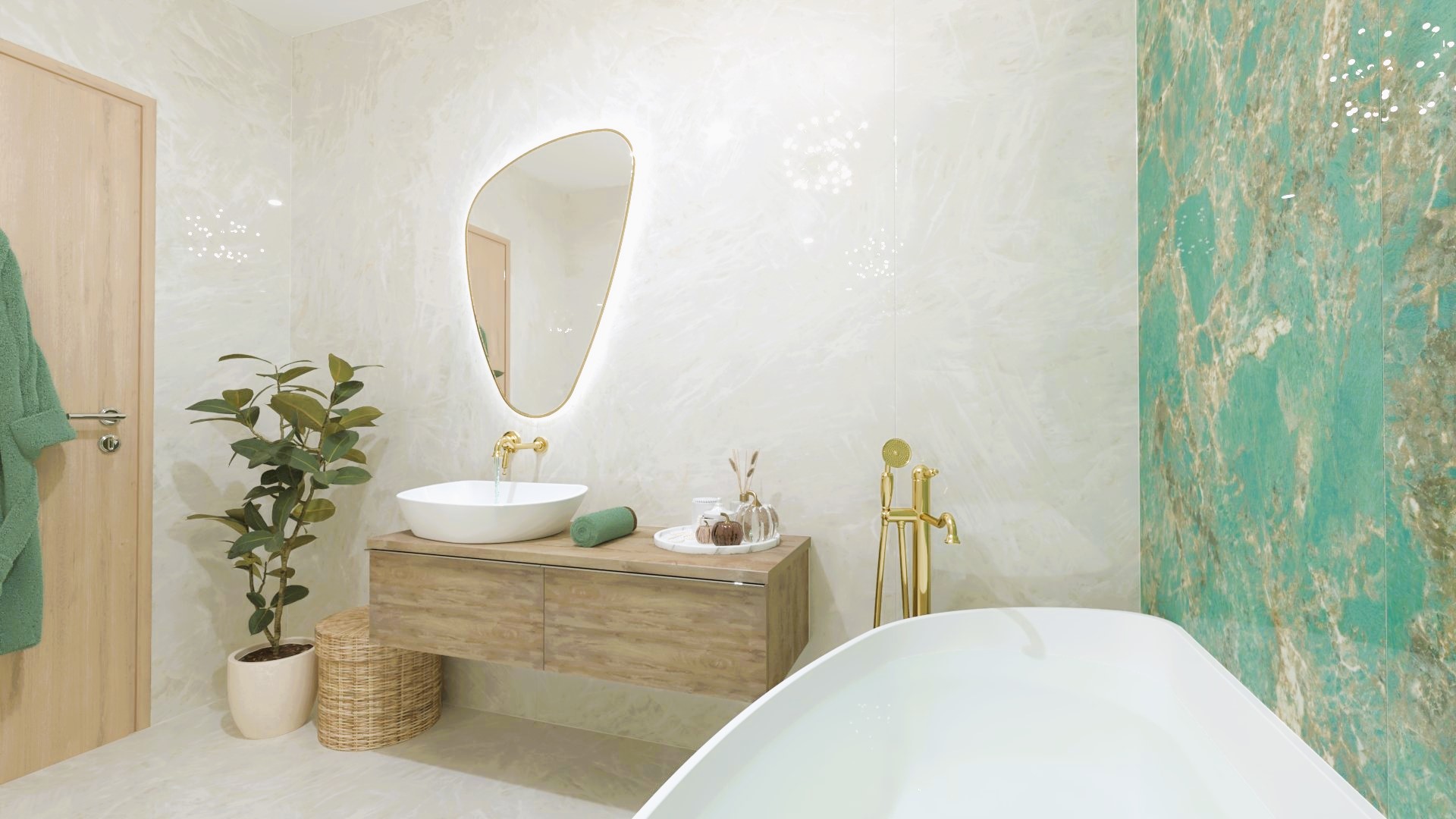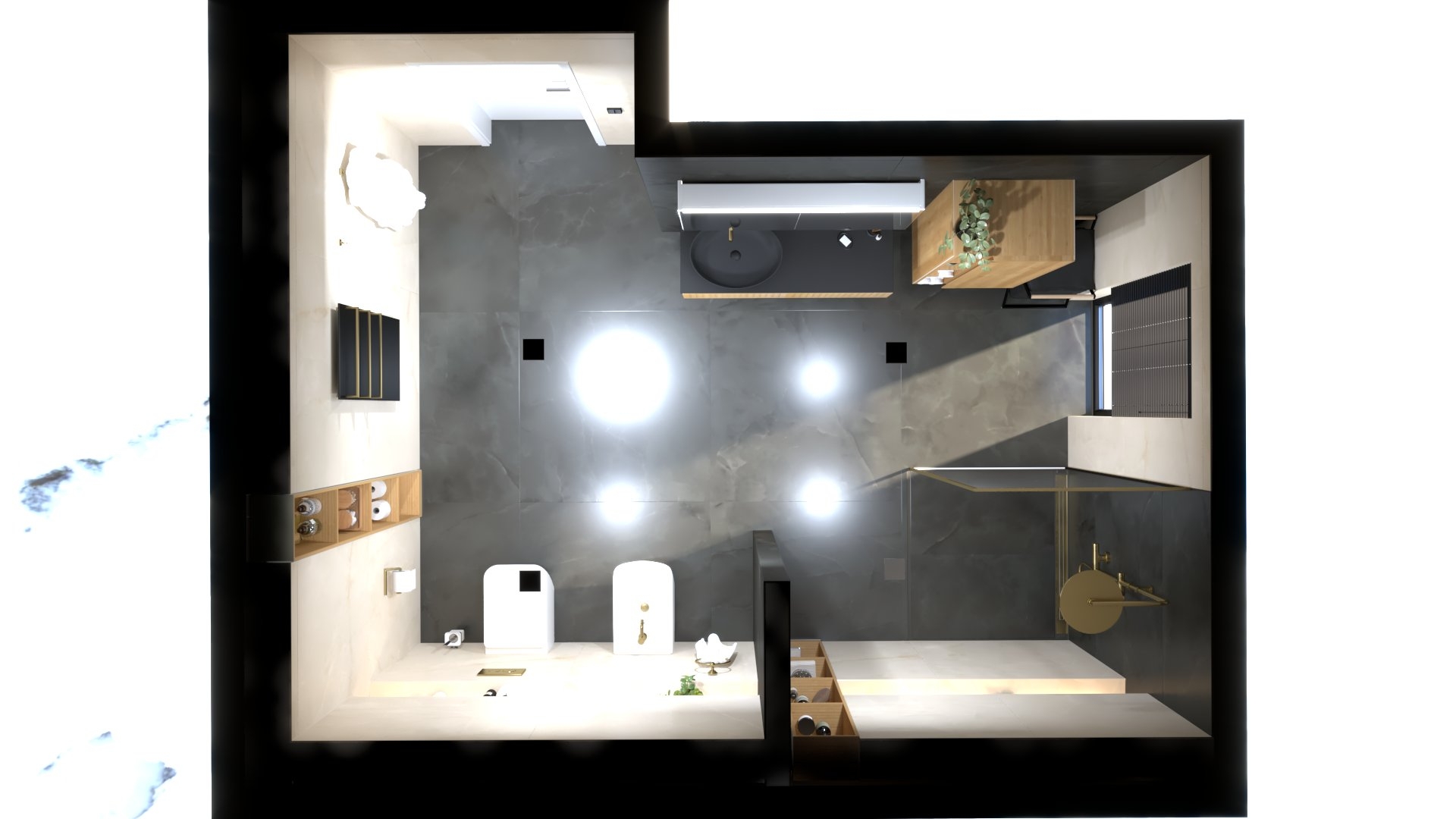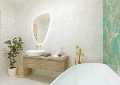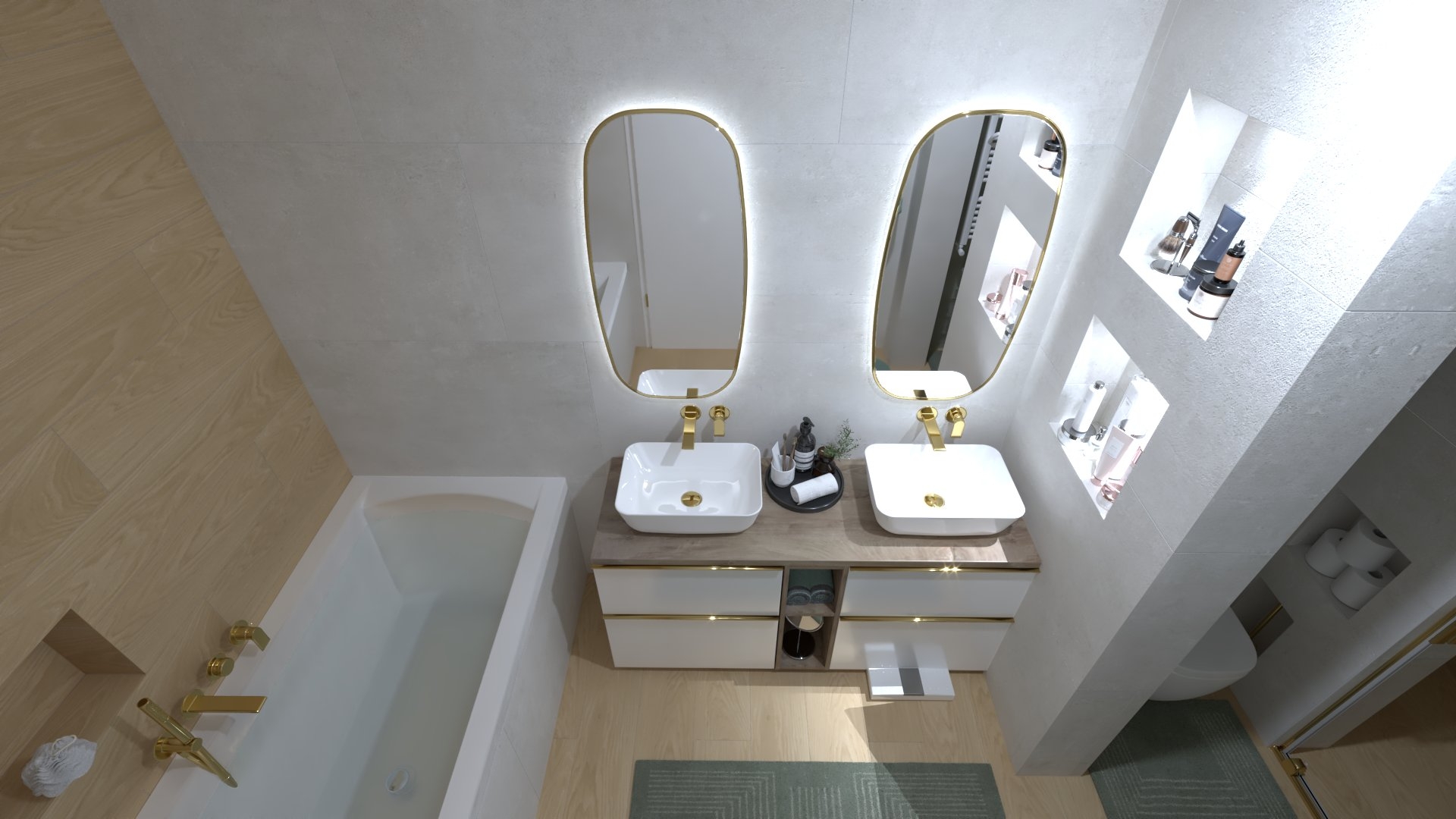 Padlólap készletről: Atlas Concorde Log Select Amber Pure 20×120 cm; fahatású burkolat, falburkolat készletről: Novabell Open Bianco 60×120 cm, burkolat és Marca Corona 1741 Miniature Soda Verde Perla 6x24 cm kis csempe; bútor rendelésre: Royo Look bútor tölgy mosdópulttal arany foganttyúval, Reni fehér mosdóval, Diamont 45-ös tükörrel LED világítással arany kerettel; csaptelepek rendelésre: Bugnatese Simple család arany színben; WC rendelésre: Arezzo Ohio monoblokkos WC ; Radiátor rendelésre: Arezzo Smart White 50×120 cm; folyóka készletről: Aco Comfort burkolható folyóka