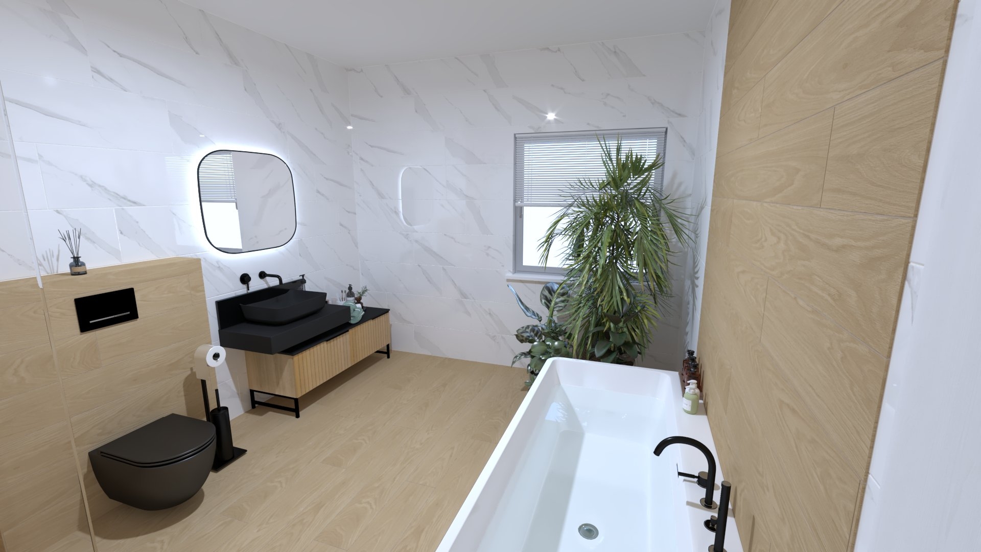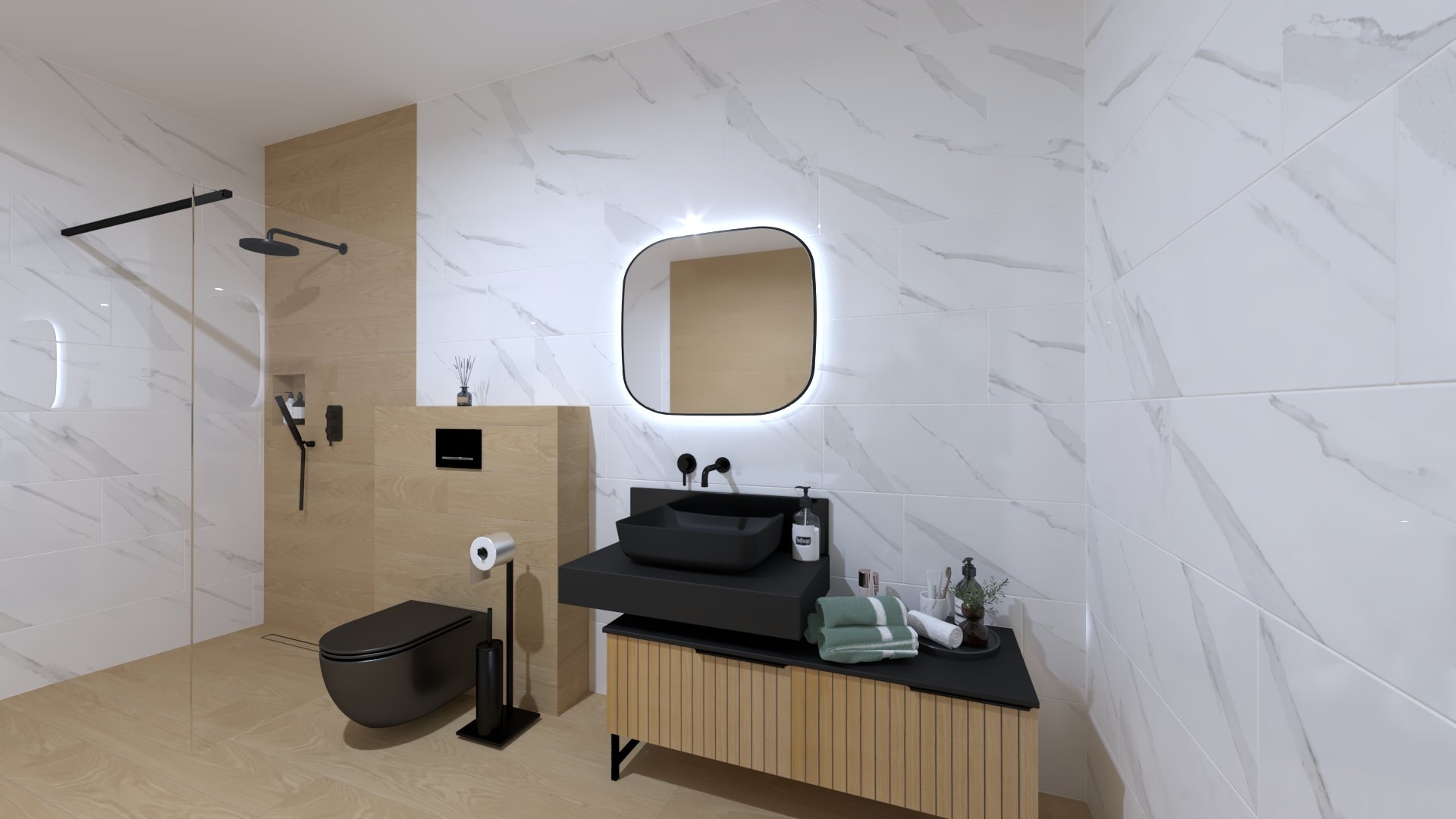Burkolat fahatás: Atlas Concorde Log Selec Moon 20×120 cm padlólap; márványmintás csempe: Geotiles Asaro Blanco 30×90 cm; csaptelepek: Bugnatese Kubuk család matt fekete színben; bútor rendelésre: Royo Asami család, fekete Elitstone pulttal Reni fekete mosdóval, fekete Led tükörrel; WC rendelésre: Arezzo Arizona fekete wc+ ülőke, tartály + nyomógomb: Geberit Sigma nyomógomb fekete, Duofix tartállyal ; Walk-in rendelésre: Radaway Modo Walk-in fekete; kád rendelésre: Arezzo Florida 170 féltérben álló kád ; radiátor rendelésre: Arezzo Smart Black 120×50 cm