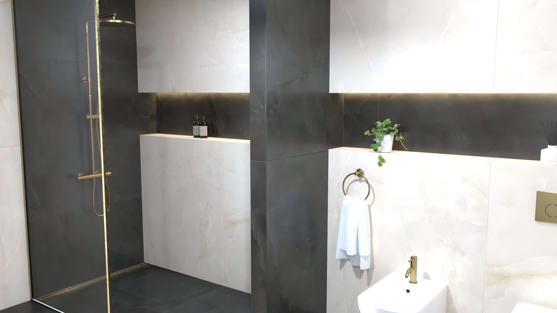 Burkolat: Atlas Concorde Marvel Onyx pearl 60×120 cm fényes; Bútor, tükör: Elita/Royo Look matt fekete család; fekete márványpult 120×80 cm matt fekete keretes tükör; mosdó: Reni bicolor fekete fehér színben; csaptelepek: Kludi Balance fekete család; A-QA fekete fejzuhany; zuhanyajtó: Radaway Furo SL 120 Walk-in ajtó matt fekete; wc bidé: Arezzo Arizona család fekete család; WC tartály: Geberit Duofix + Sigma tartály