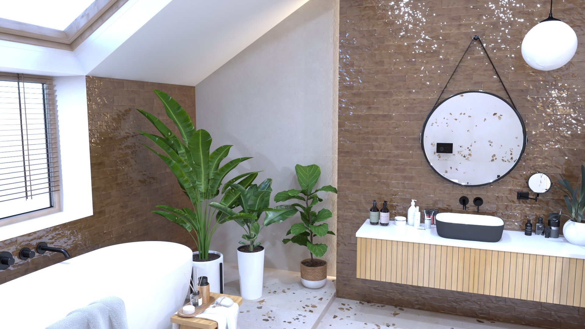 Burkolat: Fap Oxide család; WC bidé: Laufen Sonar család; csaptelep: Bugnatese Kobuk króm család; kád: M-acryl Zen térben álló kád; bútor rendelésre: Royo Look család; Caneala tölgy színben