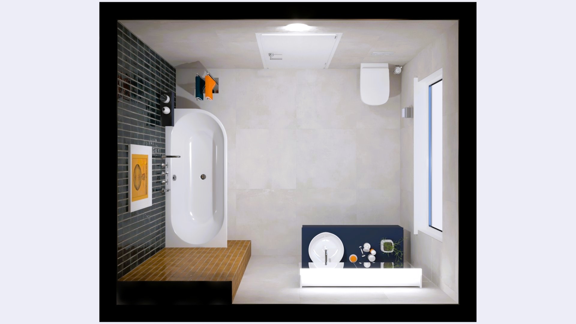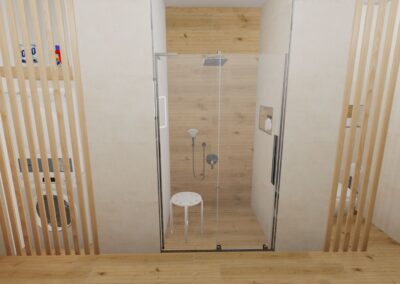 Burkolat rendelésre: fahatás Ragno Inedito 20×120 cm, türkiz Ragno Look 6×24 cm, fehér Ragno Vida 90×30 cm; bútor rendelésre: Royo Look Antracit család; tükör Led Sharon 65/100-as; mosdó rendelésre: Arezzo Atlanta; WC rendelésre: Arezzo ohio; zuhanyfülke + tálca rendelésre: Radaway Torenta KDJ 90-es króm átlátszó kabin tálca Giaros C 90-es tálca Radiátor rendelésre: Arezzo Cube Chrome 120×50-es radiátor; Csaptelepek rendelésre: Kludi Balance fekete/króm család.