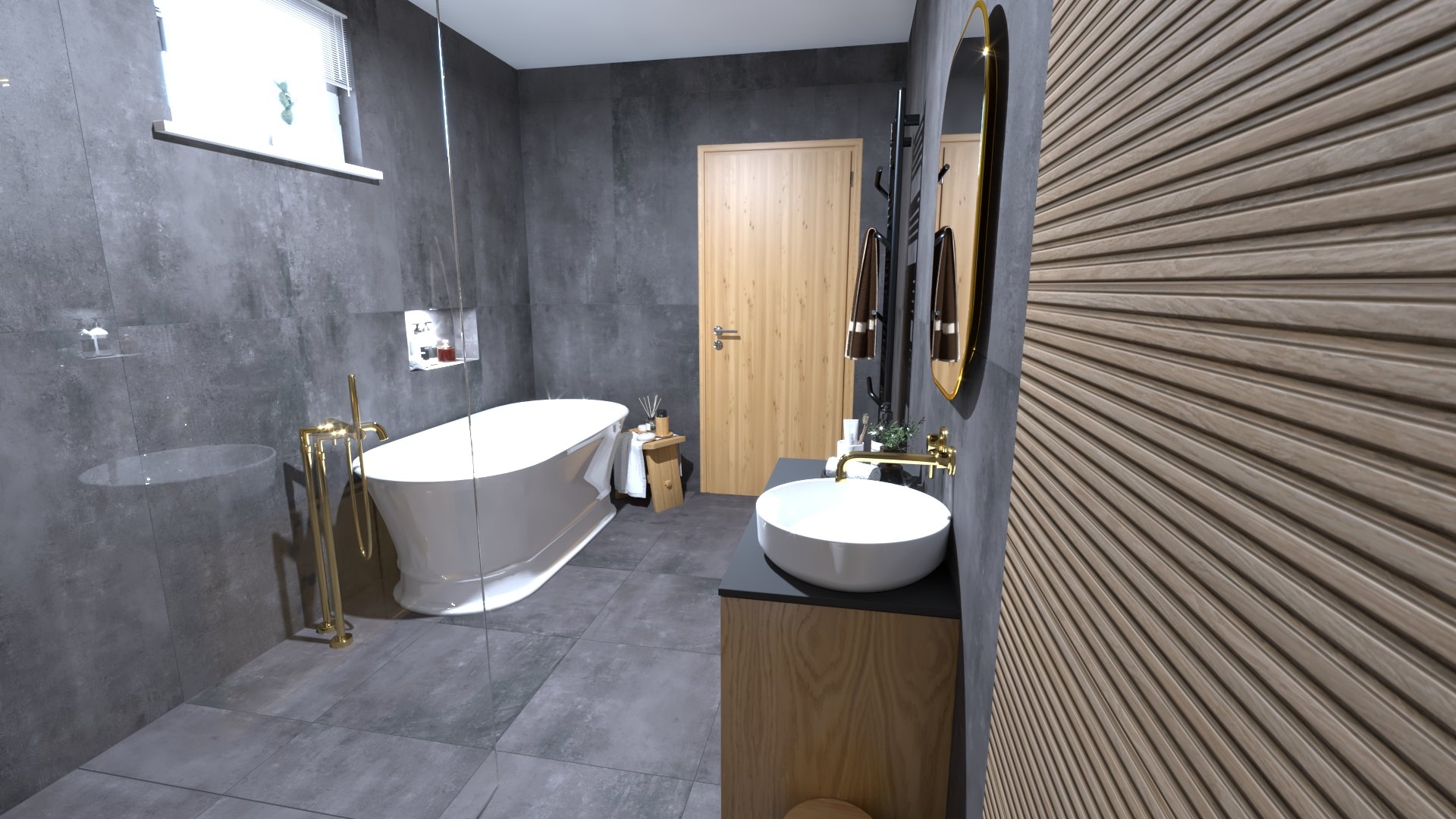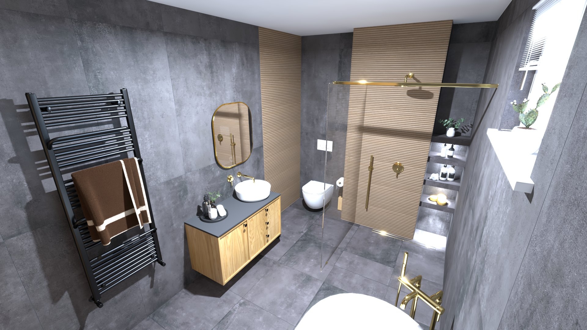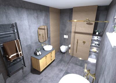 Burkolat rendelésre: Novabell OPEN Nero 60×120 cm , 60×60-as padlólap a fahatás Ragno Richmond család 100×30 cm; WC rendelésre: Geberit Icon WC , Sigma nyomógomb fehér-arany ; csaptelepek rendelésre: Bugnatese Kubuk család arany színben Zuhanyfal rendelésre: Radaway Modo Walk-in arany profillal Folyóka rendelésre: Arezzo arany burkolható folyóka Bútor rendelére: Royo Leacy 100-as bútor, Lorca mosdóval Led Sharon arany keretes tükörrel Radiátor rendelésre: Arezzo Smart Black 120×50-es Kád rendelésre: Polysan Delonix 170×84 cm öntött márvány térbenálló kád; kiegészítők rendelésre: SAPHO Bamboom család