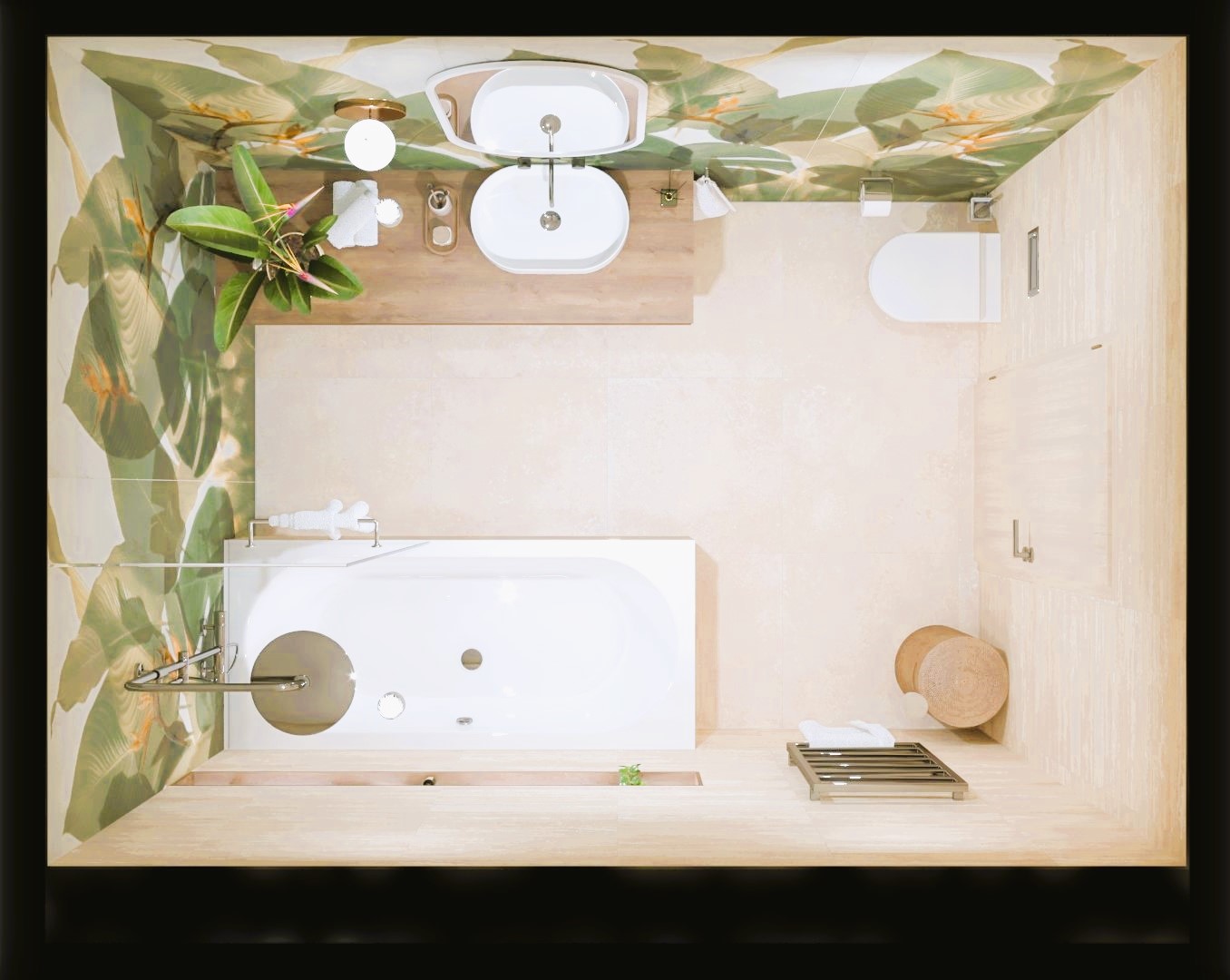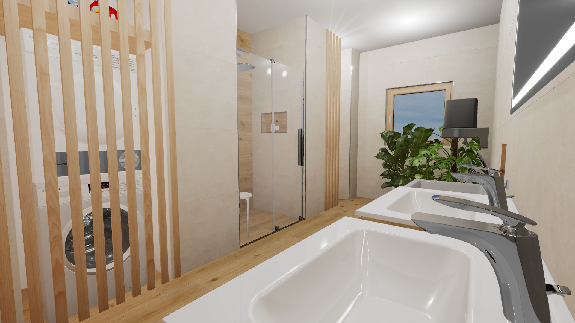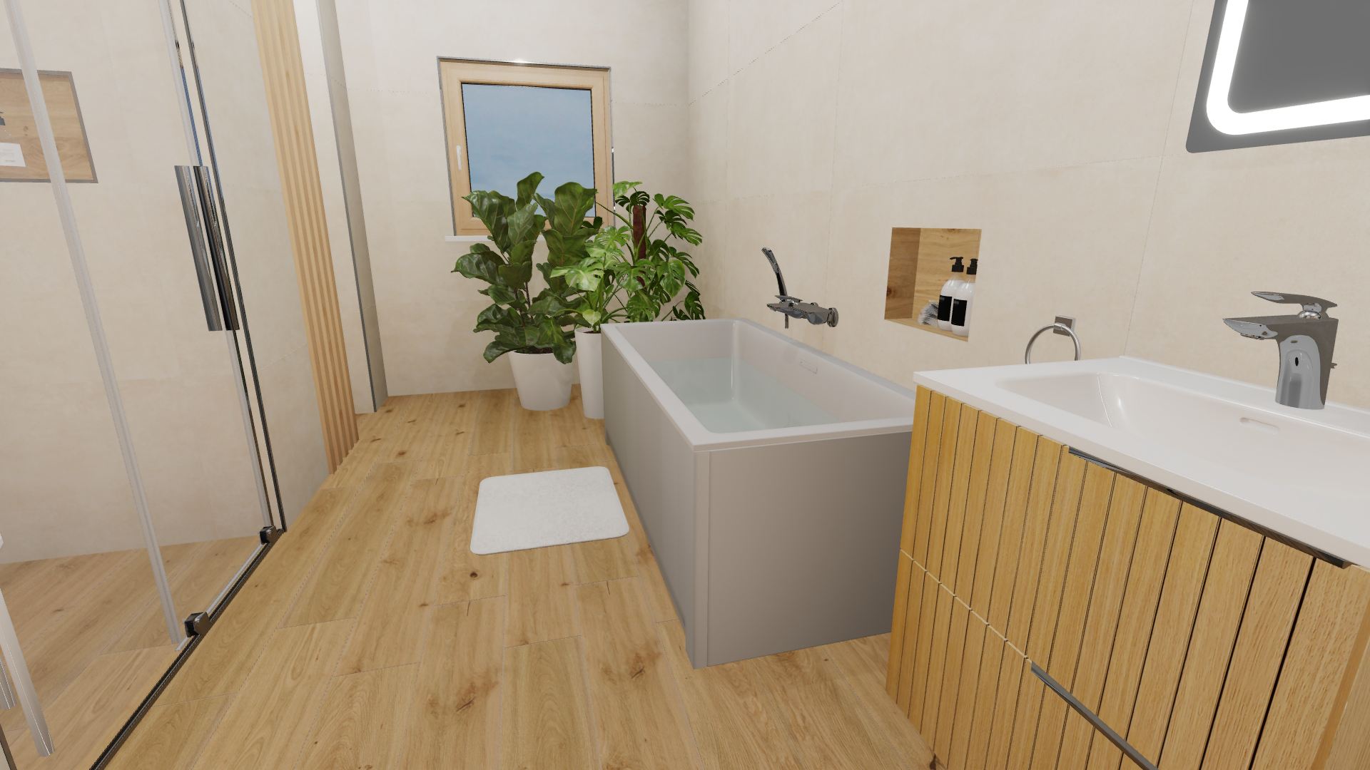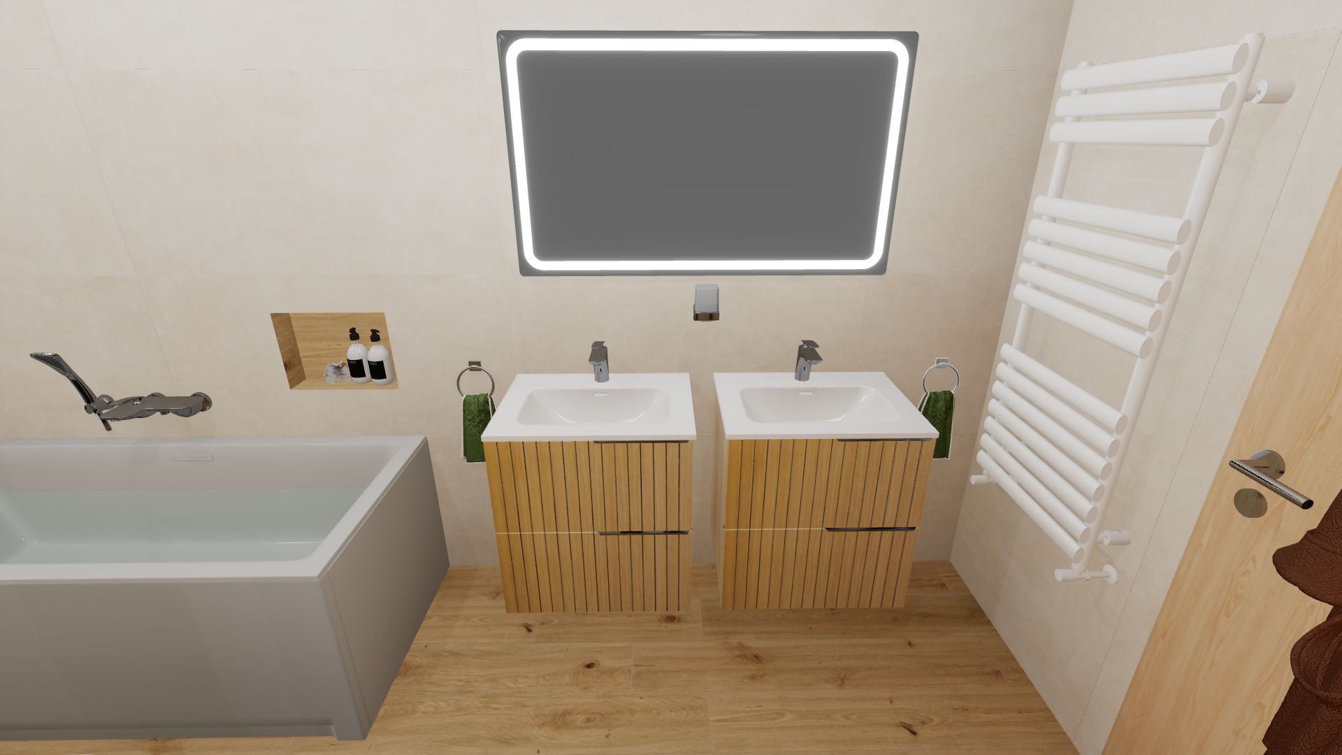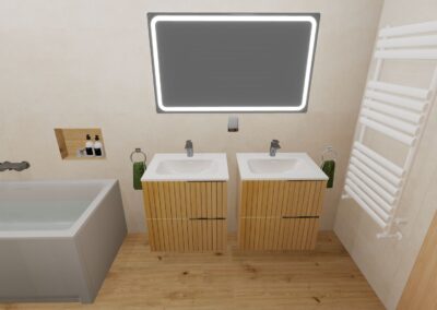 Burkolat készletről: Novabell Open 60×120 cm Avana; a fahatás Atlas Log Icon 20×120 cm; kád rendelésre: M-acryl Sabrina Pro Slim kád 170×75-ös Zuhanyajtó rendelésre: Radaway Furo SL-DWJ króm Bútor rendelésre: Royo Asami család Skappa 60-as mosdó 120-as Mia LED tükör ; csaptelepek rendelésre: Kludi Balance króm család; WC rendelésre: Arezzo Ohio