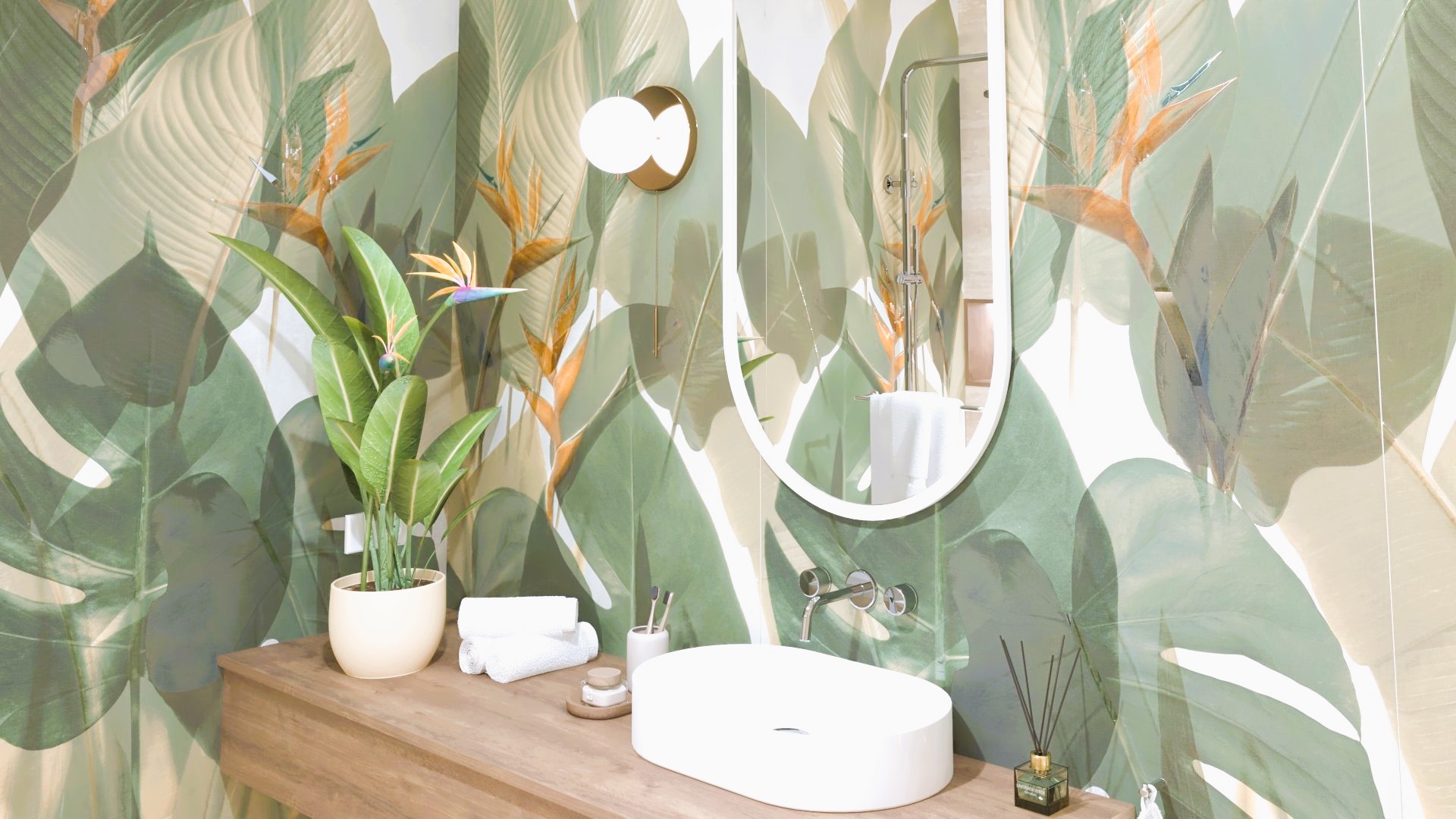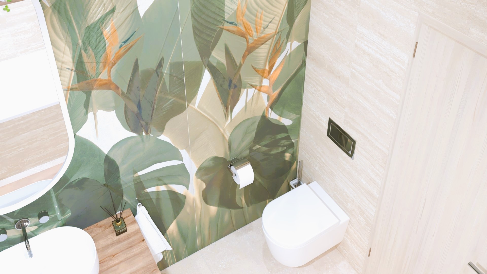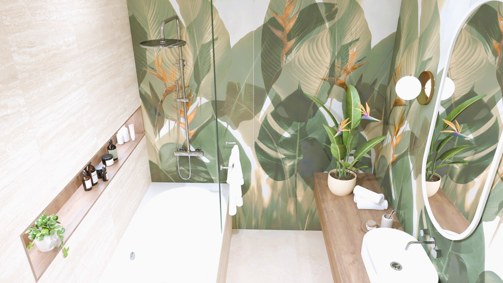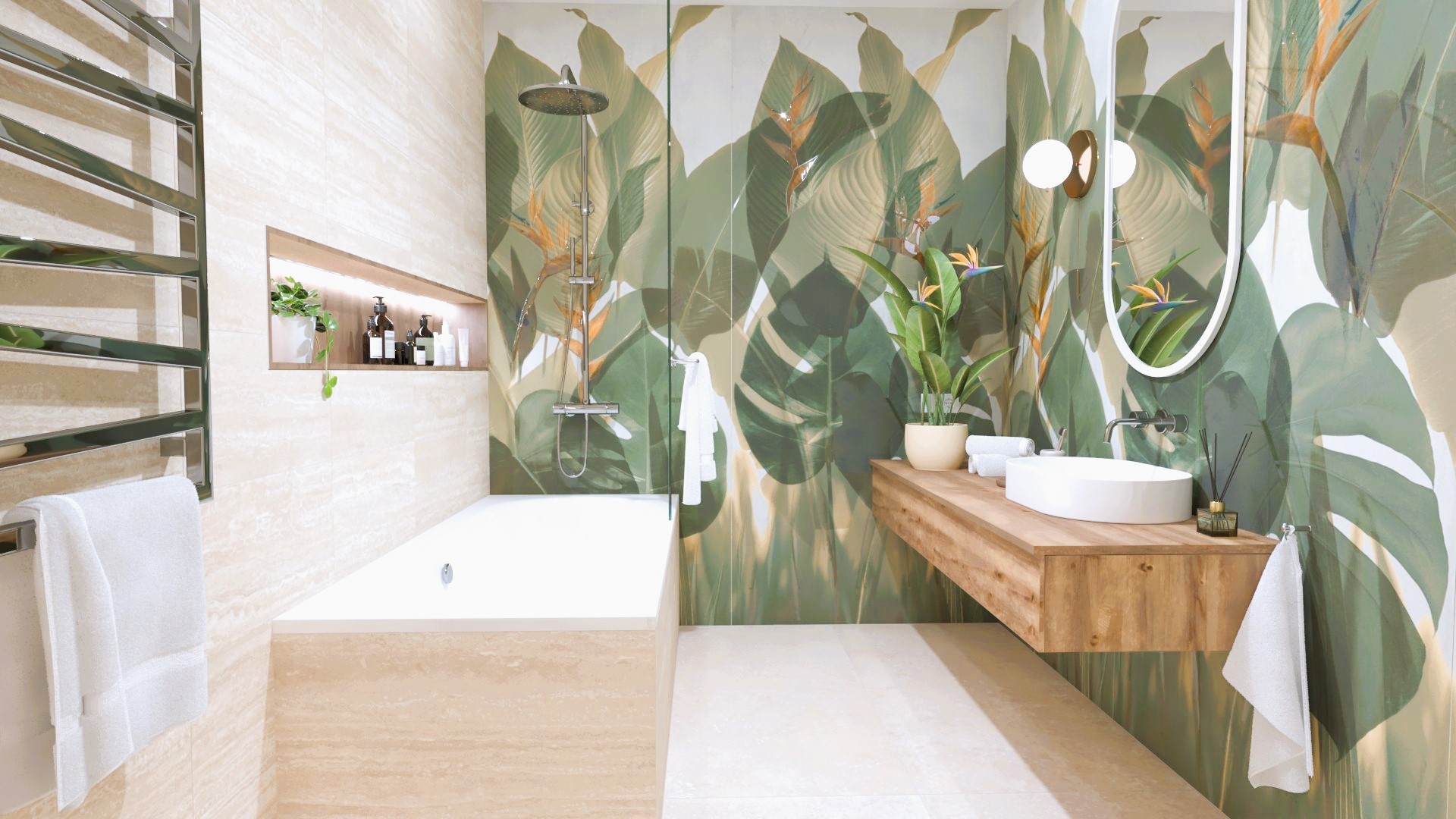 Burkolat készletről: Novabell Open 60×120 cm Avana; a fahatás Atlas Log Icon 20×120 cm; kád rendelésre: M-acryl Sabrina Pro Slim kád 170×75-ös Zuhanyajtó rendelésre: Radaway Furo SL-DWJ króm Bútor rendelésre: Royo Asami család Skappa 60-as mosdó 120-as Mia LED tükör ; csaptelepek rendelésre: Kludi Balance króm család; WC rendelésre: Arezzo Ohio